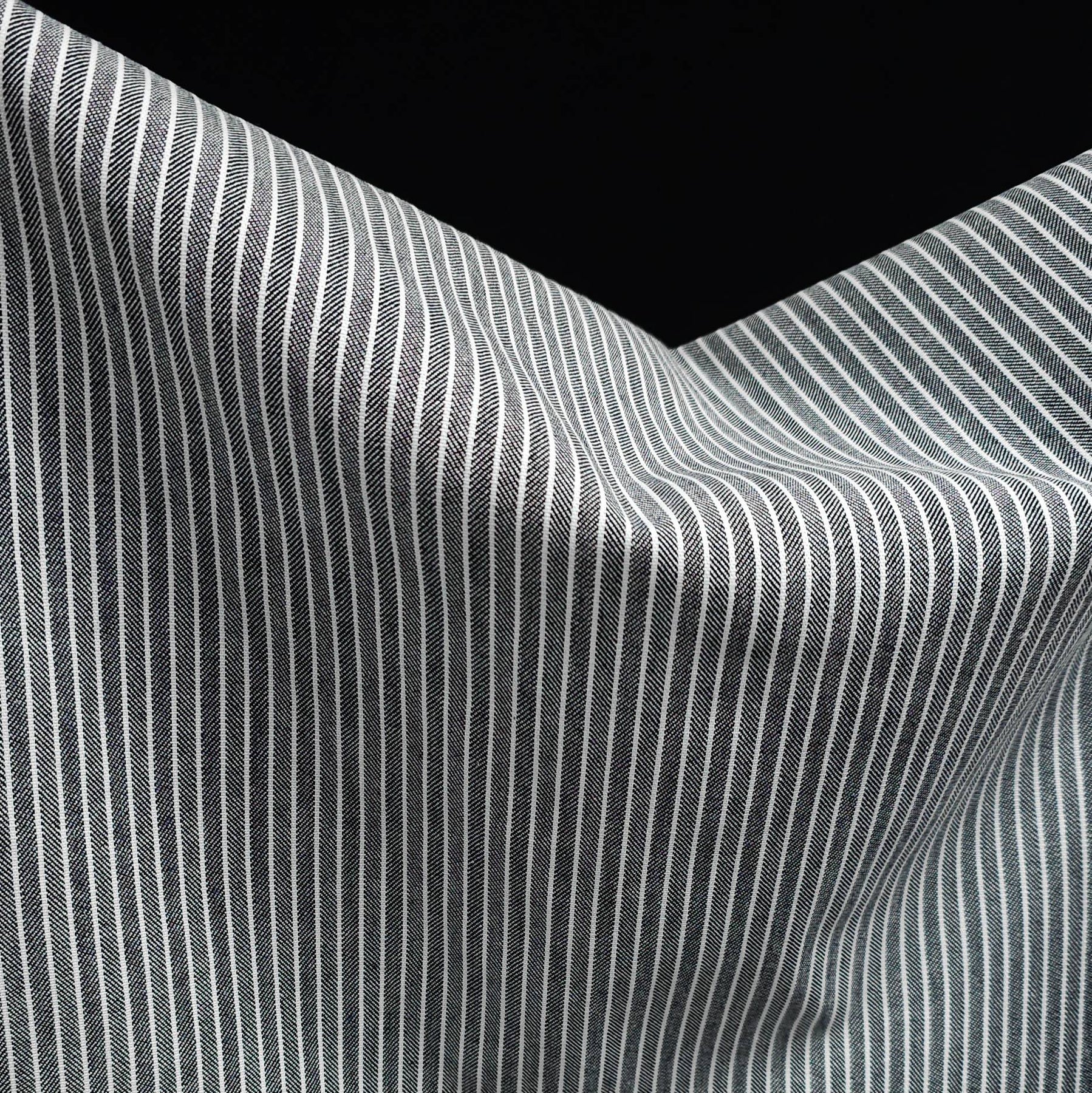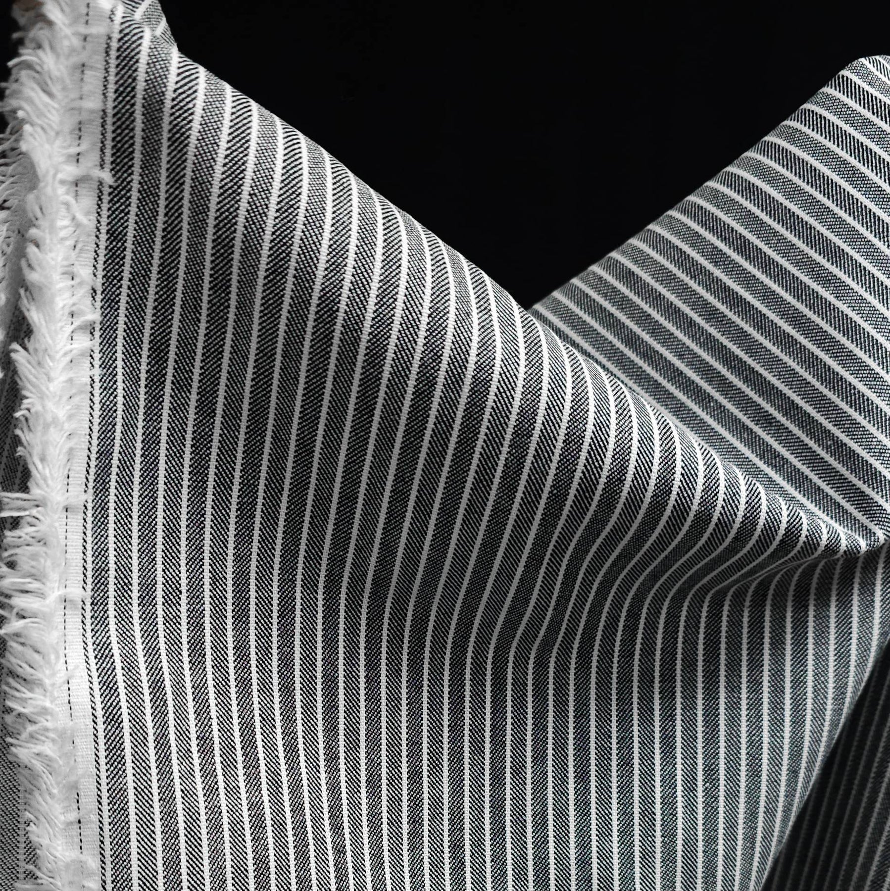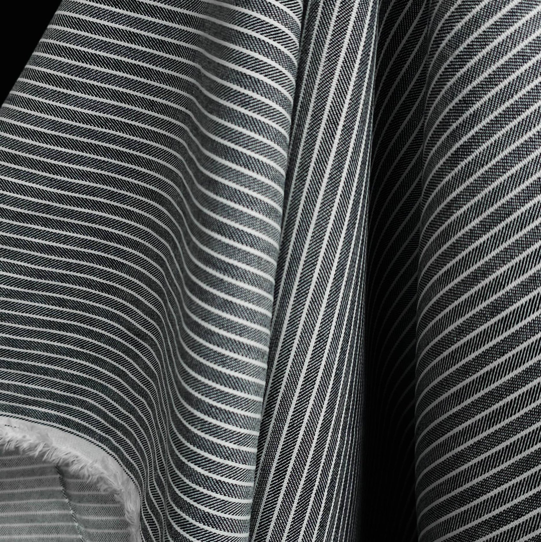 The combination of classic stripe and herringbone texture gives this fabric a timeless, elevated look—perfect for modern wardrobe staples.
