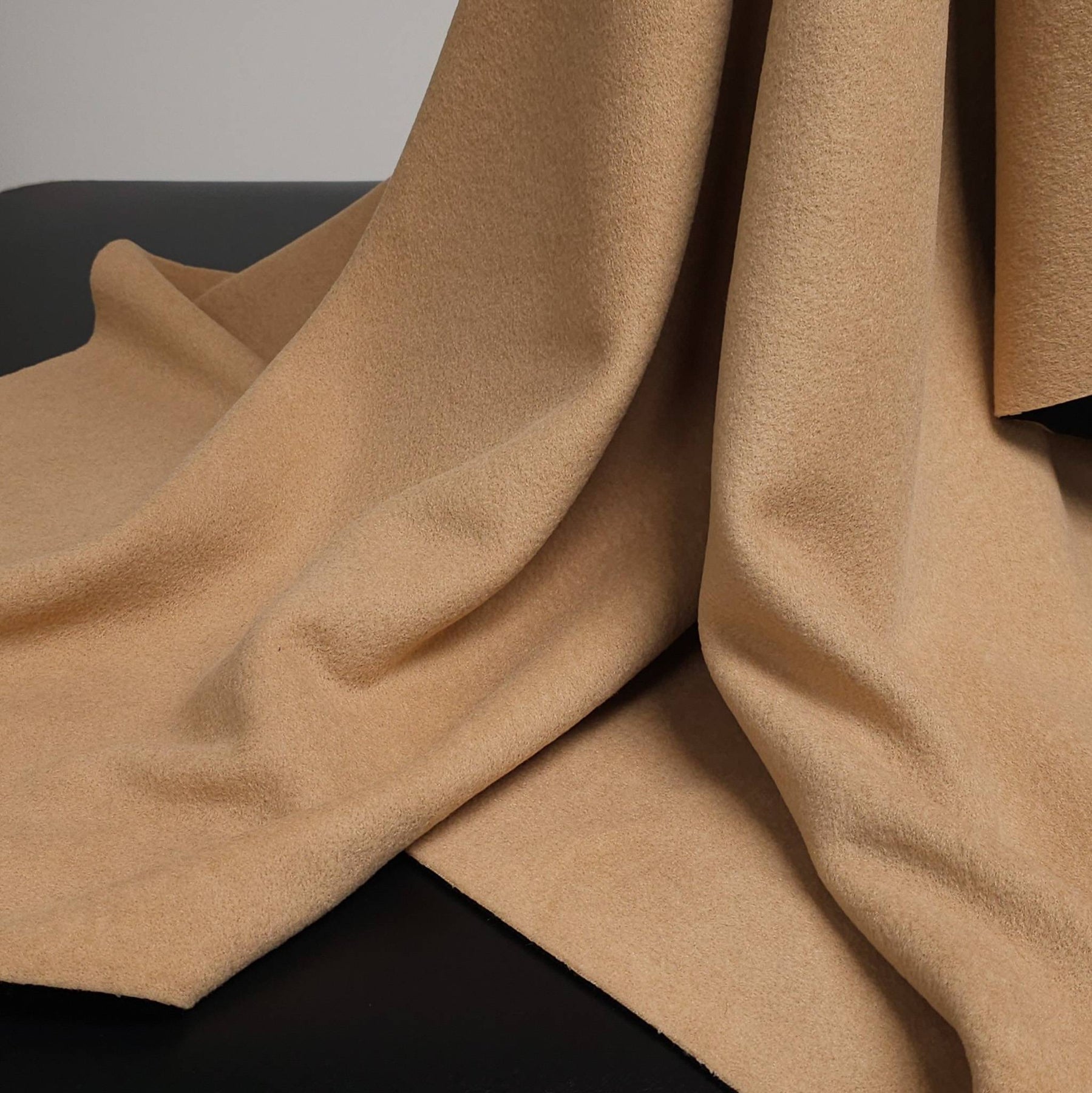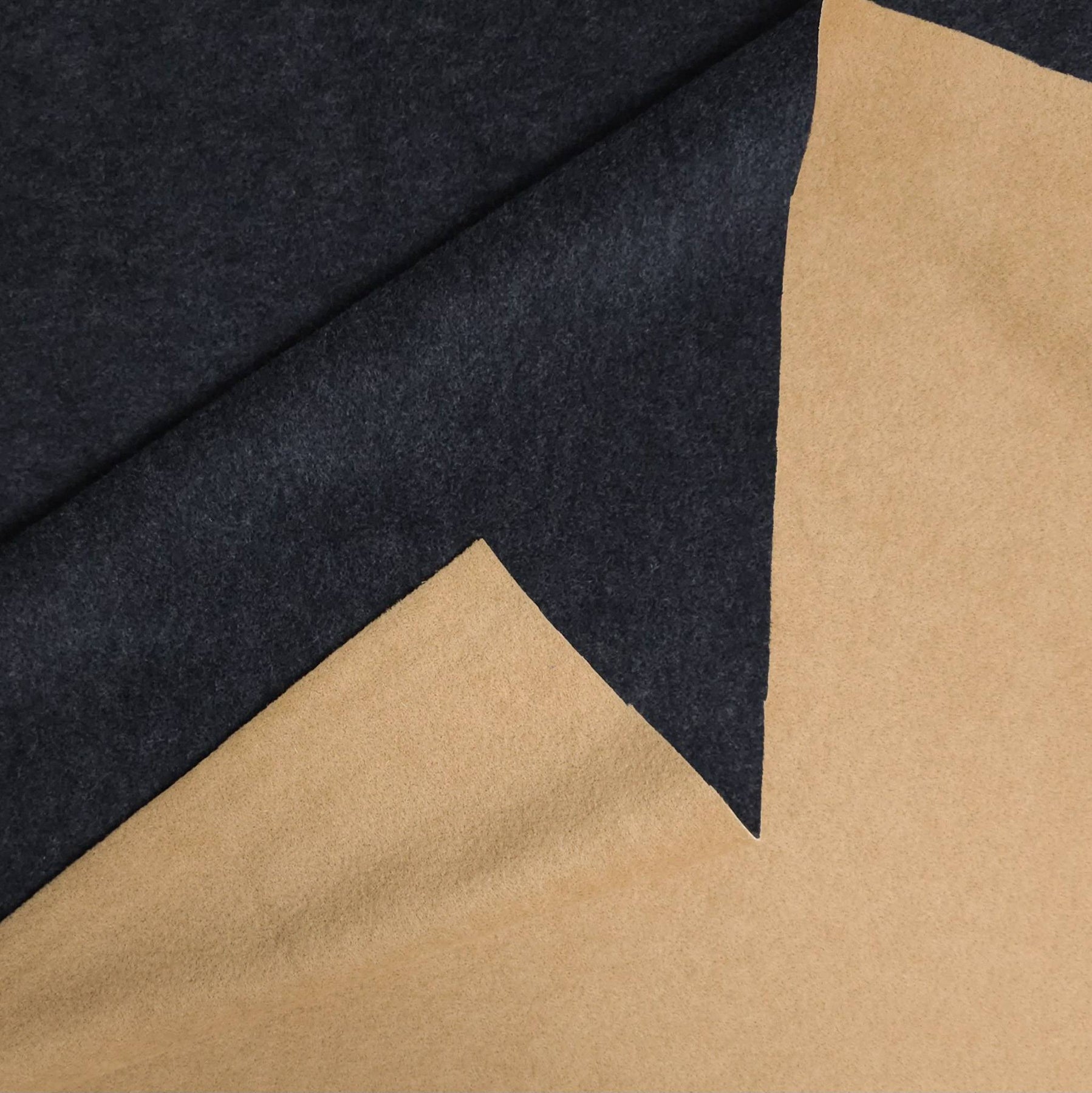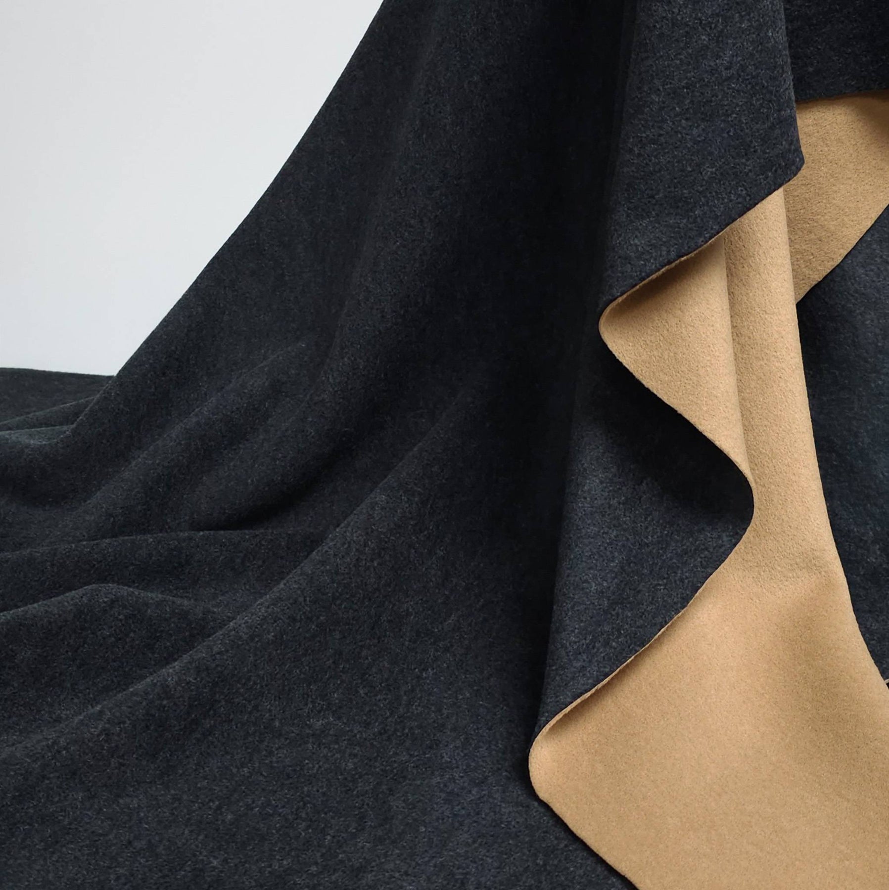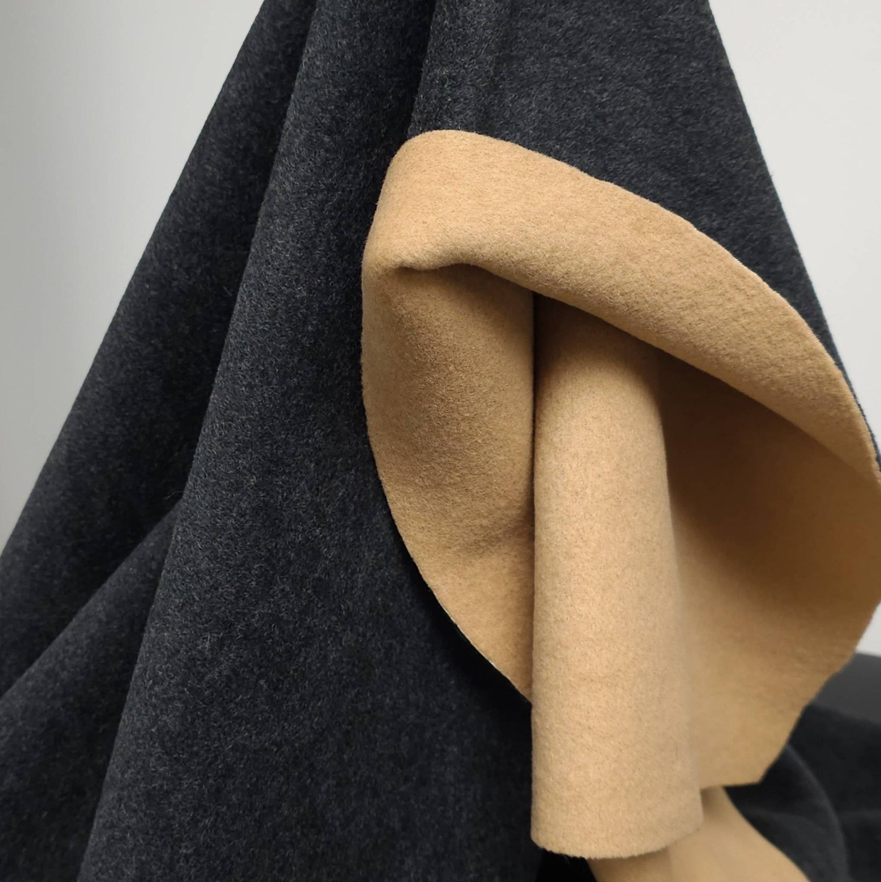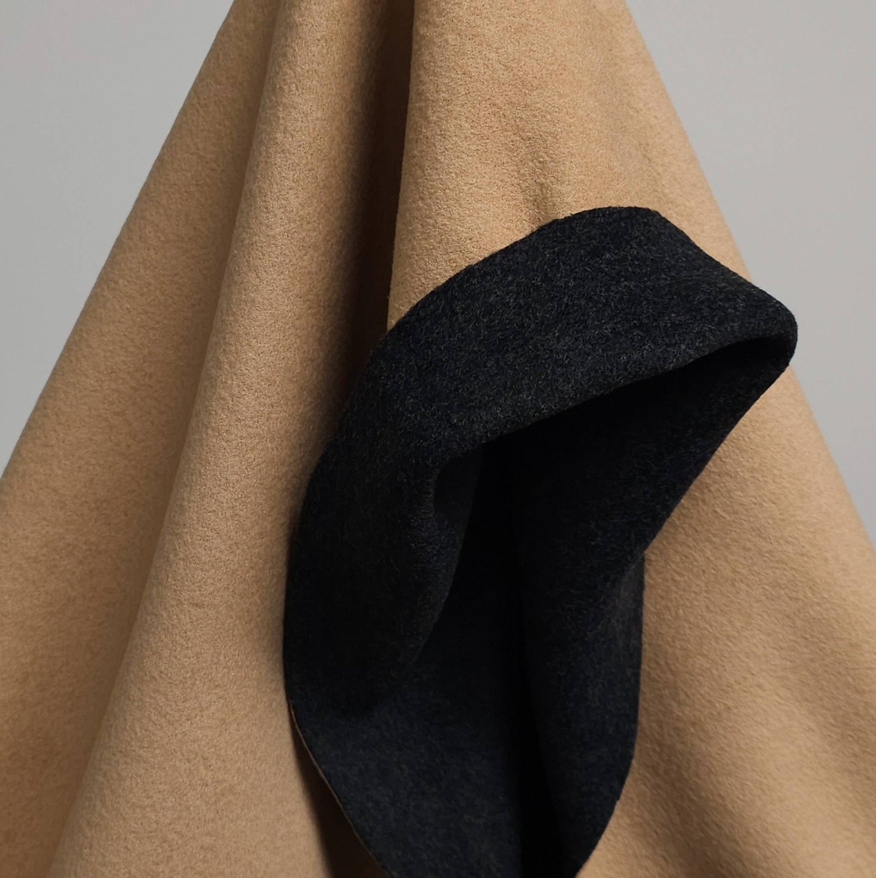 This reversible 100% wool coating fabric pairs a warm camel face with a deep charcoal reverse, offering versatility and refined contrast in a single textile.