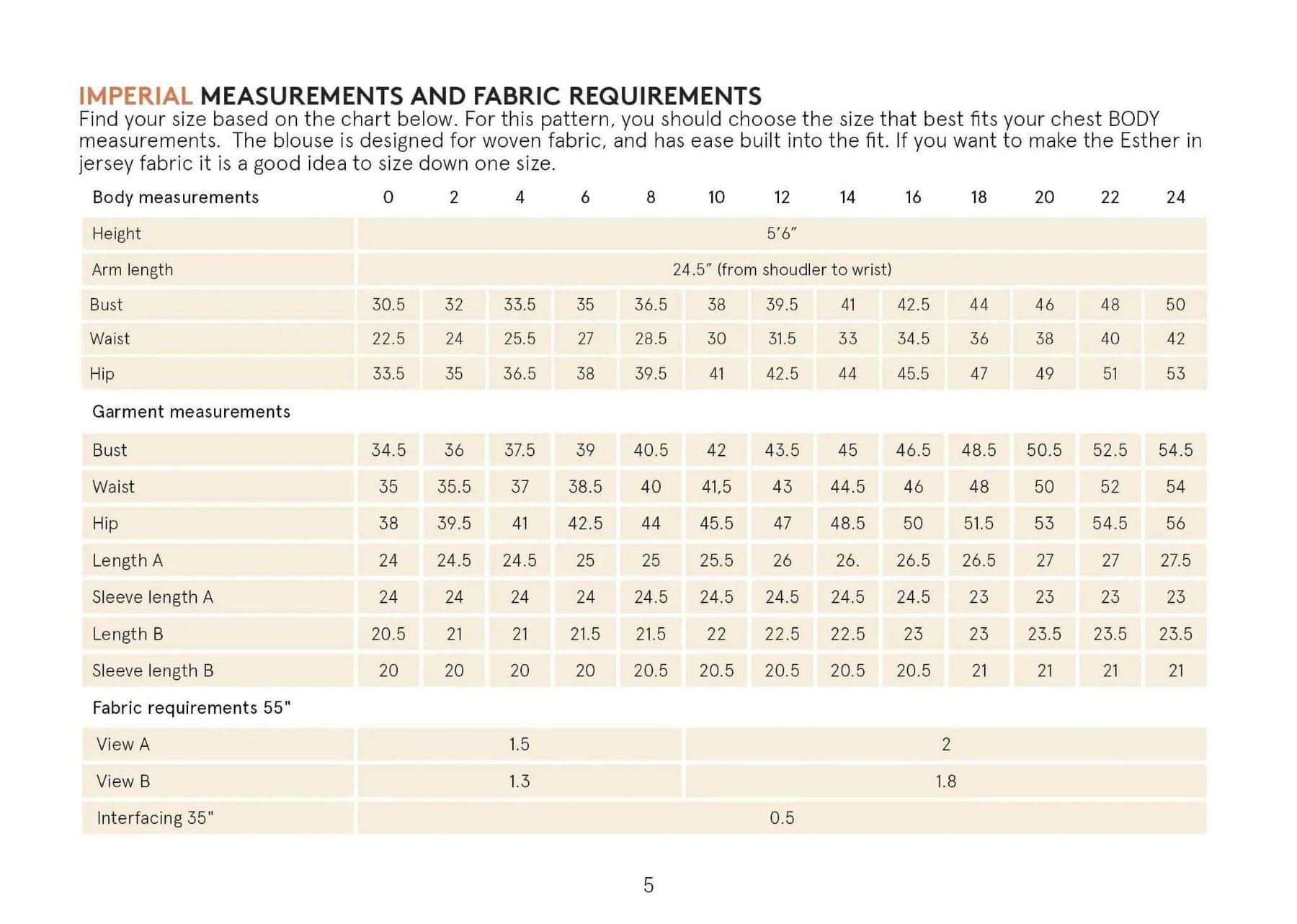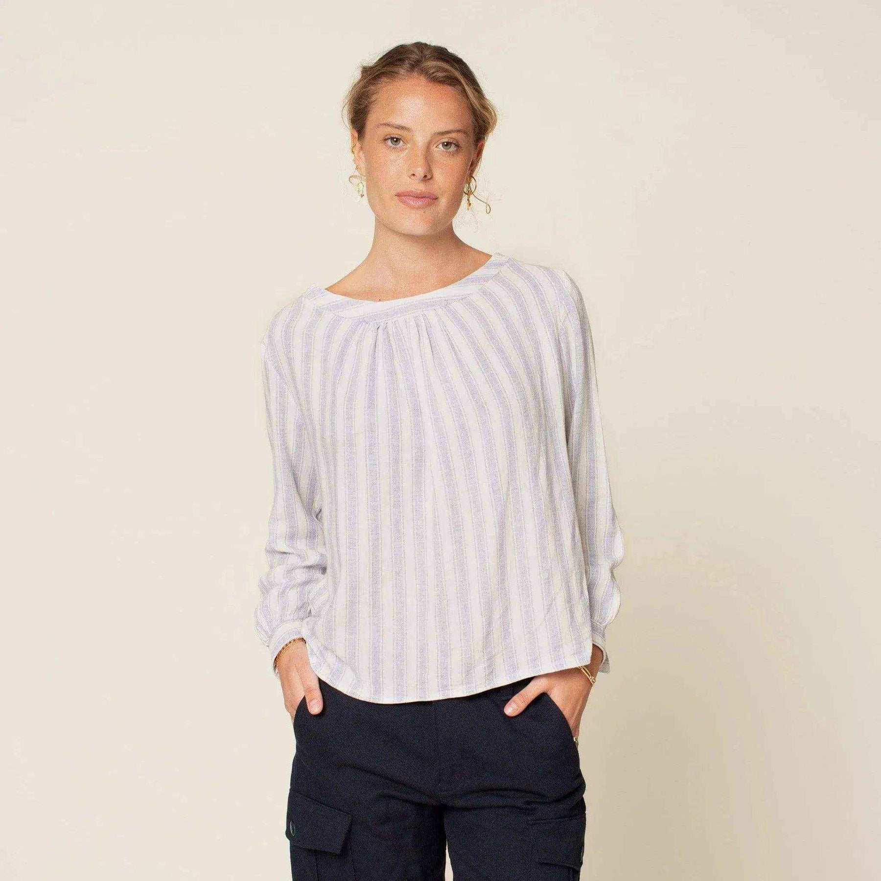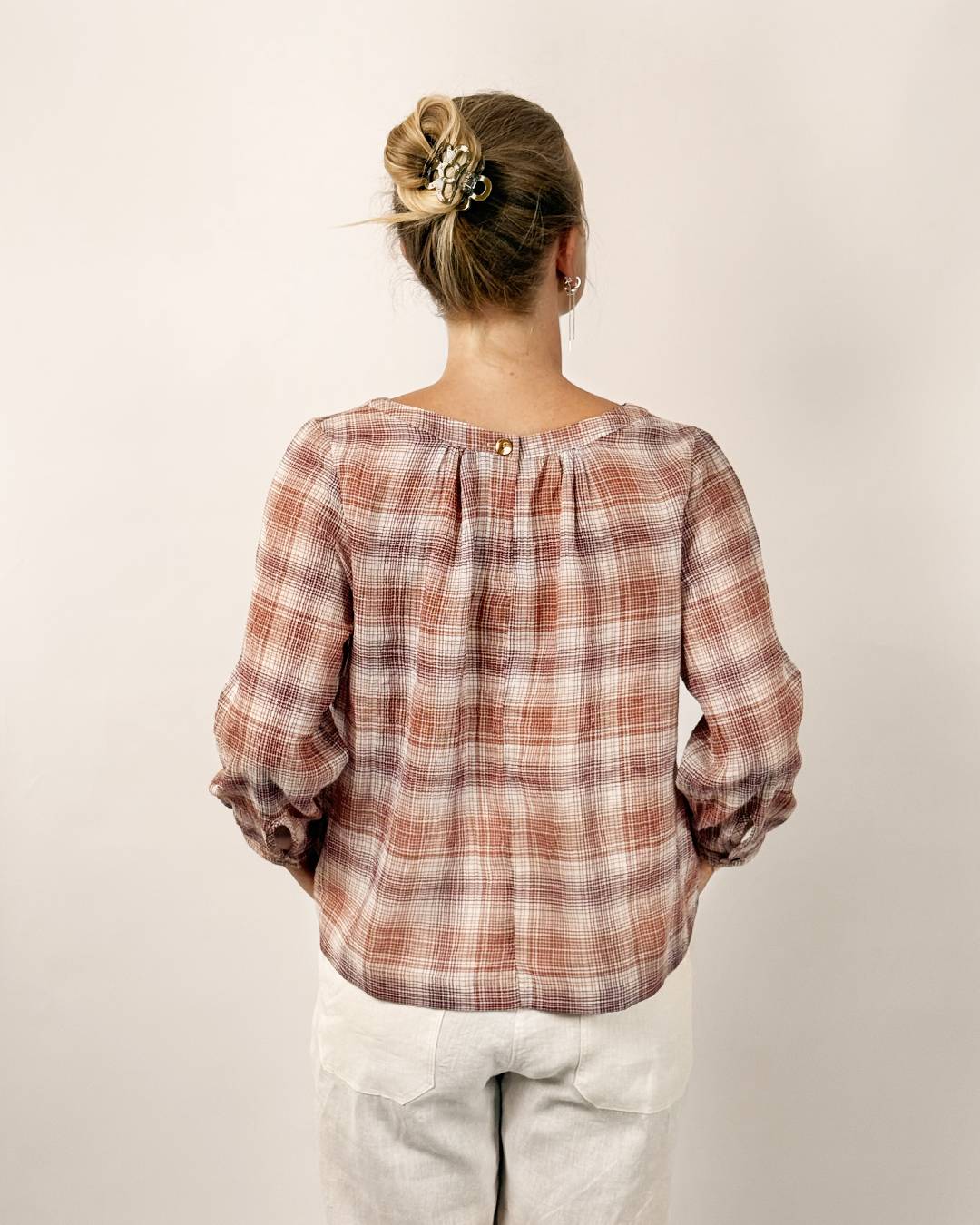 The Esther Blouse sewing pattern is a feminine woven top with soft volume and elegant details. Choose between Version A (pleats) or Version B (gathers) at the neckline. The blouse features a back neckline opening with a button and slit, and sleeves with pleats or gathers that taper into a cuff. Both the body and sleeves include two length options, plus a choice of straight or curved hem.