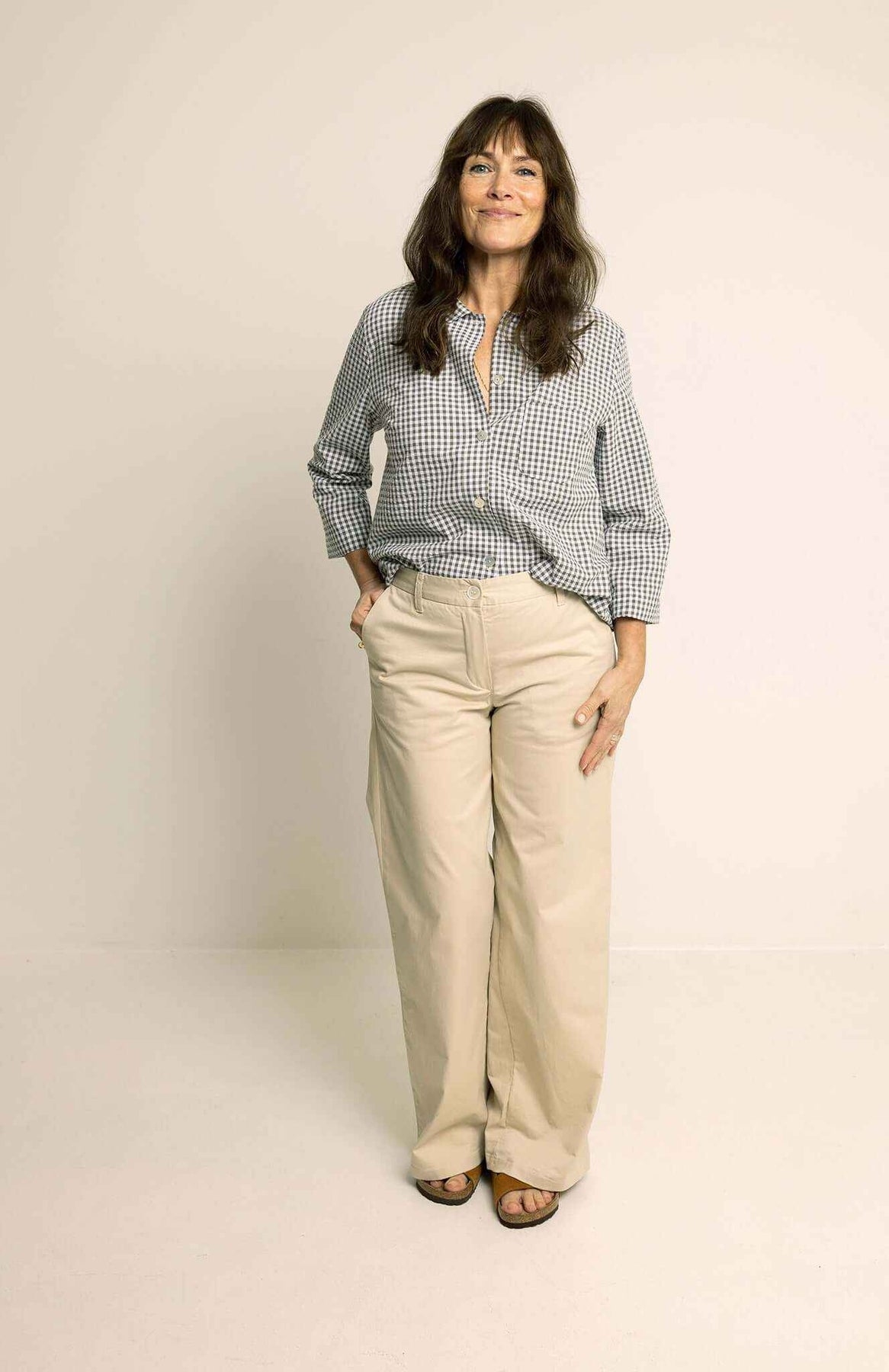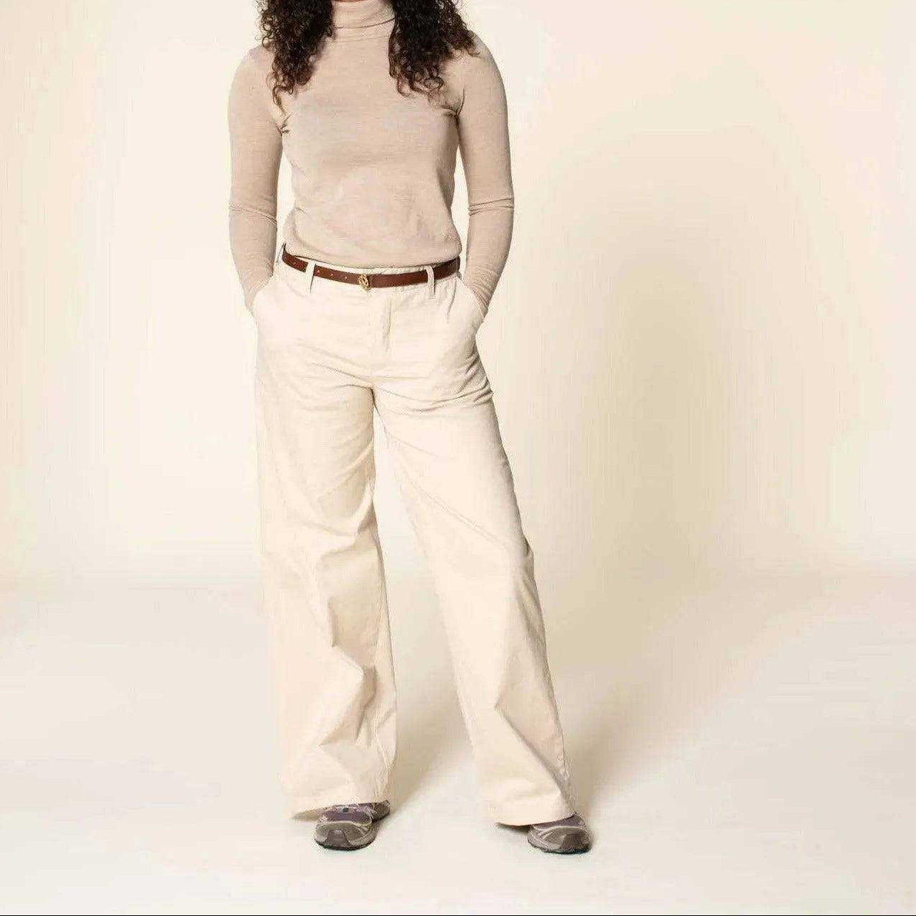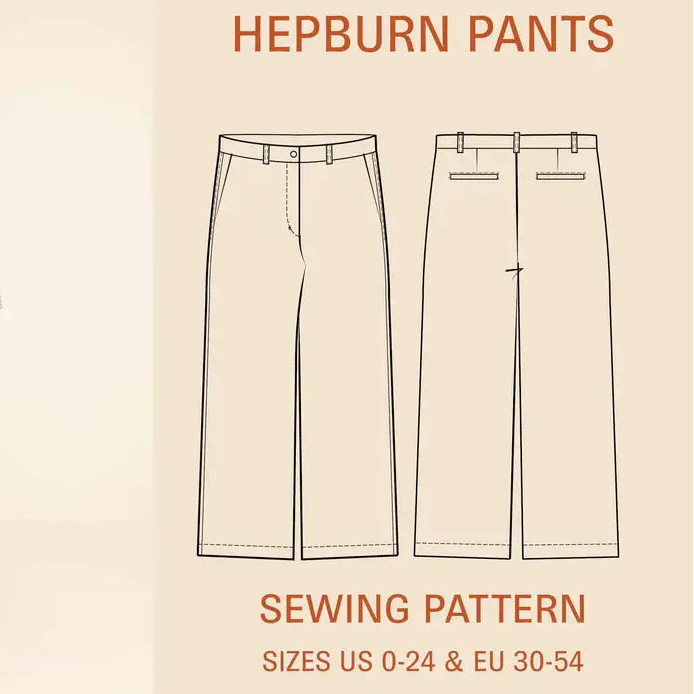 The Hepburn Pants sewing pattern combines sophistication and comfort with a flattering, timeless silhouette. The pants feature a contoured waistband, a zipper fly, slanted front pockets, and polished back details including darts and welt pockets. They are fitted from the waist to the hip and fall into wide legs from the hip to the floor.