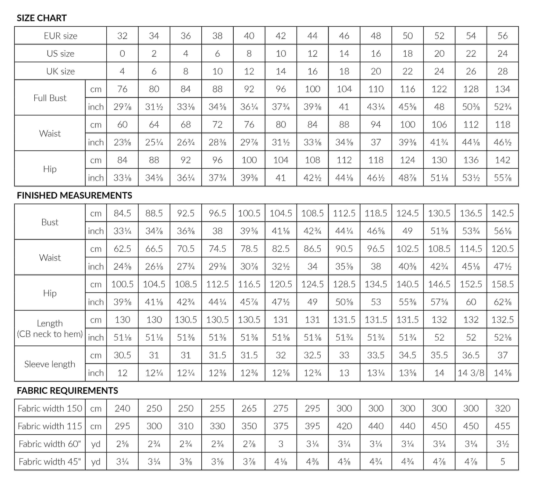 Sizes: EUR 32-56 | US 0-24 | UK 4-28