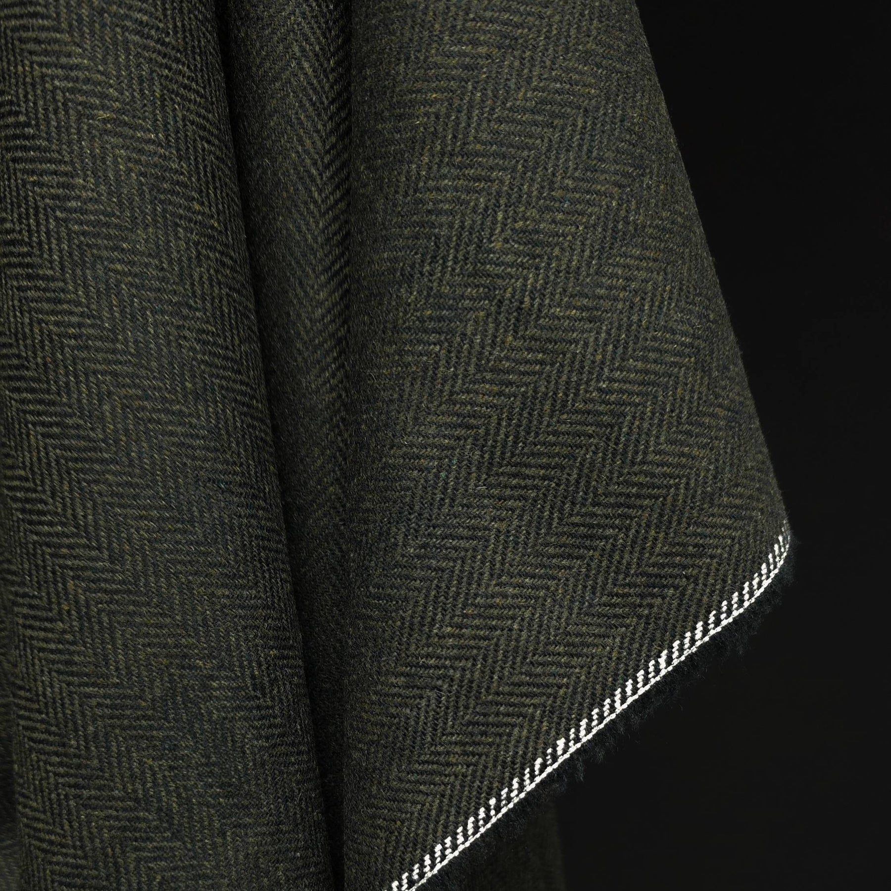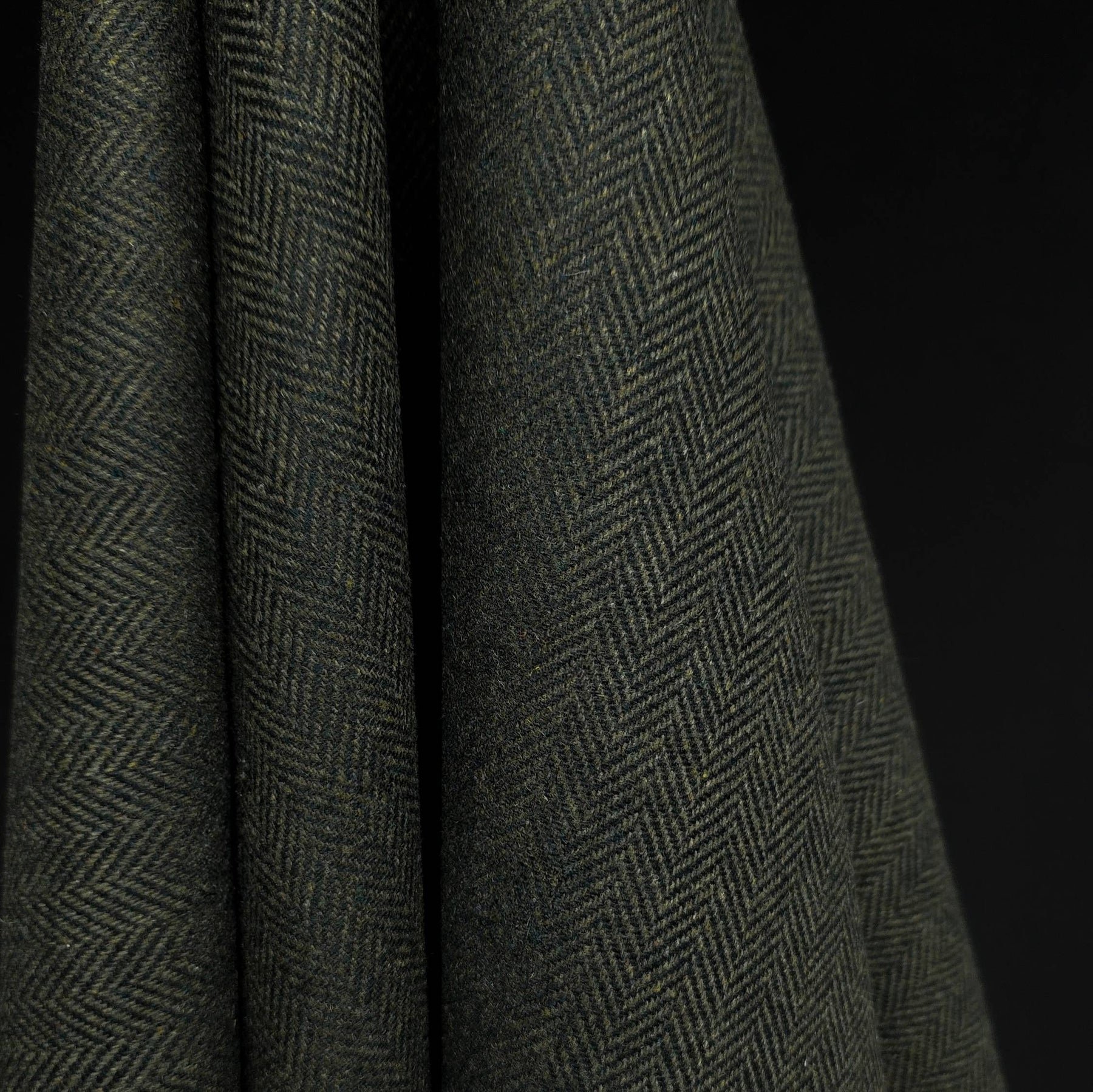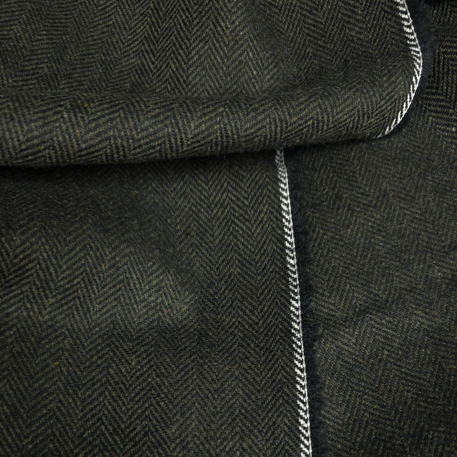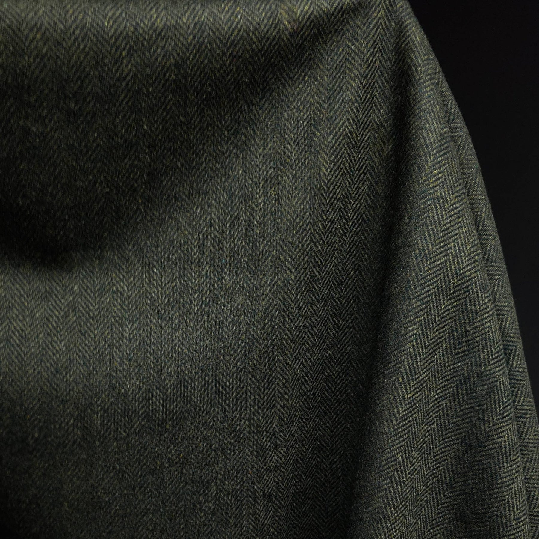 The traditional herringbone weave creates a refined texture and subtle pattern in deep olive tones, giving it a timeless and versatile look.