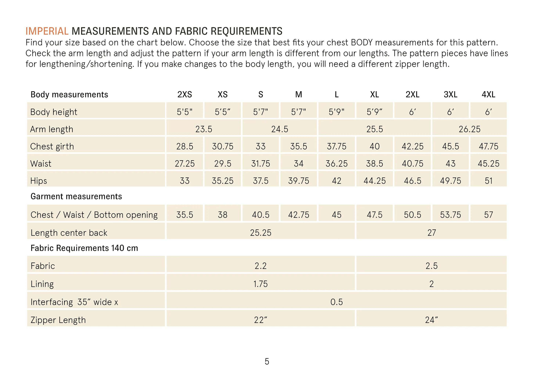 Flip through the images to find fabric requirements and measurements for the Bear Jacket sewing pattern.