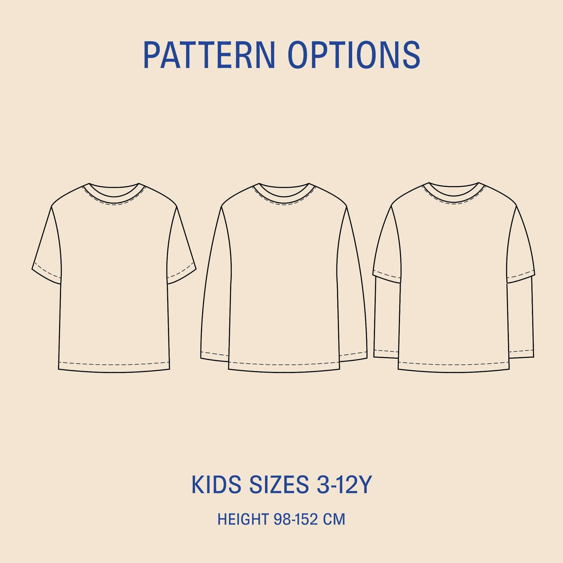 The Kids T-Shirt Sewing Pattern is designed for children aged 3–12 years and is perfect for creating a variety of relaxed-fitting shirts.