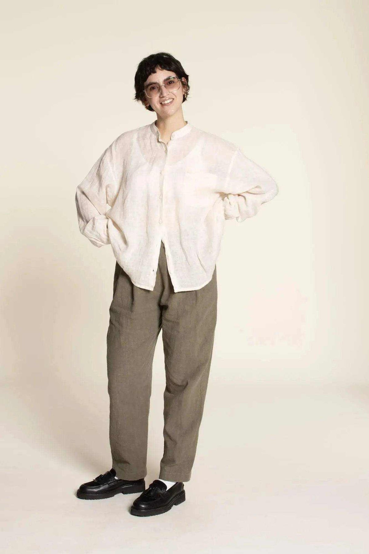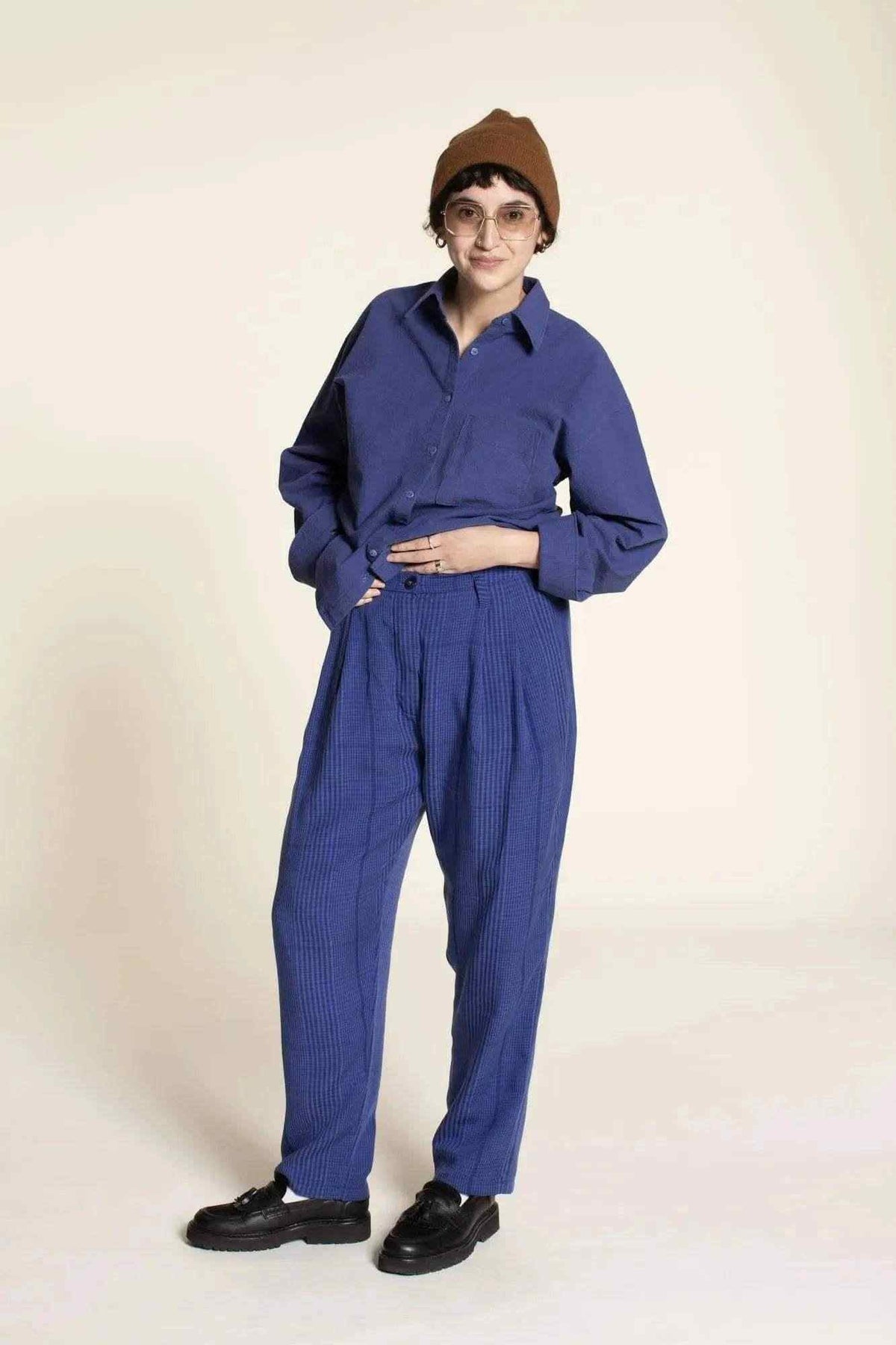 Sew the Cocoon Pants Sewing Pattern to create stylish, modern pants with a roomy silhouette and a tapered hem. Designed for woven fabrics, these pants combine comfort and statement shape with clean tailoring details.