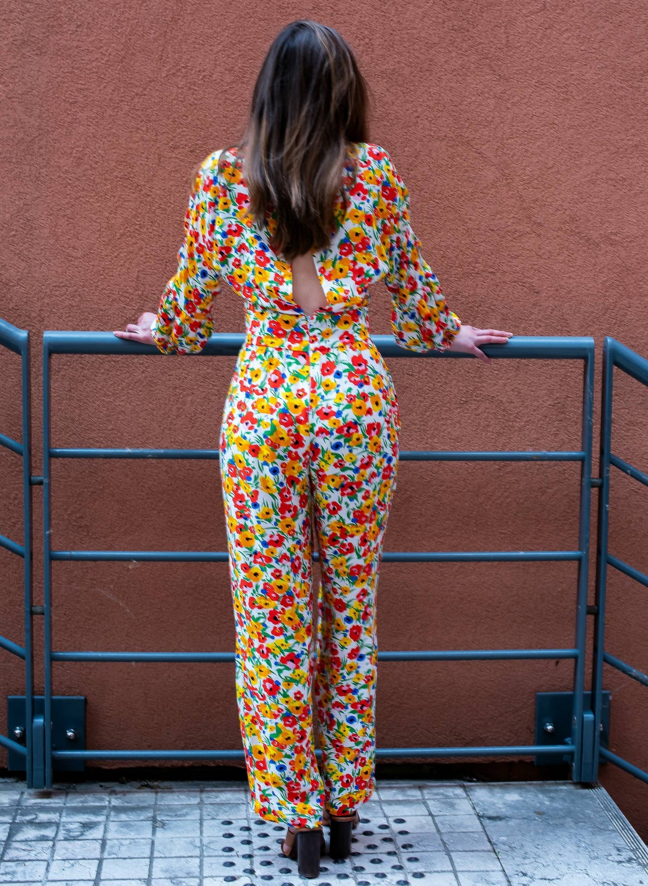 The Flora Jumpsuit closes with an invisible zipper positioned at the back crotch seam and extending to the waistband. The back neckline is finished with a loop and button closure for a clean and elegant finish.
