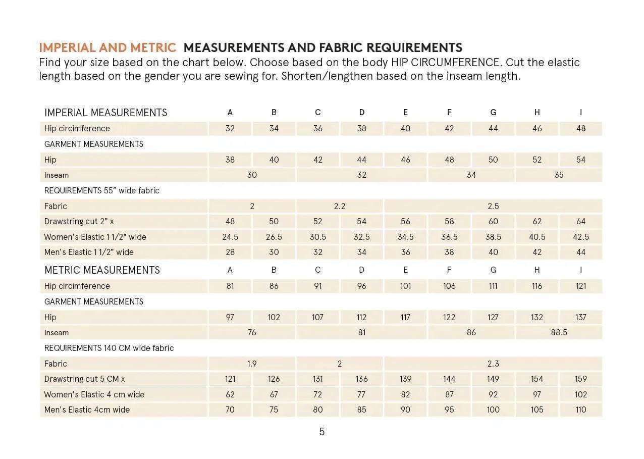 The PJ Pants pattern fits hips sizes 38-54 / 81-121 cm with the following features: