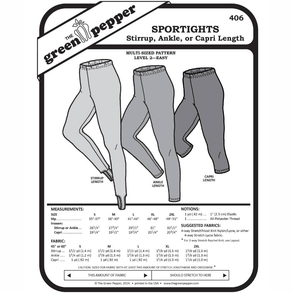 Make three styles of sport tights from one versatile sewing pattern. Perfect for yoga, running, hiking, biking, or everyday activewear, this pattern includes options for stirrup length, ankle length, or capri length leggings.
