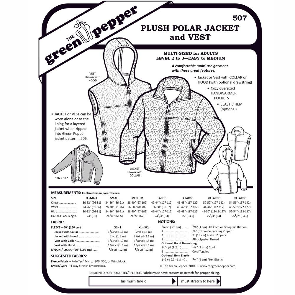 Choose between a vest or jacket version, with options for a collar or a hood. The hem can be finished with optional elastic, and the hood can include a drawstring for added adjustability. This pattern can also be used to create a zip-in lining for The Green Pepper 506 Skyline Jacket, making it a practical addition to your sewing library.