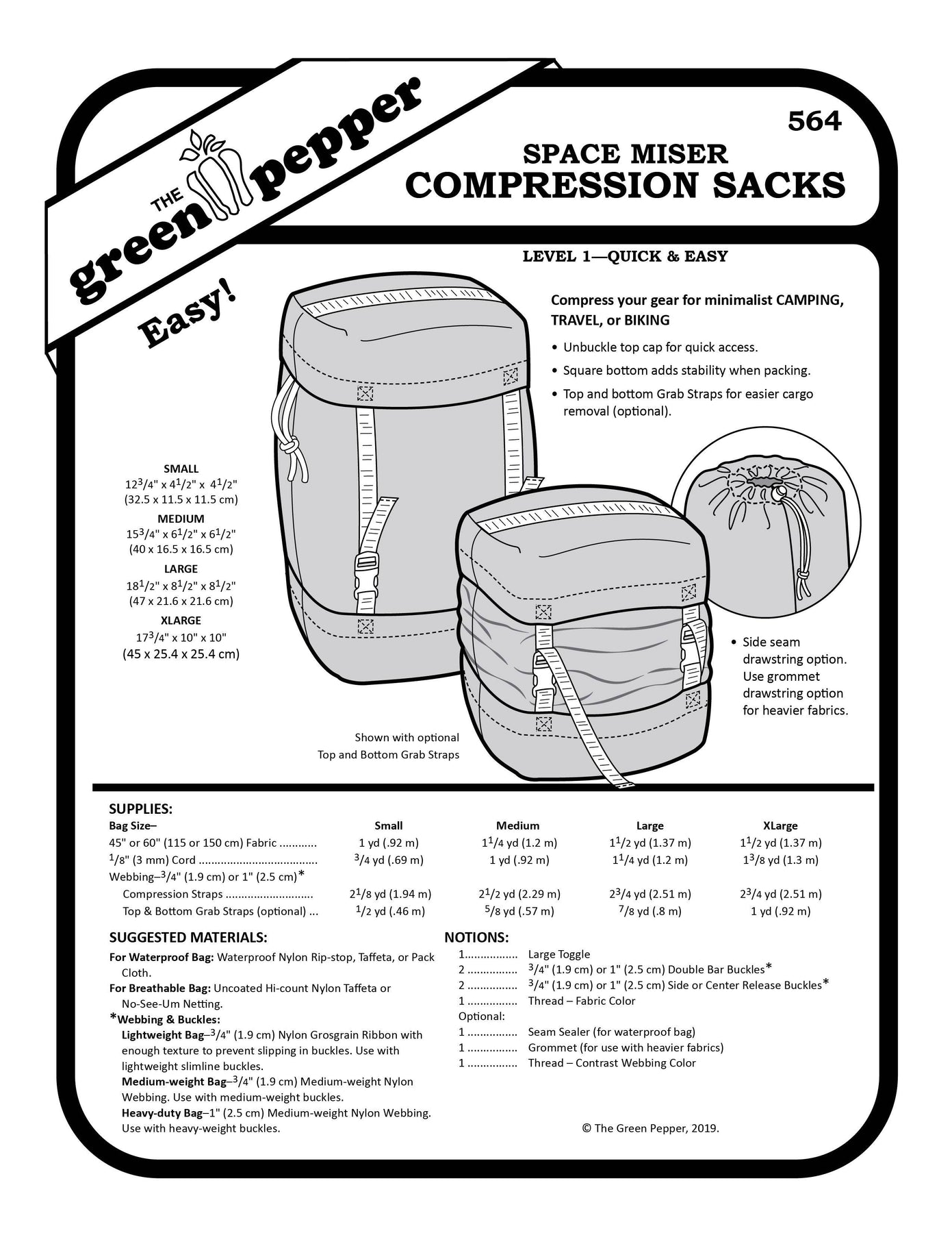 This Compression Sacks Sewing Pattern is designed for minimalist camping, travel, biking, and gear organization. Sew up to four different sizes to compress clothing or equipment efficiently while maximizing packing space.