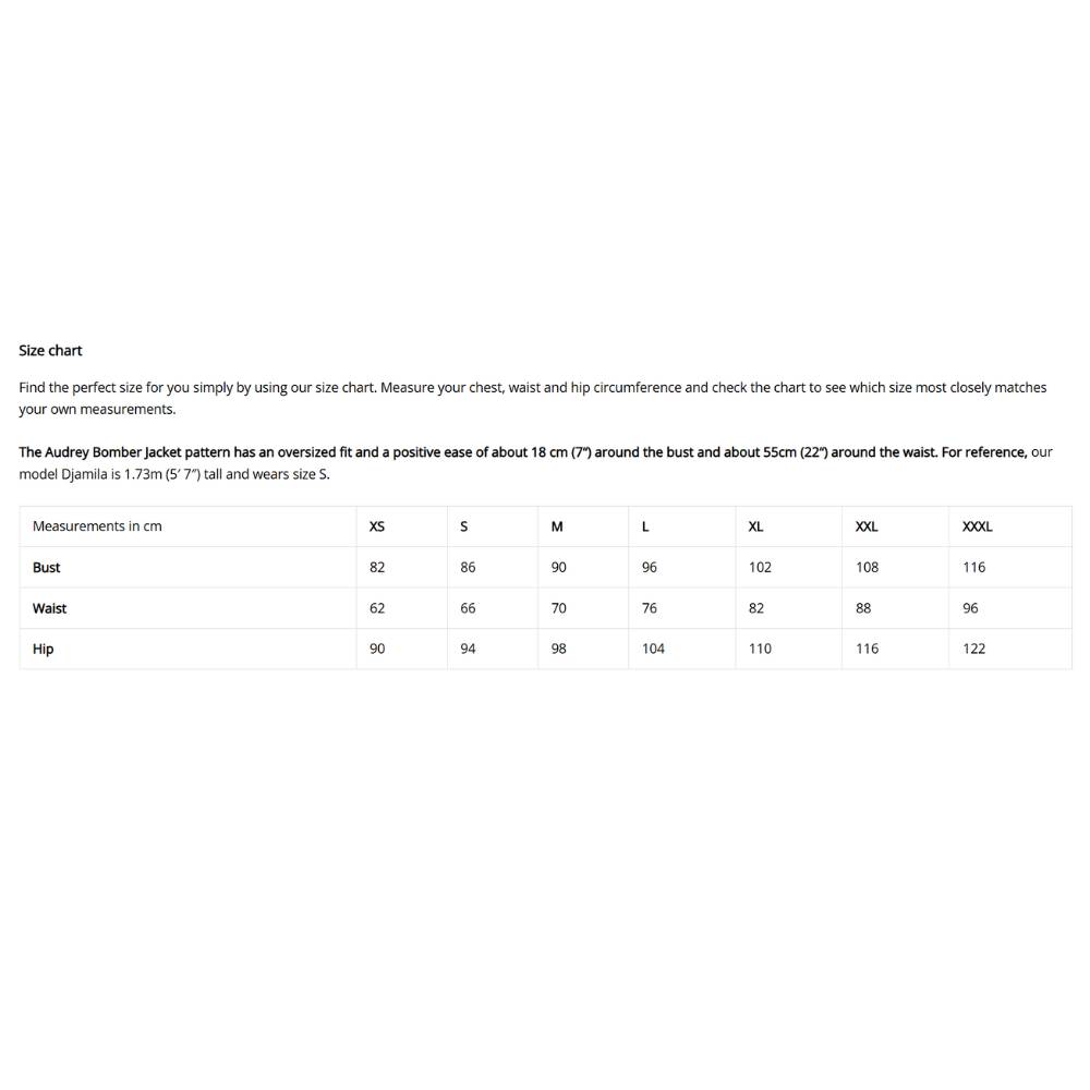 The Audrey Bomber Jacket sewing pattern by Juliana Martejevs is a modern take on the classic bomber jacket, featuring an oversized silhouette, wide sleeves, and signature ribbed cuffs at the hem, sleeves, and collar. Designed to be stylish yet approachable, this jacket delivers a strong fashion statement while remaining surprisingly simple to sew.