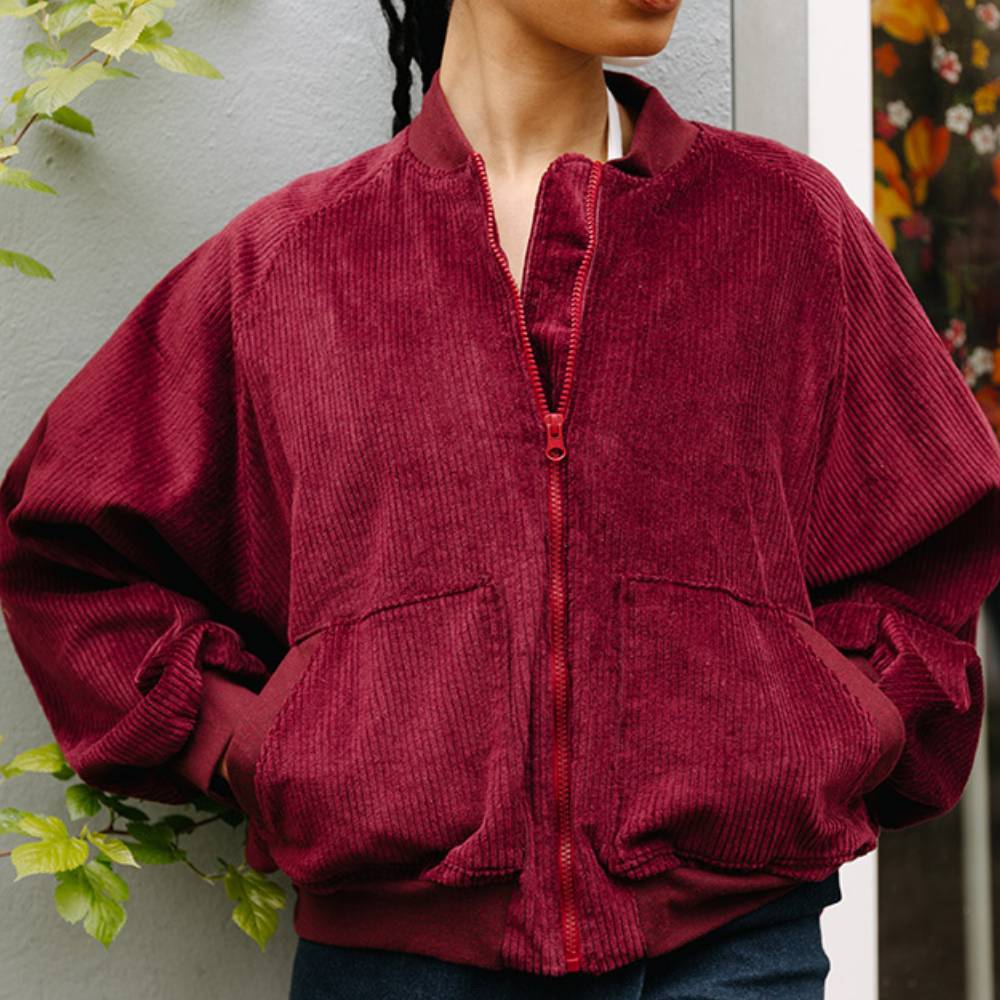 This unlined bomber jacket is ideal for confident beginners looking to tackle their first jacket project without the complexity of lining. A front zipper with placket adds structure and functionality, while large patch pockets bring a subtle utility-inspired detail. Depending on your fabric choice, the Audrey Bomber Jacket can shift effortlessly from a retro corduroy look to a sporty softshell version.