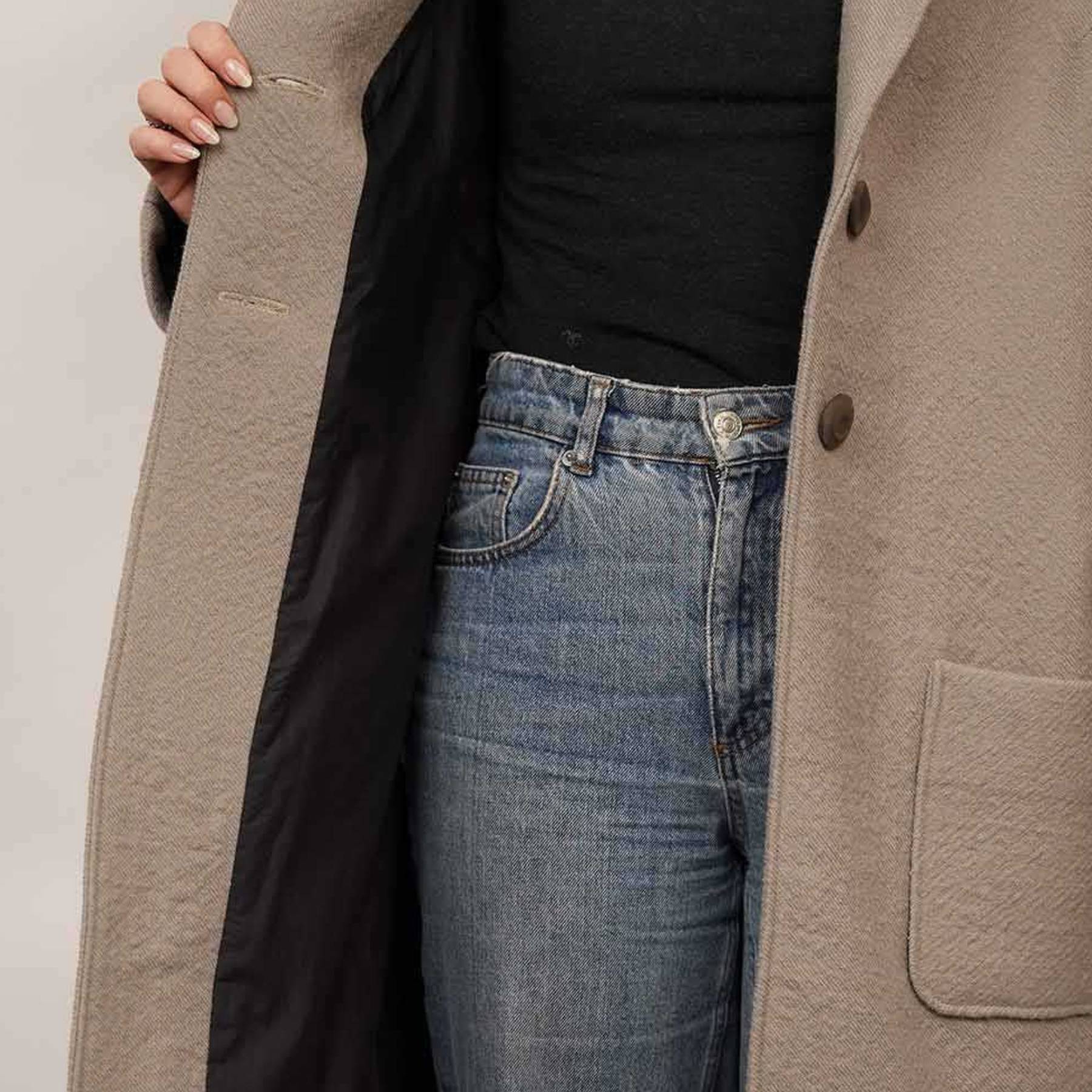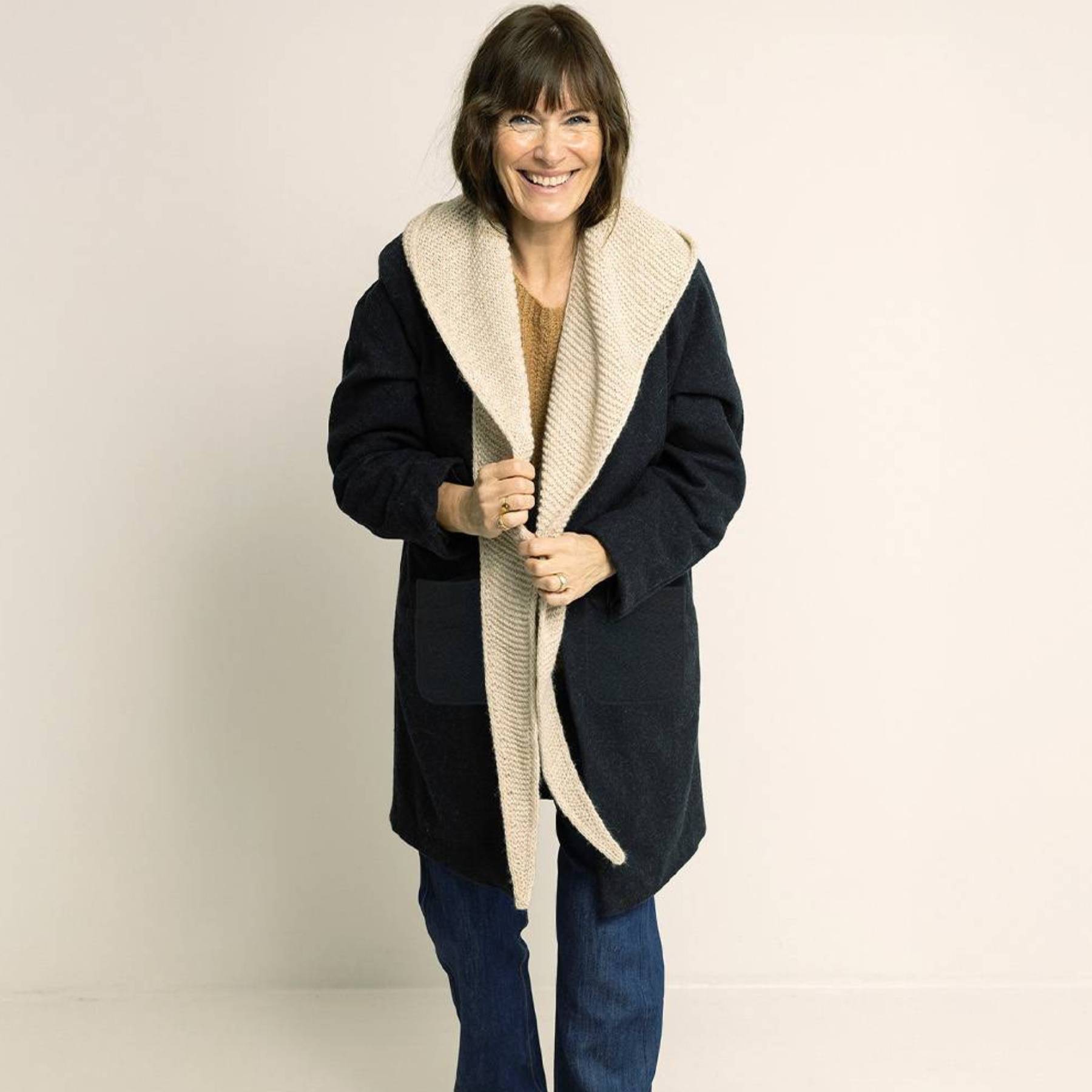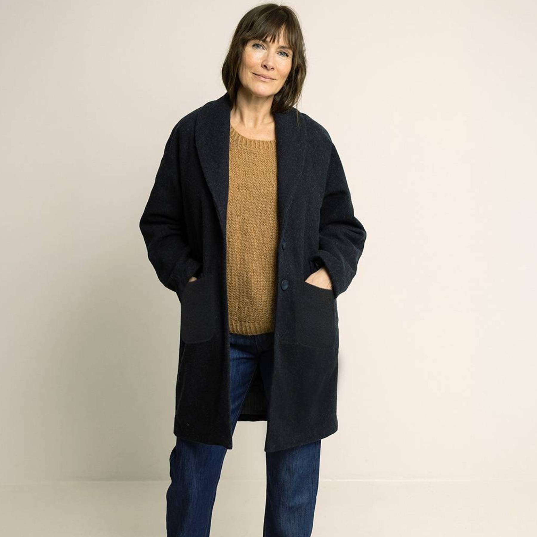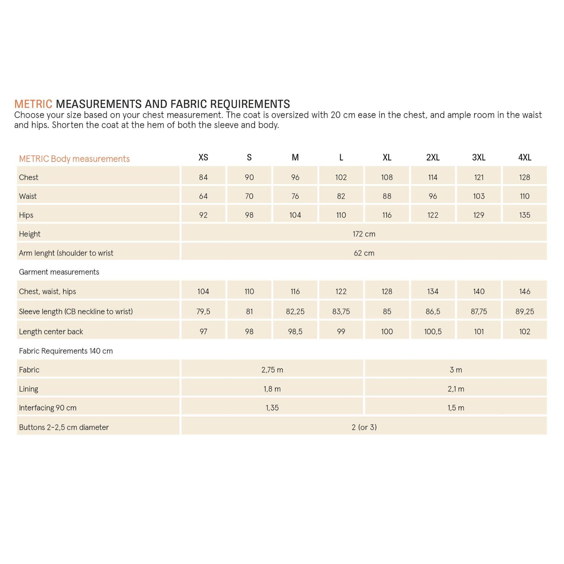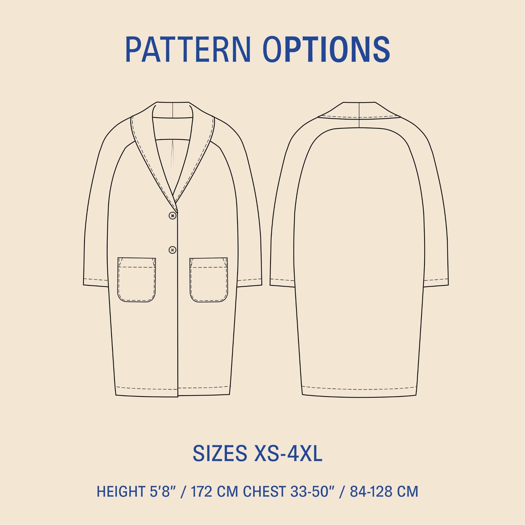 The pattern includes a curved back yoke seam that enhances the cocoon shape, generous patch pockets, and a two-button front closure. The below-knee length makes it perfect for fall and winter layering.