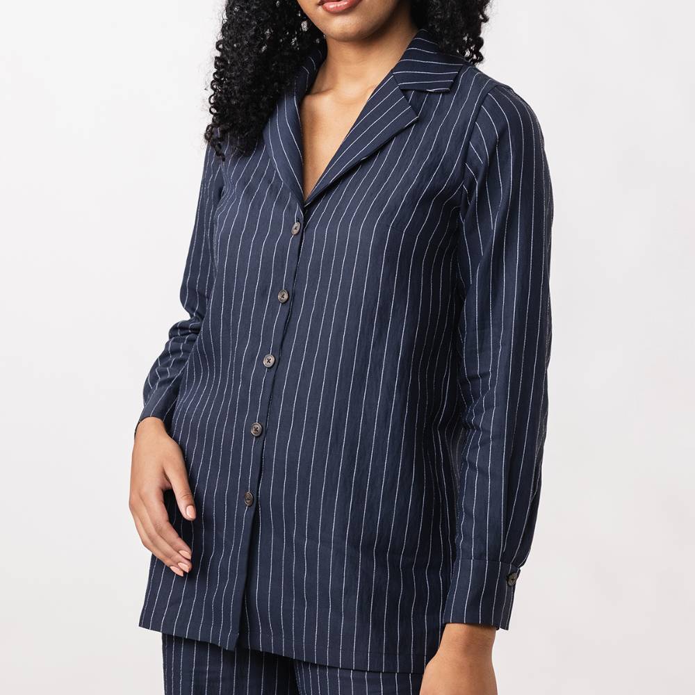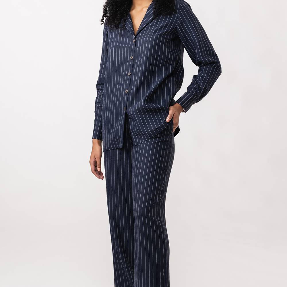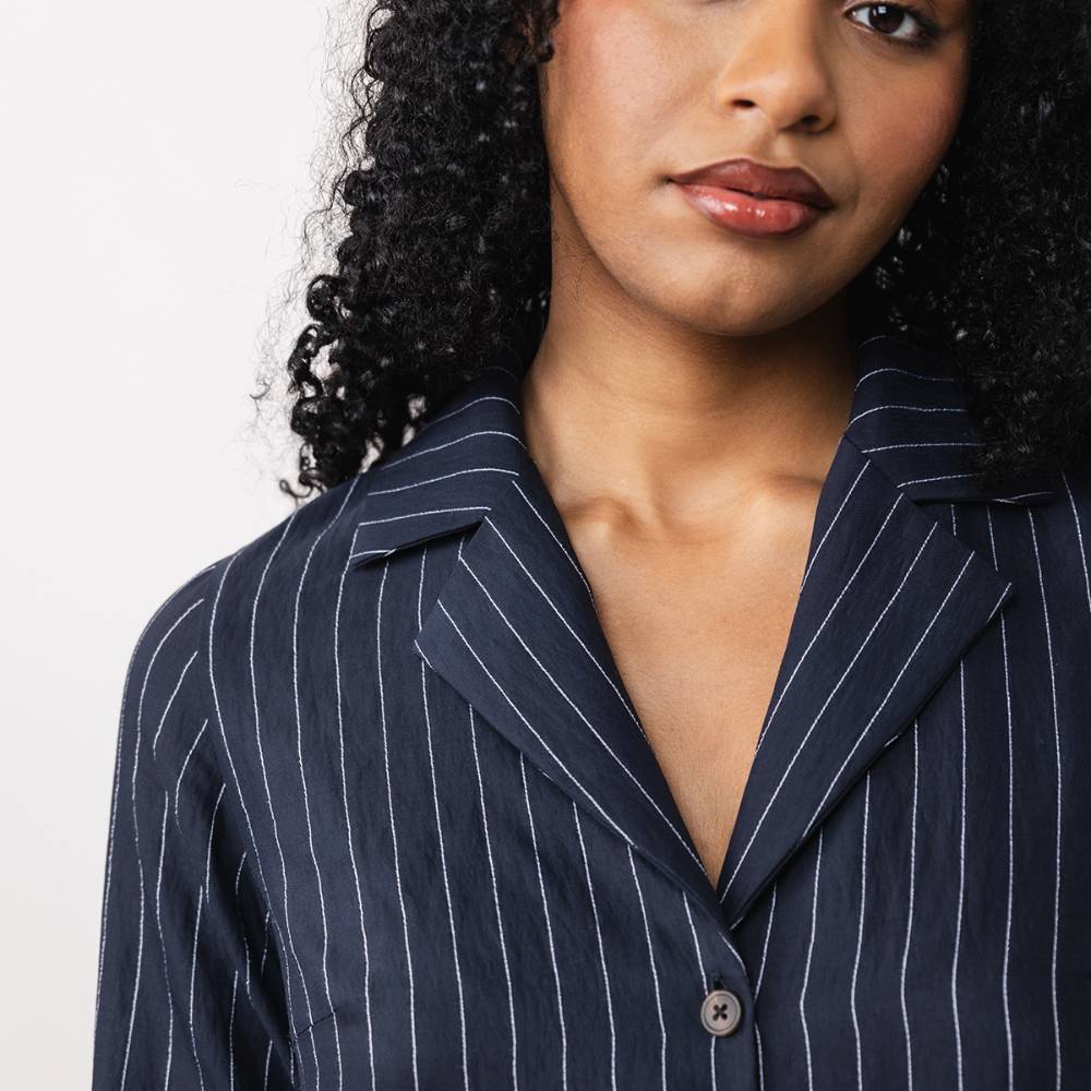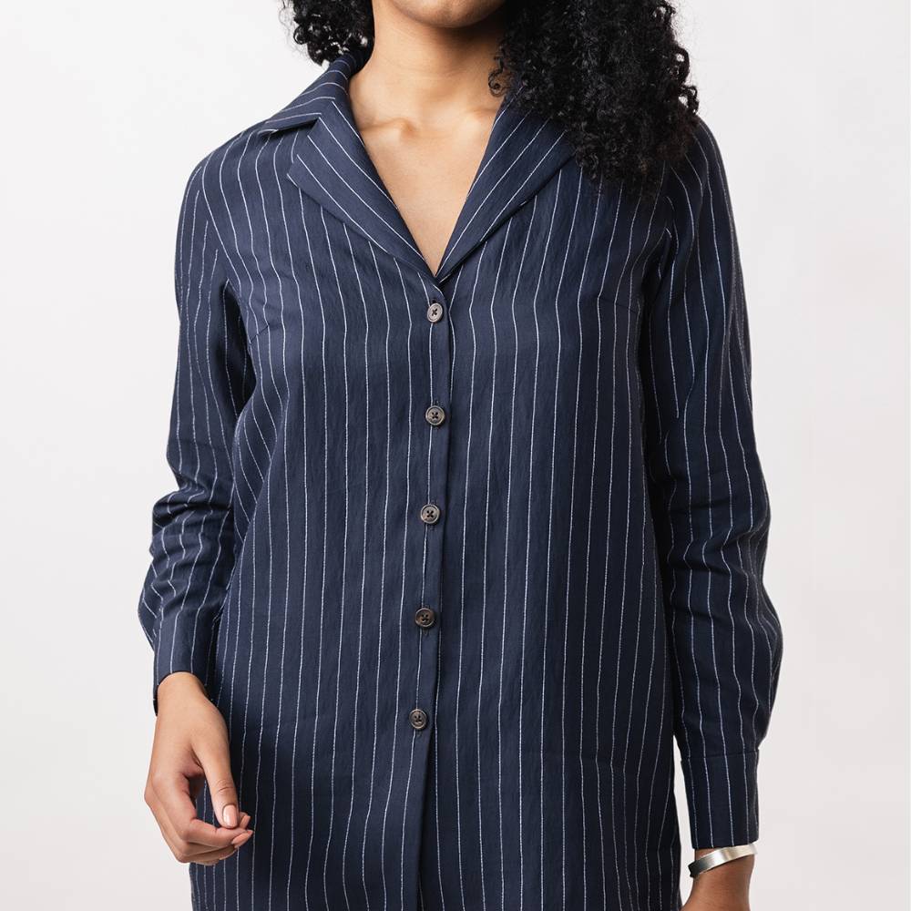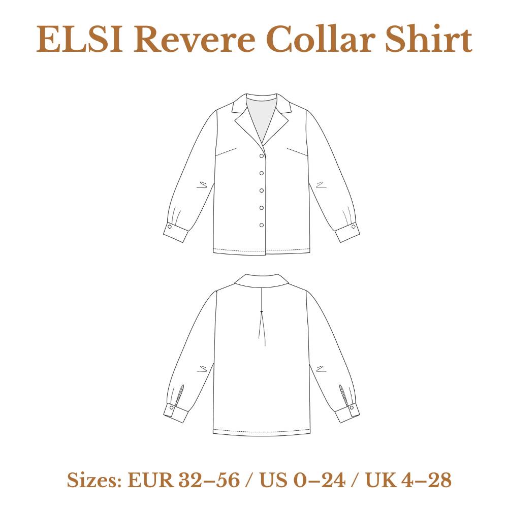 The Elsi Shirt is a refined everyday shirt pattern featuring a deep V-neckline with notched lapels for a modern tailored look. The shirt is fitted at the shoulders while remaining straight and loose-fitting through the body, creating a comfortable yet polished silhouette.