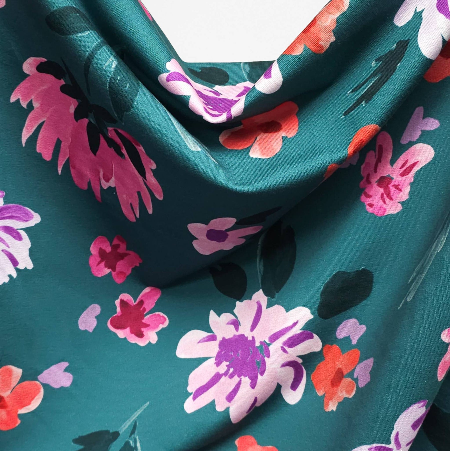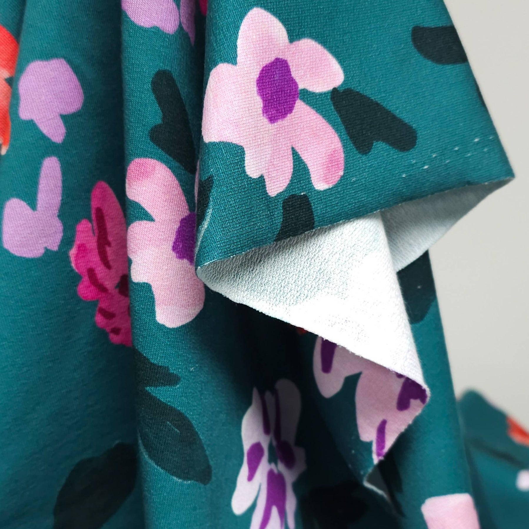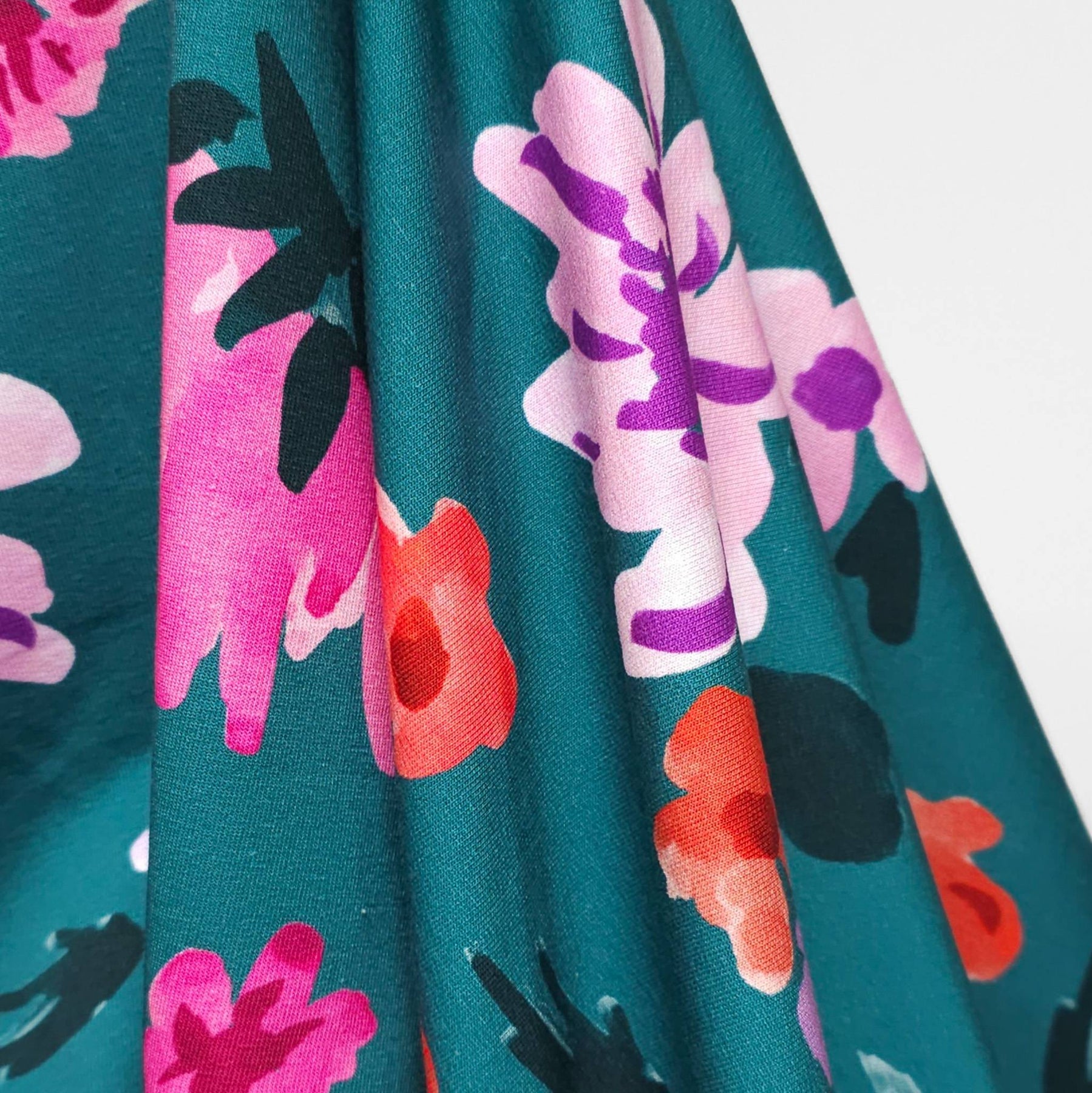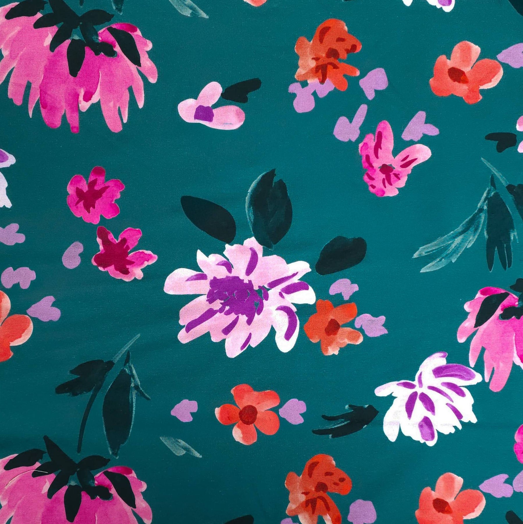 Colette in Petrol by Nerida Hansen features expressive painterly florals in vibrant pinks, corals, lilacs, and deep greens layered over a saturated teal-petrol background. The contrast is striking yet wearable, making it perfect for modern, artistic garments.