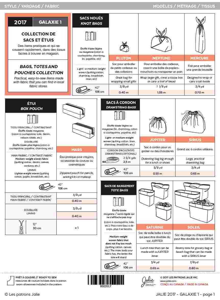 PDF SEWING PATTERN | 2017 | GALAXIE 1 | Bags, totes and pouches | Jalie