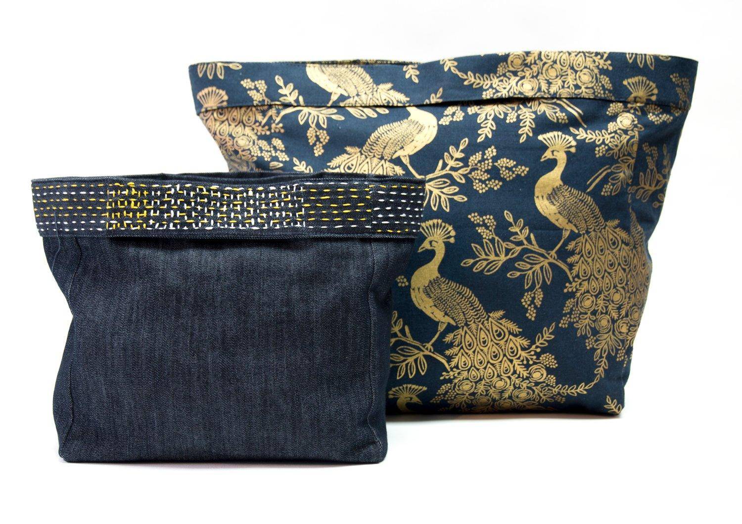Two roomy tote bags with a clever handle design for carrying heavier or bulkier items.