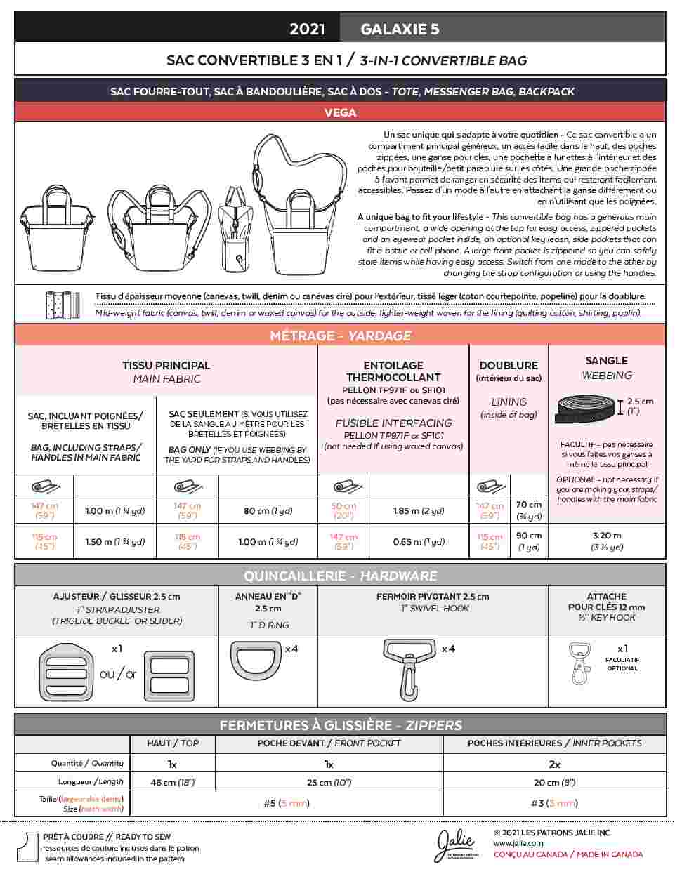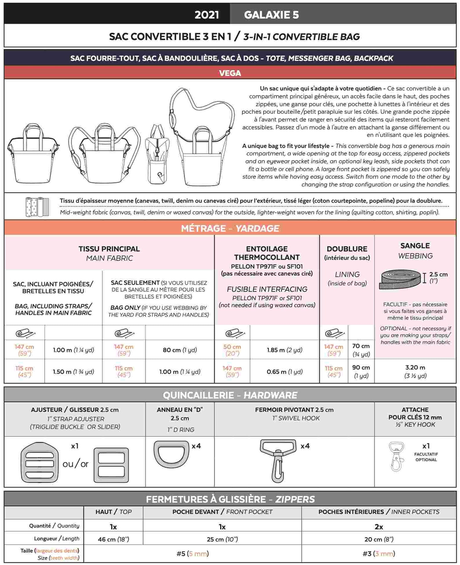 The VEGA Bag is a versatile and functional 3-in-1 bag pattern that can be worn as a tote bag, messenger bag, or backpack. Designed for everyday use, this fully lined bag offers smart storage solutions while maintaining a clean, modern look.