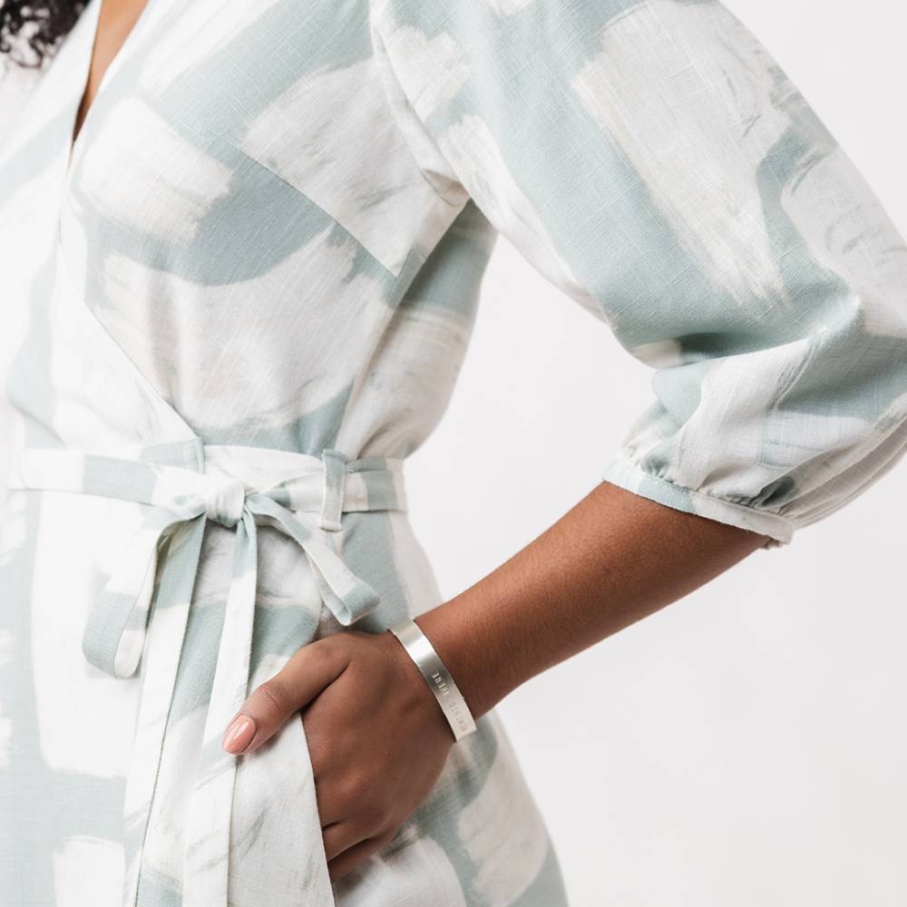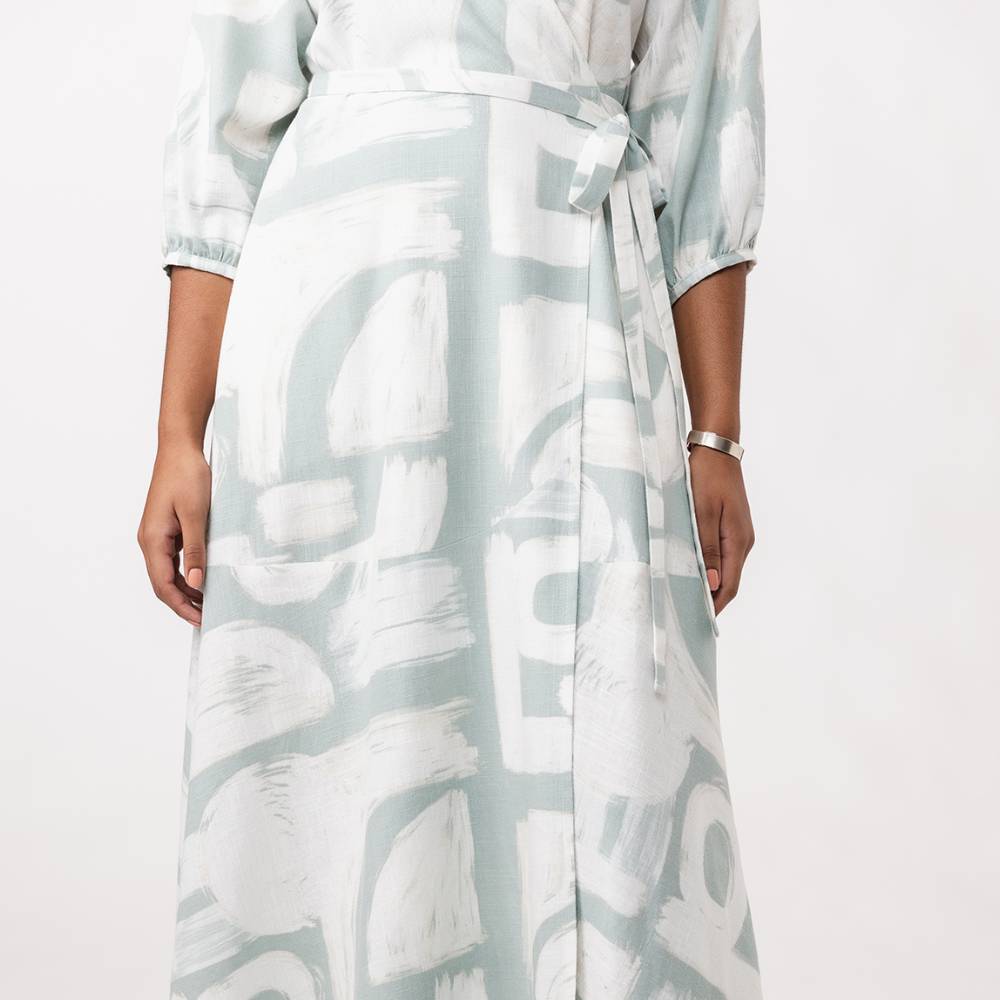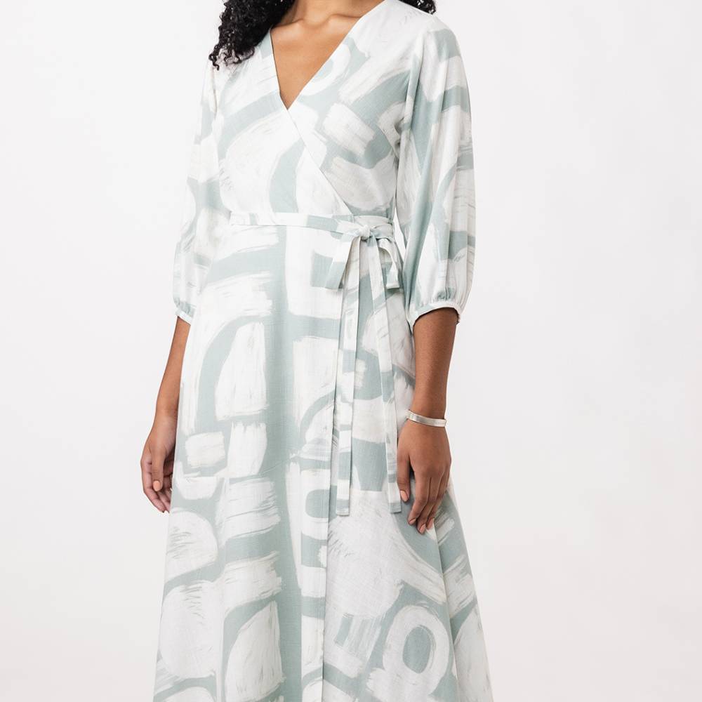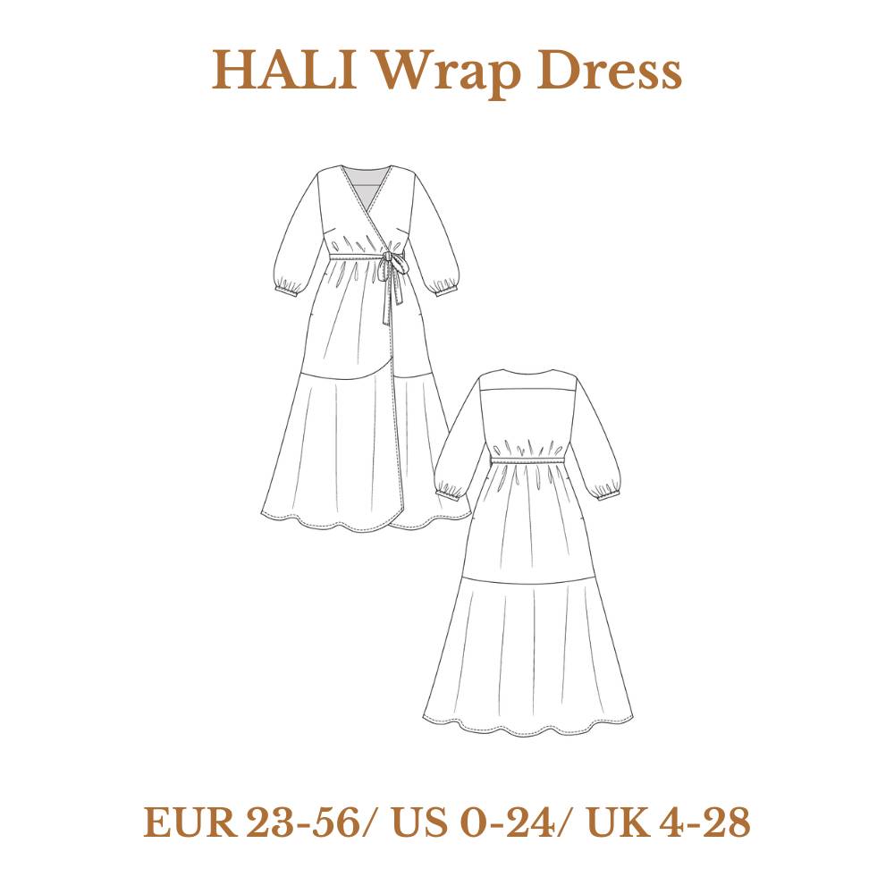 The Hali wrap dress sewing pattern is a comfy and stylish wardrobe staple that features a semi-fitted wrap bodice with a back yoke and a V-neck, wrap tie closure, and handy side pockets.