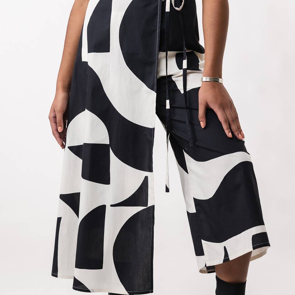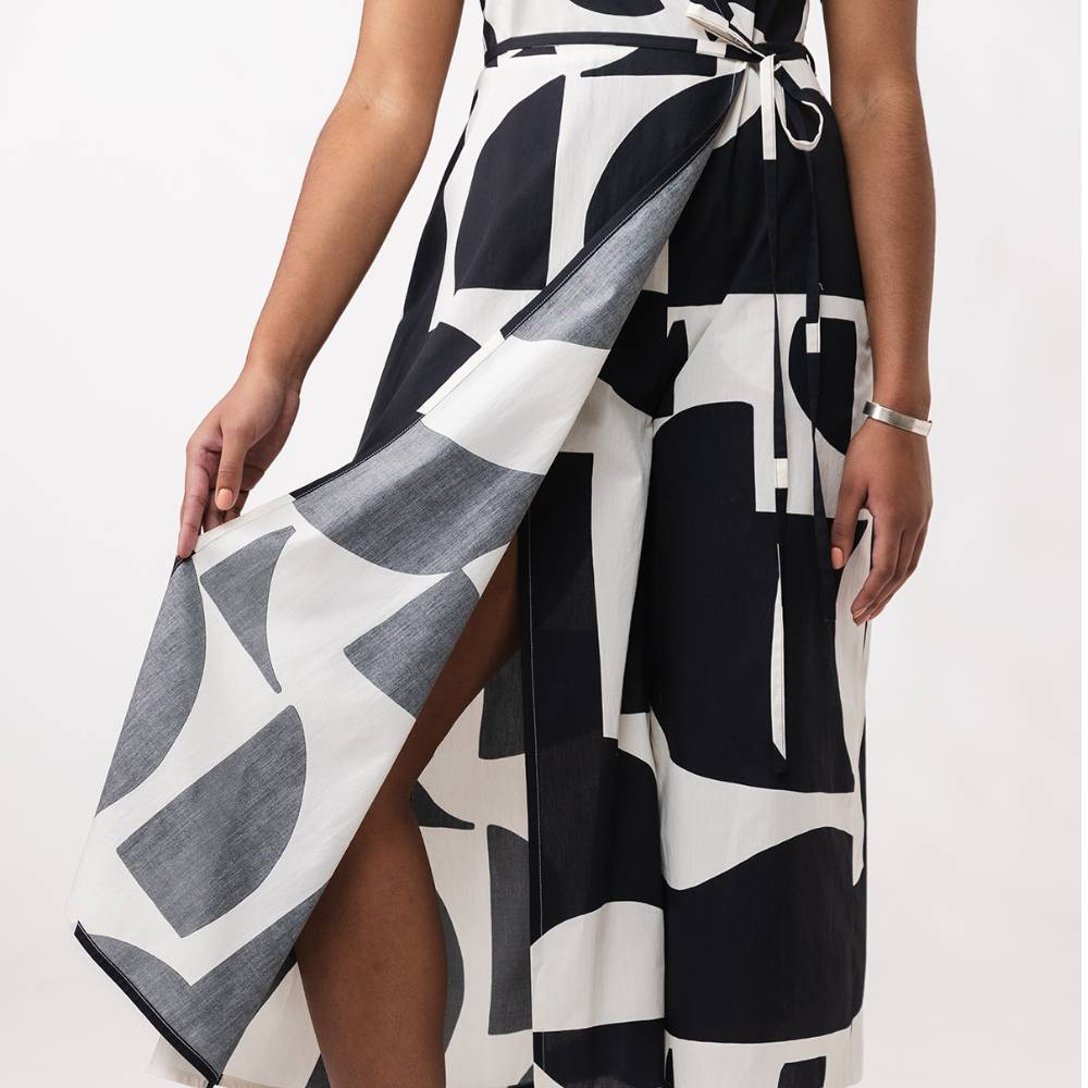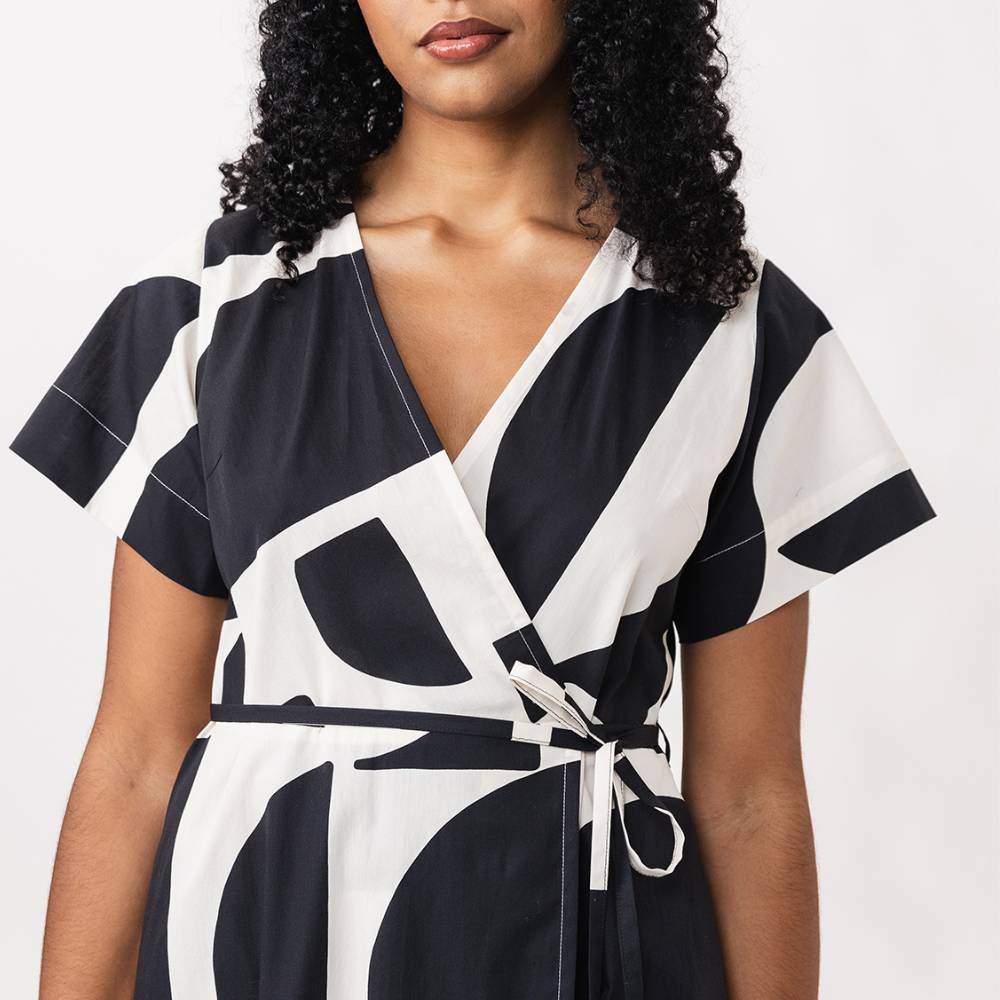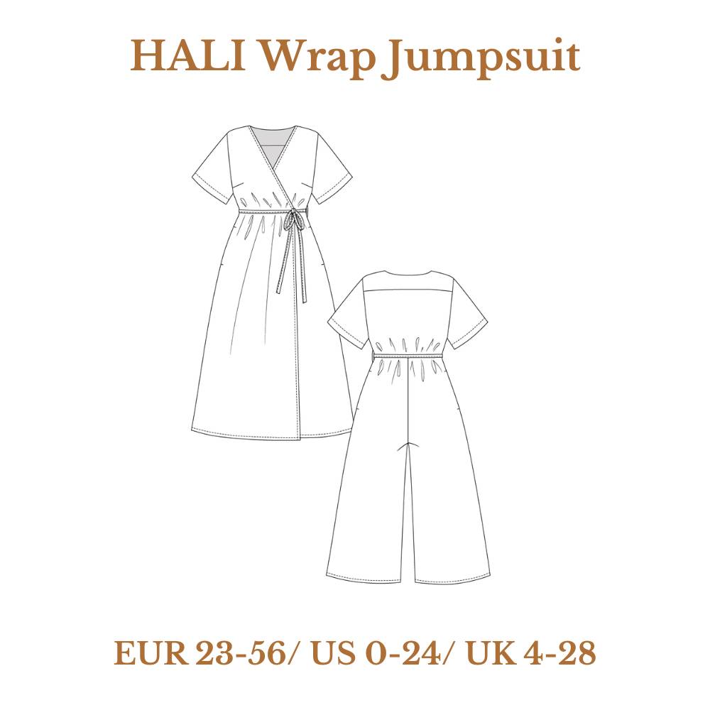 The Hali wrap jumpsuit sewing pattern is a comfy but stylish wardrobe staple that features a semi-fitted wrap bodice with a back yoke and a V-neck, wrap tie closure and handy side pockets.