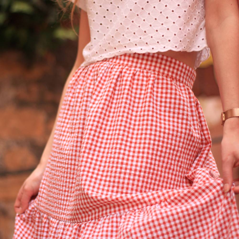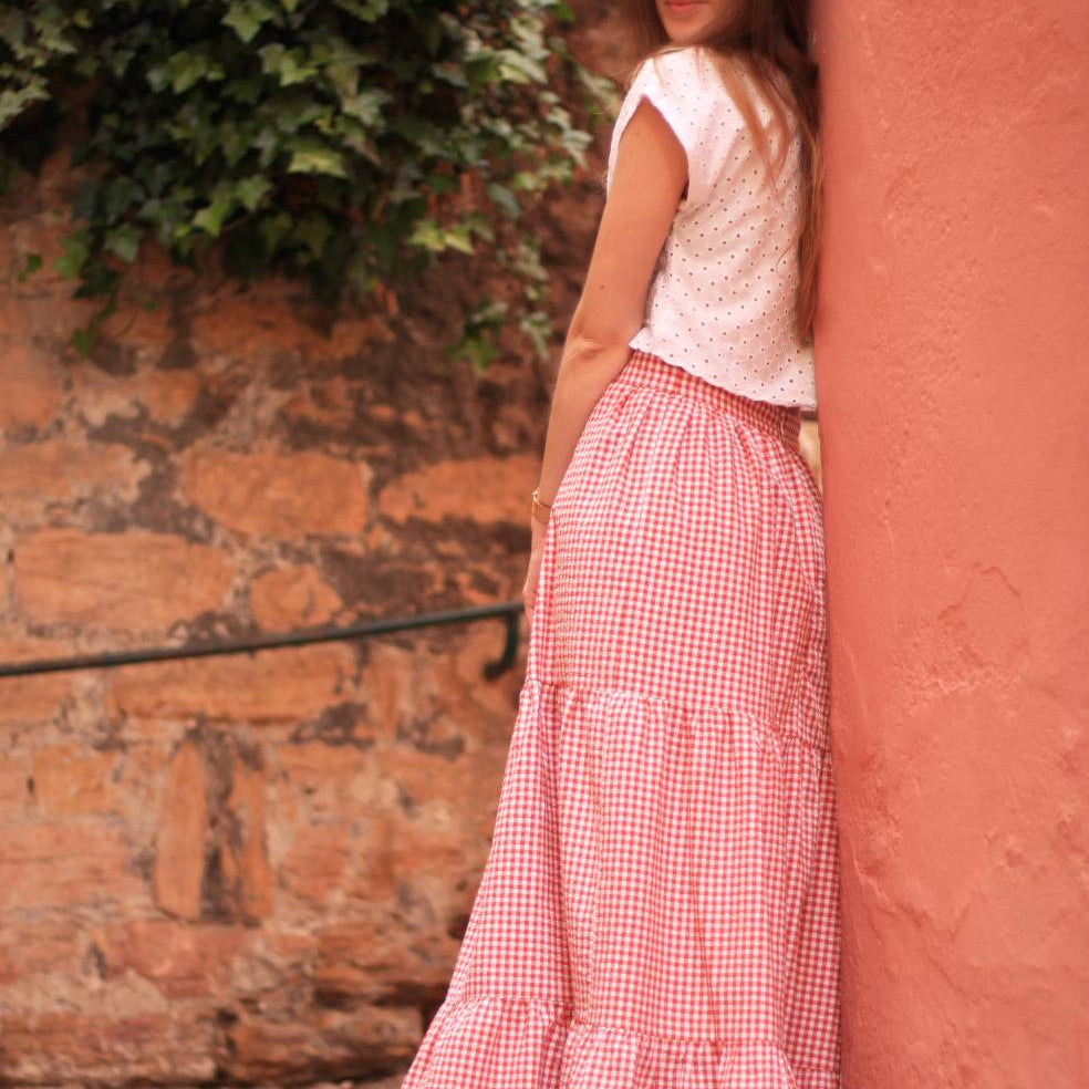 The Zoya Skirt sewing pattern is a feminine and flowing skirt featuring three gathered tiers that create a light and airy silhouette perfect for warm days.