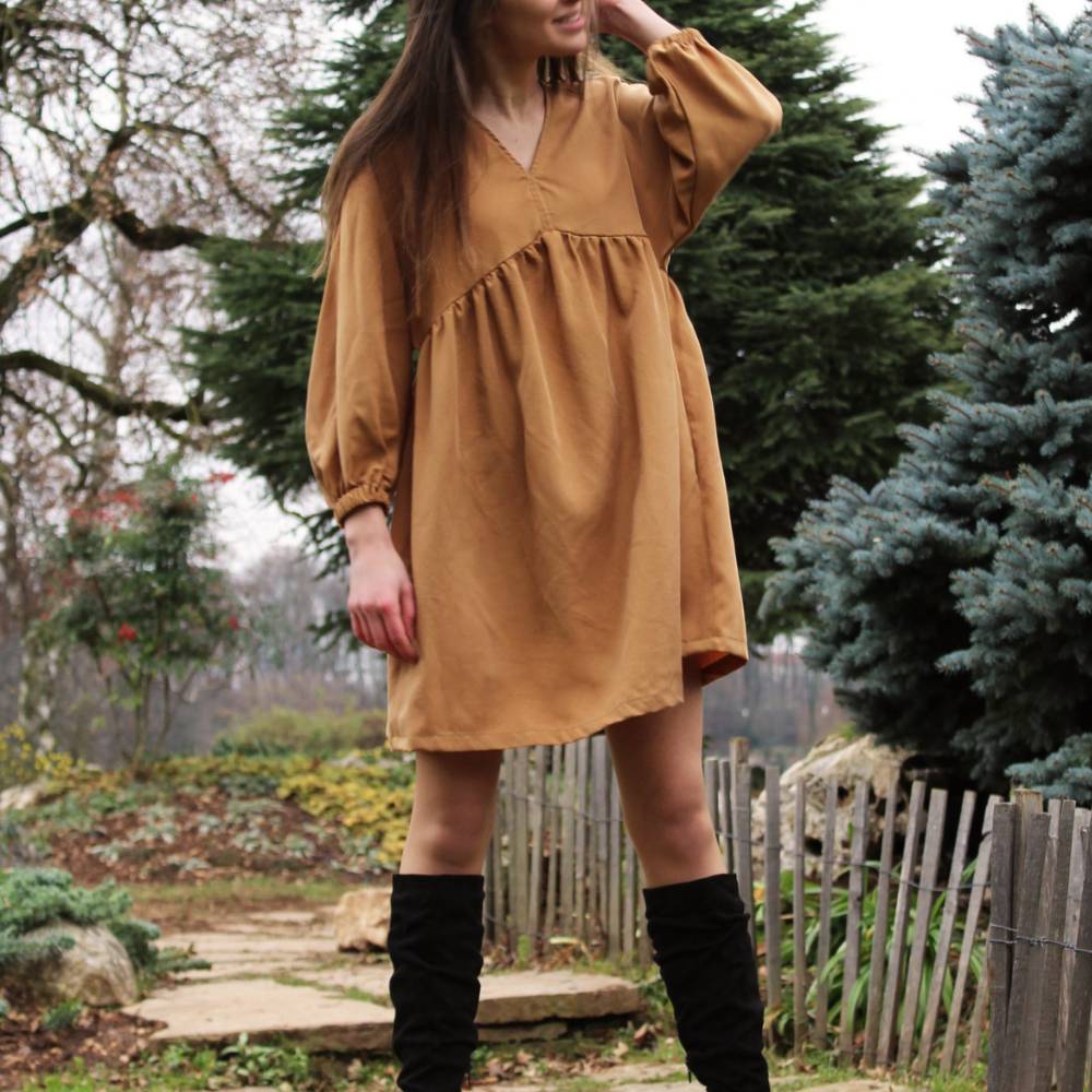 The dress features 3/4 batwing sleeves gathered with elastic, creating a soft and slightly puffed effect. The bodice has a V-neckline at the center front, while the skirt is gathered at the waist, giving the dress a comfortable and feminine silhouette.