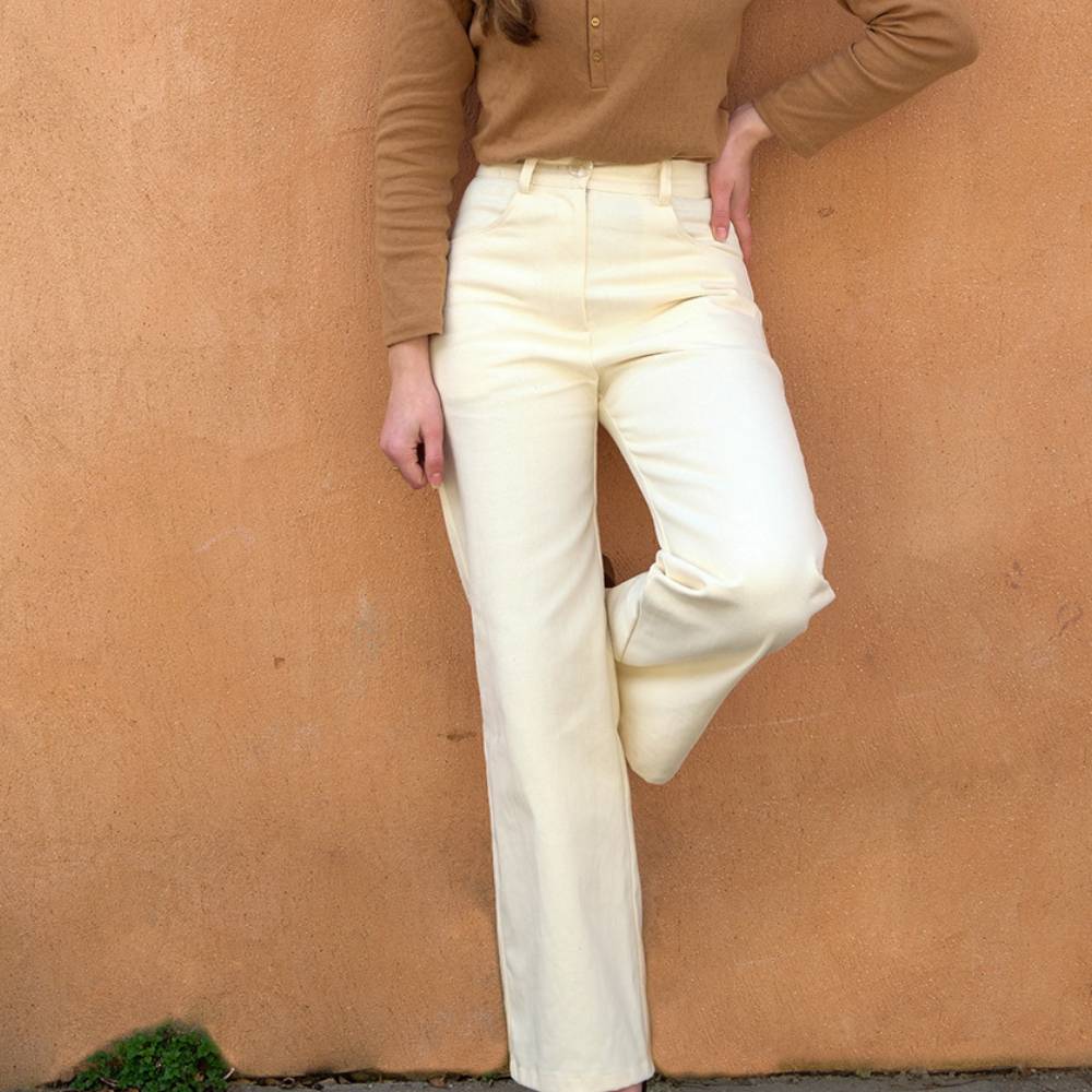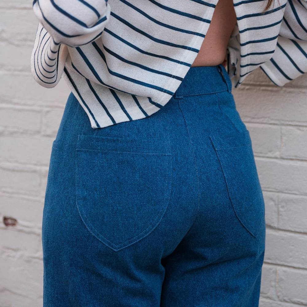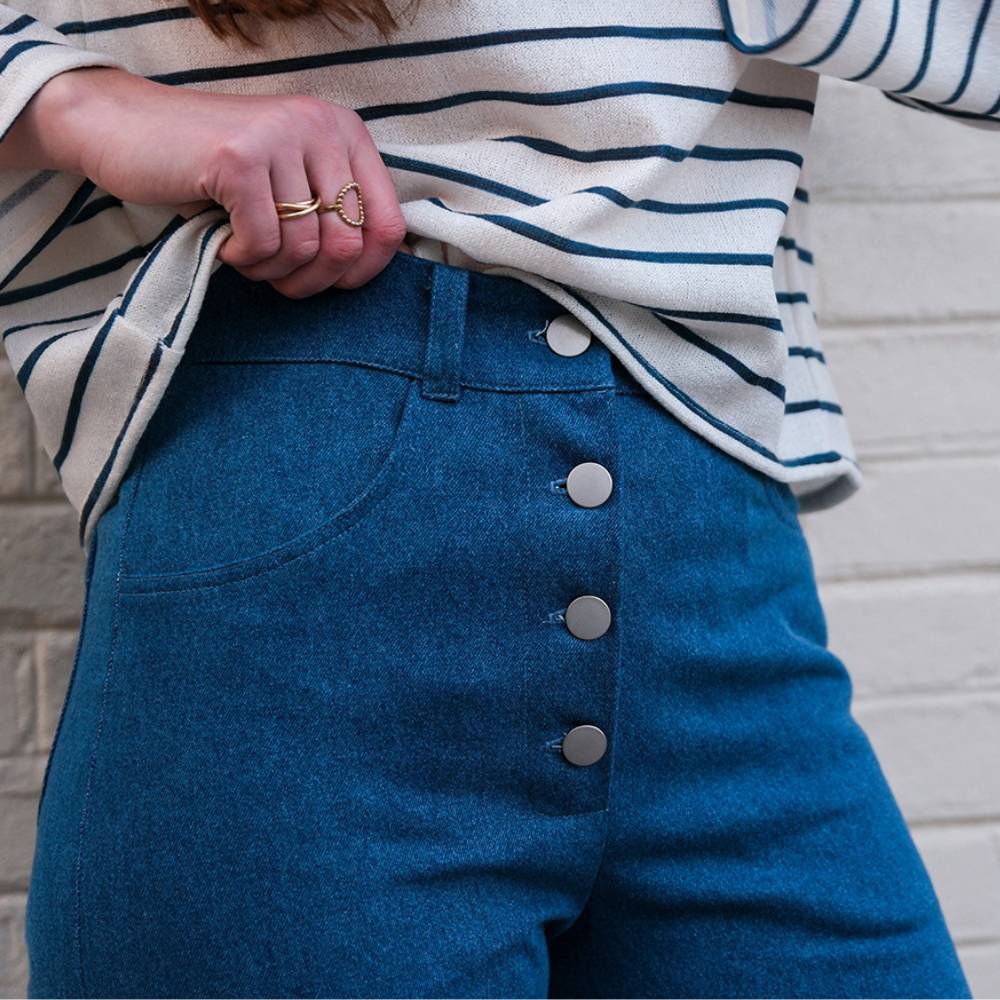 The Oxane trousers sewing pattern features a flattering fitted waist with a modern flared leg silhouette. Designed to be both stylish and comfortable, these trousers can be worn year-round depending on the fabric you choose.