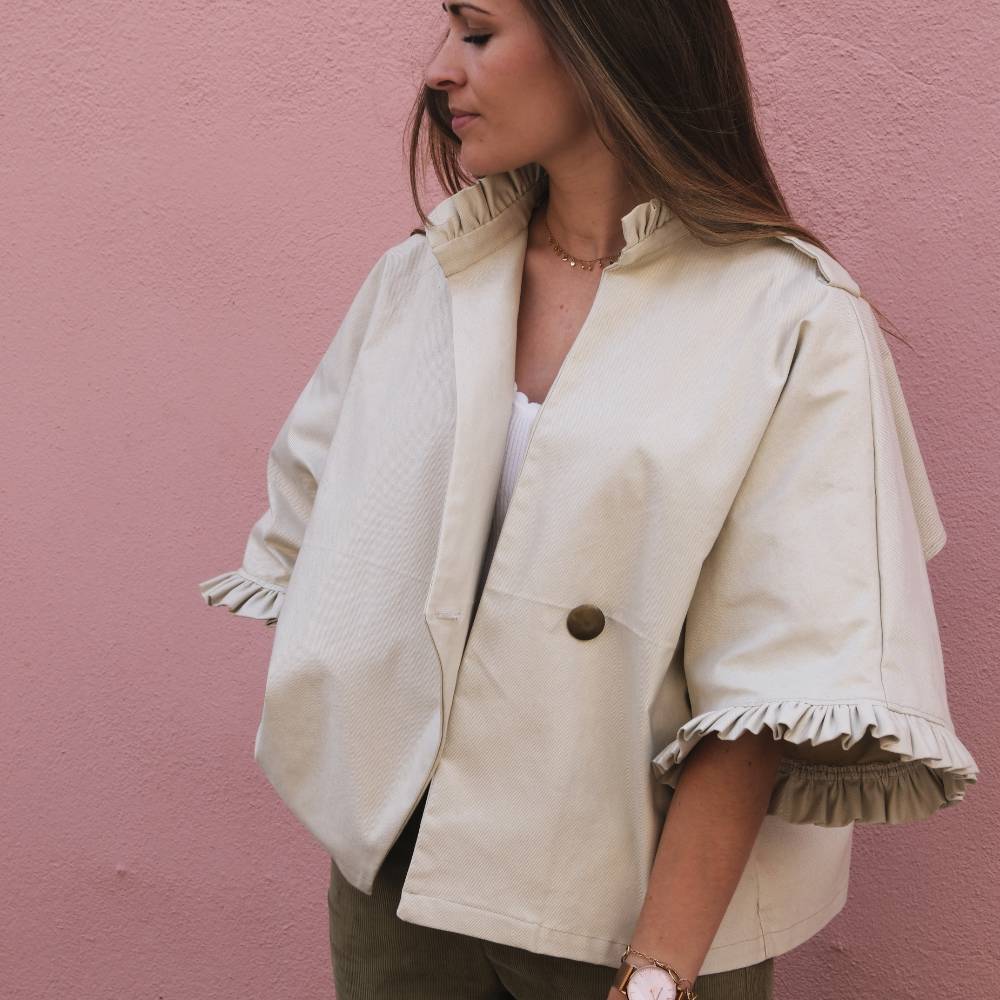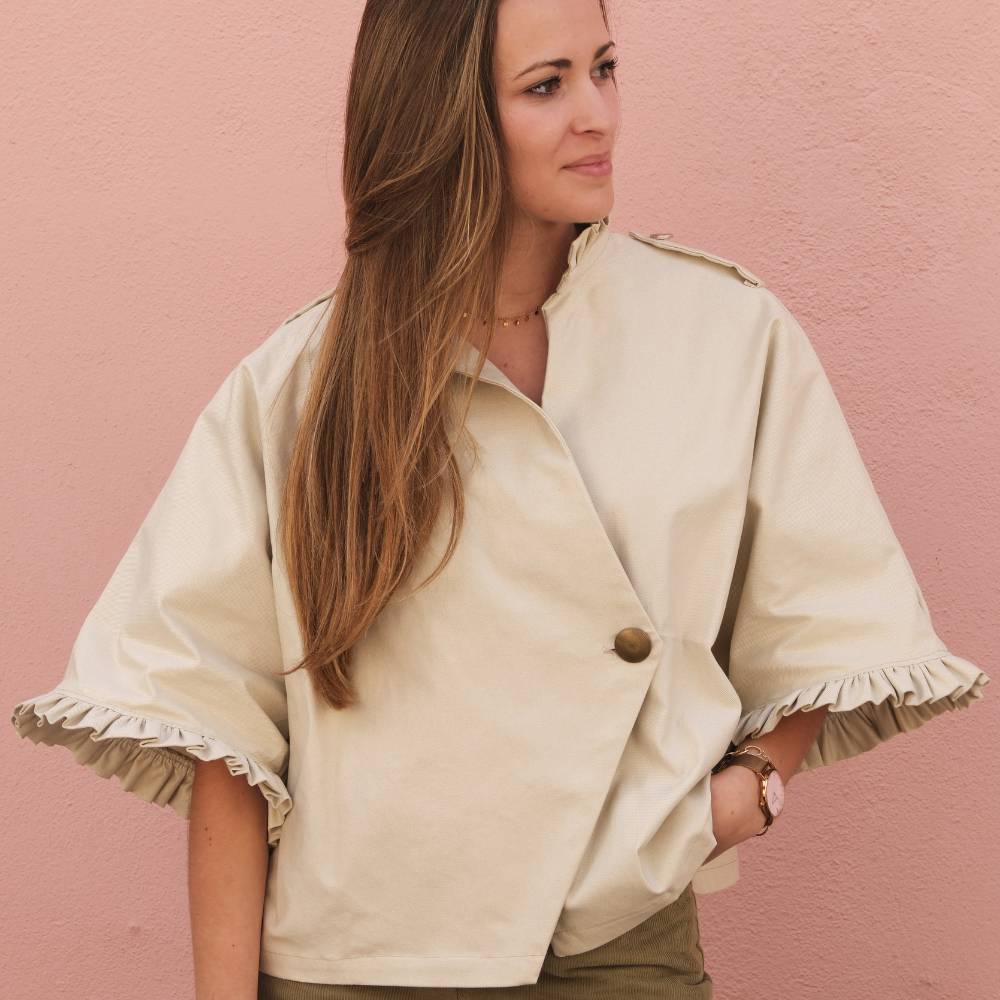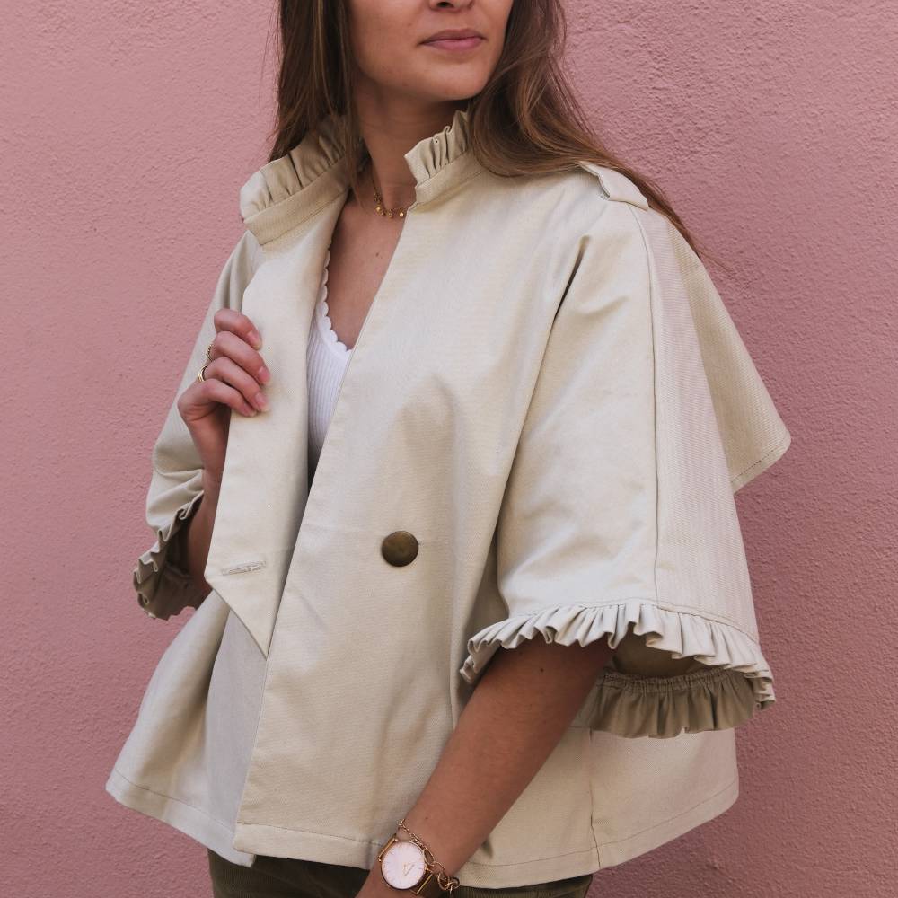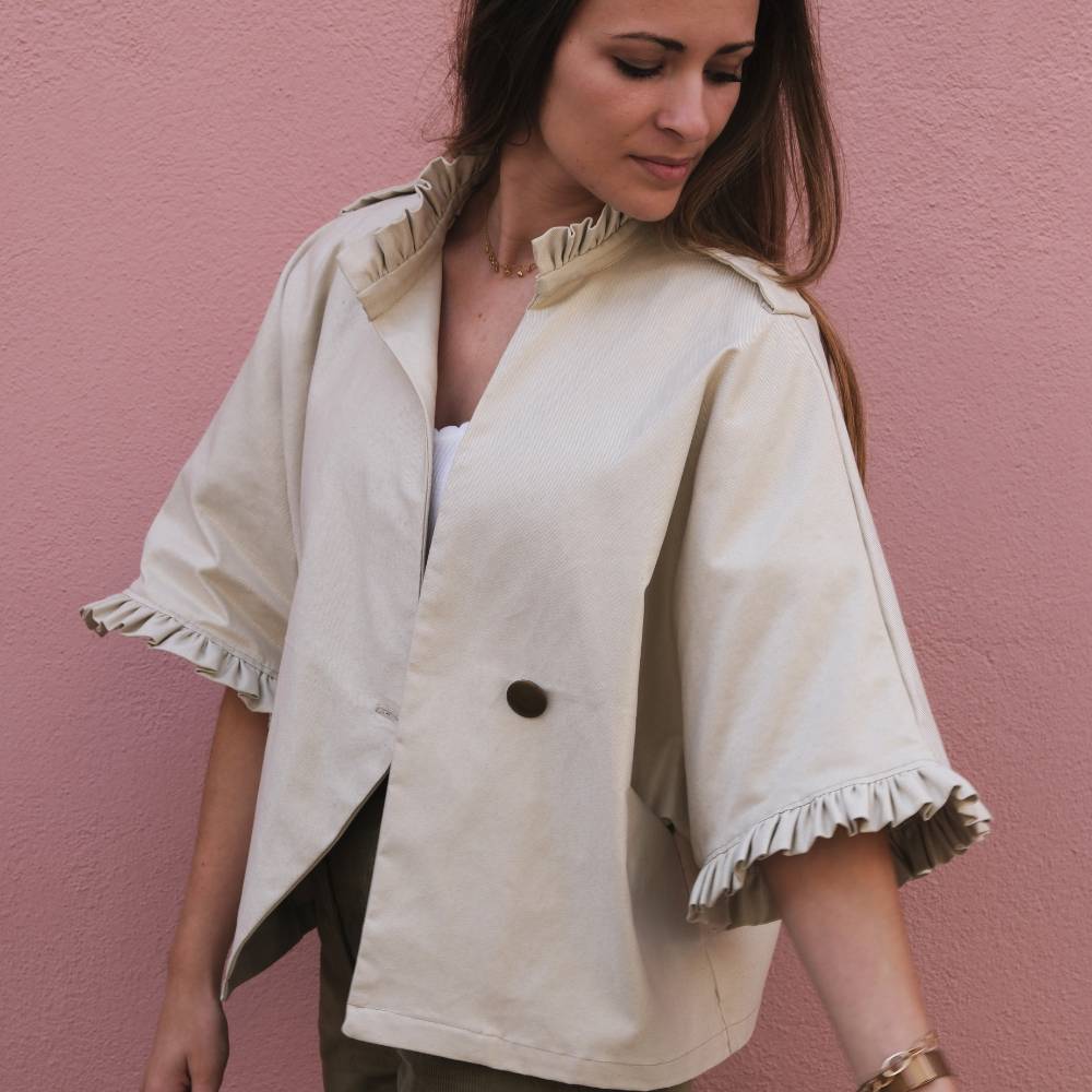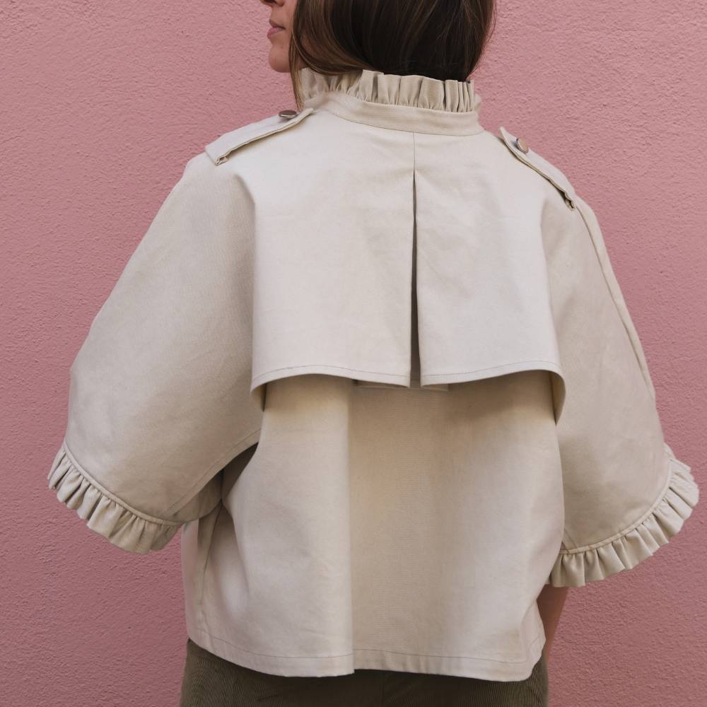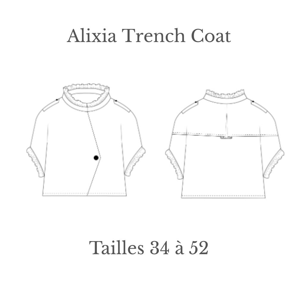 The Alixia Trench Coat is a short trench-style jacket designed to combine comfort with a chic, feminine silhouette. This pattern offers refined details while remaining practical to sew and wear.