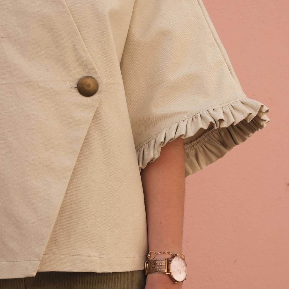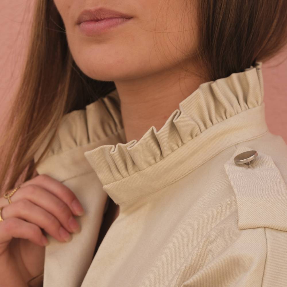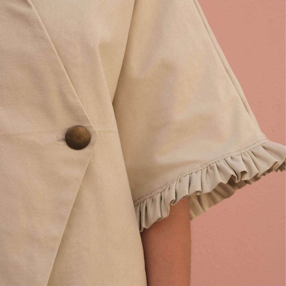 Alixia features an adjustable front closure, allowing the fit to be customized. Buttoned shoulder straps echo the front button, creating visual balance and a classic trench-inspired look. The collar and 3/4-length sleeves are finished with a delicate ruffle, adding a subtle touch of originality and movement.