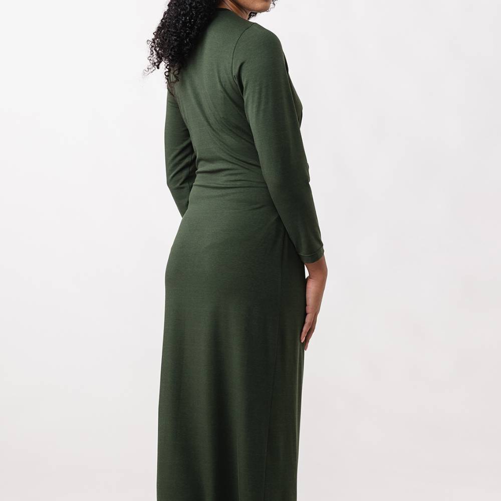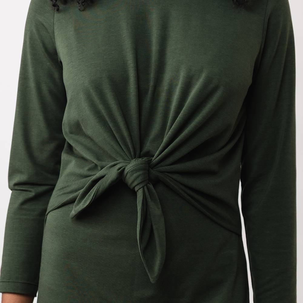 The dress features a double-layered front bodice with delicate ties that create soft gathering at the waist. The front skirt continues underneath the bodice without being attached at the waist, making this design especially practical for breastfeeding-friendly garments.