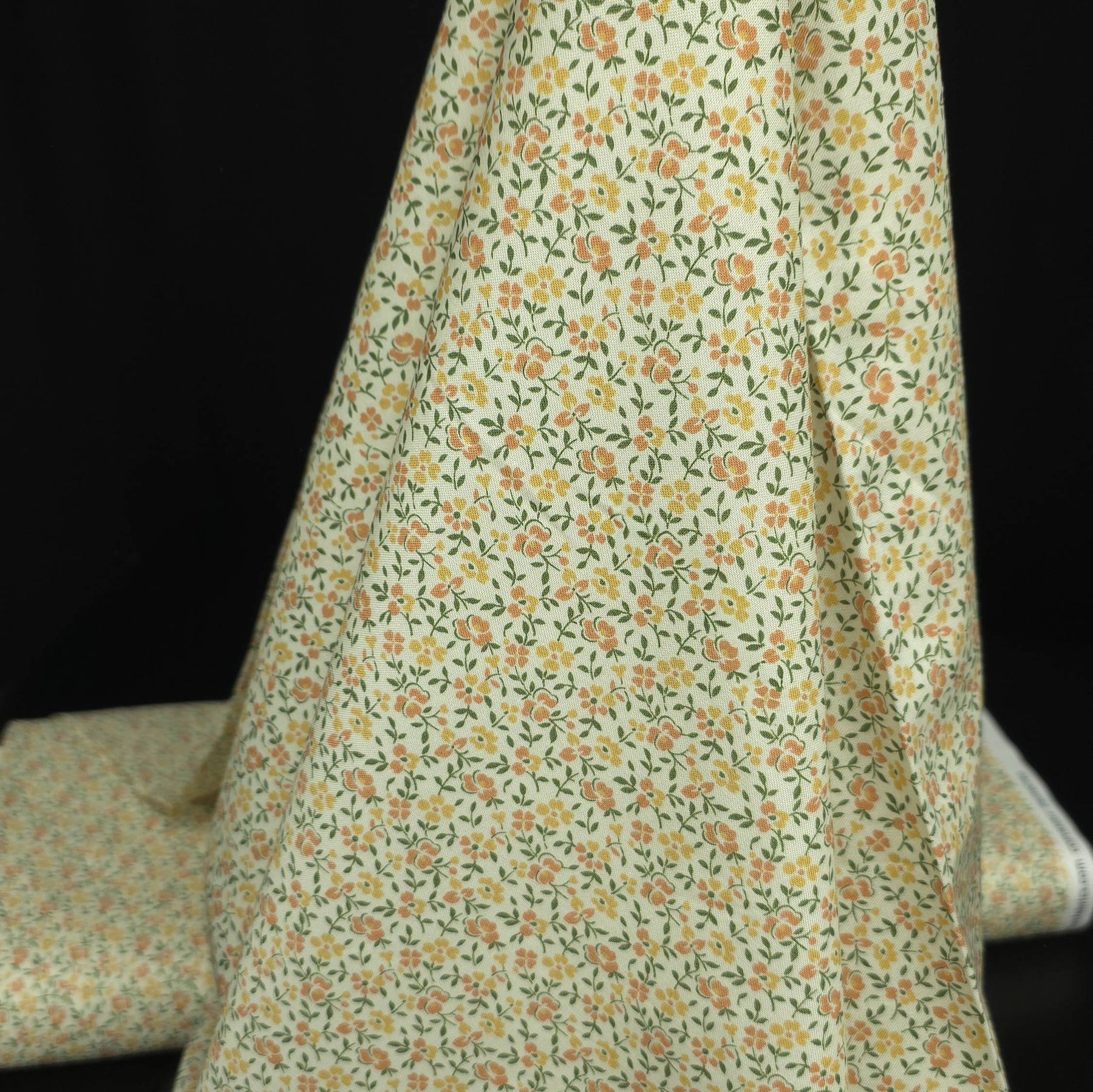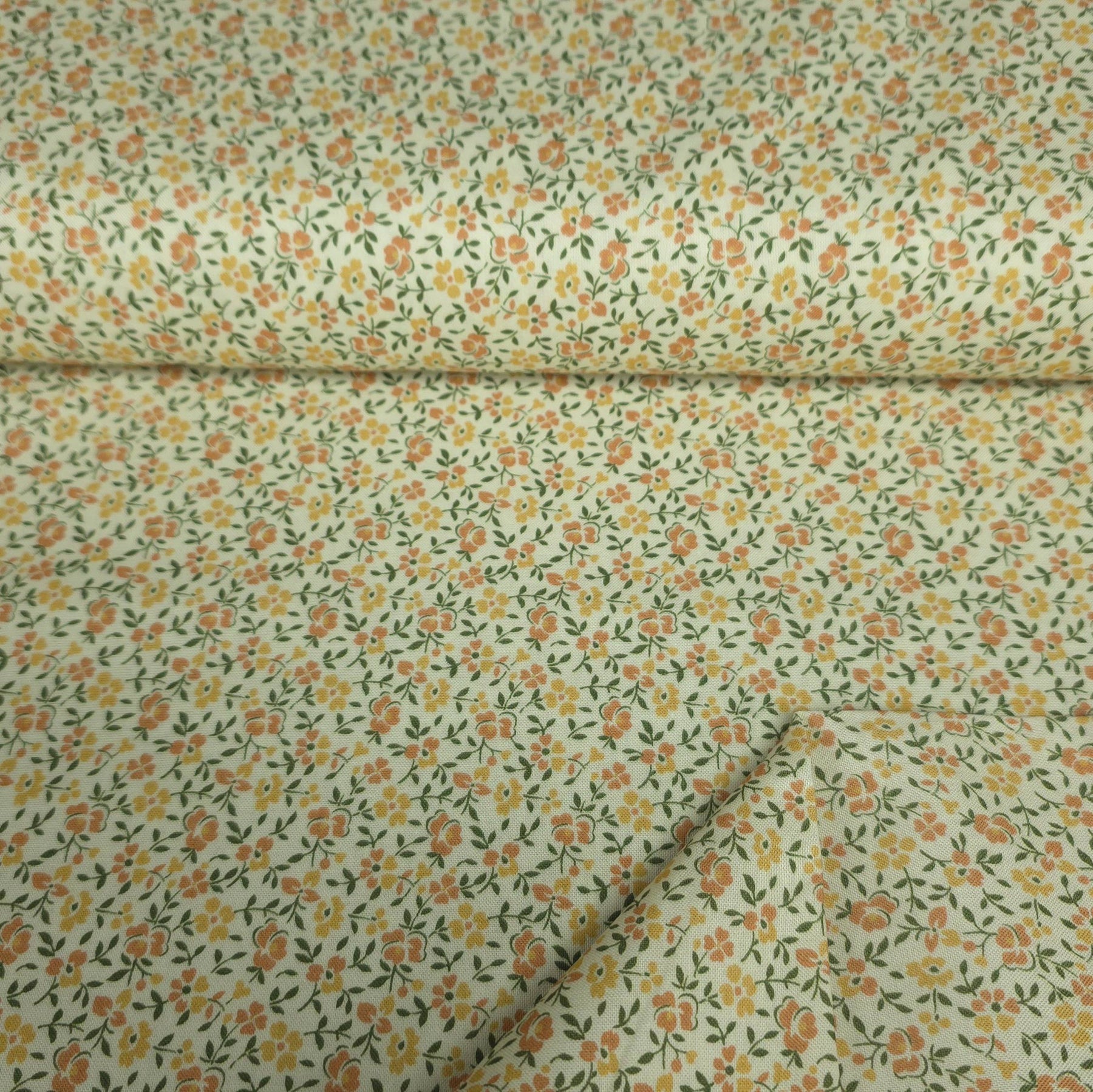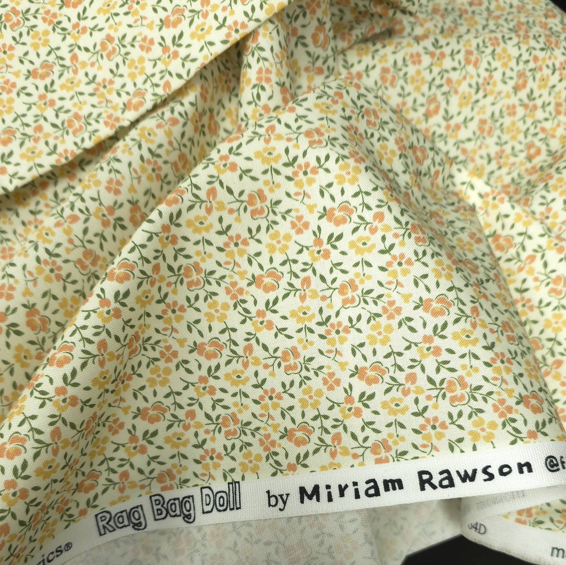 This delicate floral fabric from the Rag Bag Doll collection by Marcus Fabrics features a charming vintage-inspired print in warm peach, soft yellow and sage green tones on a light cream background.