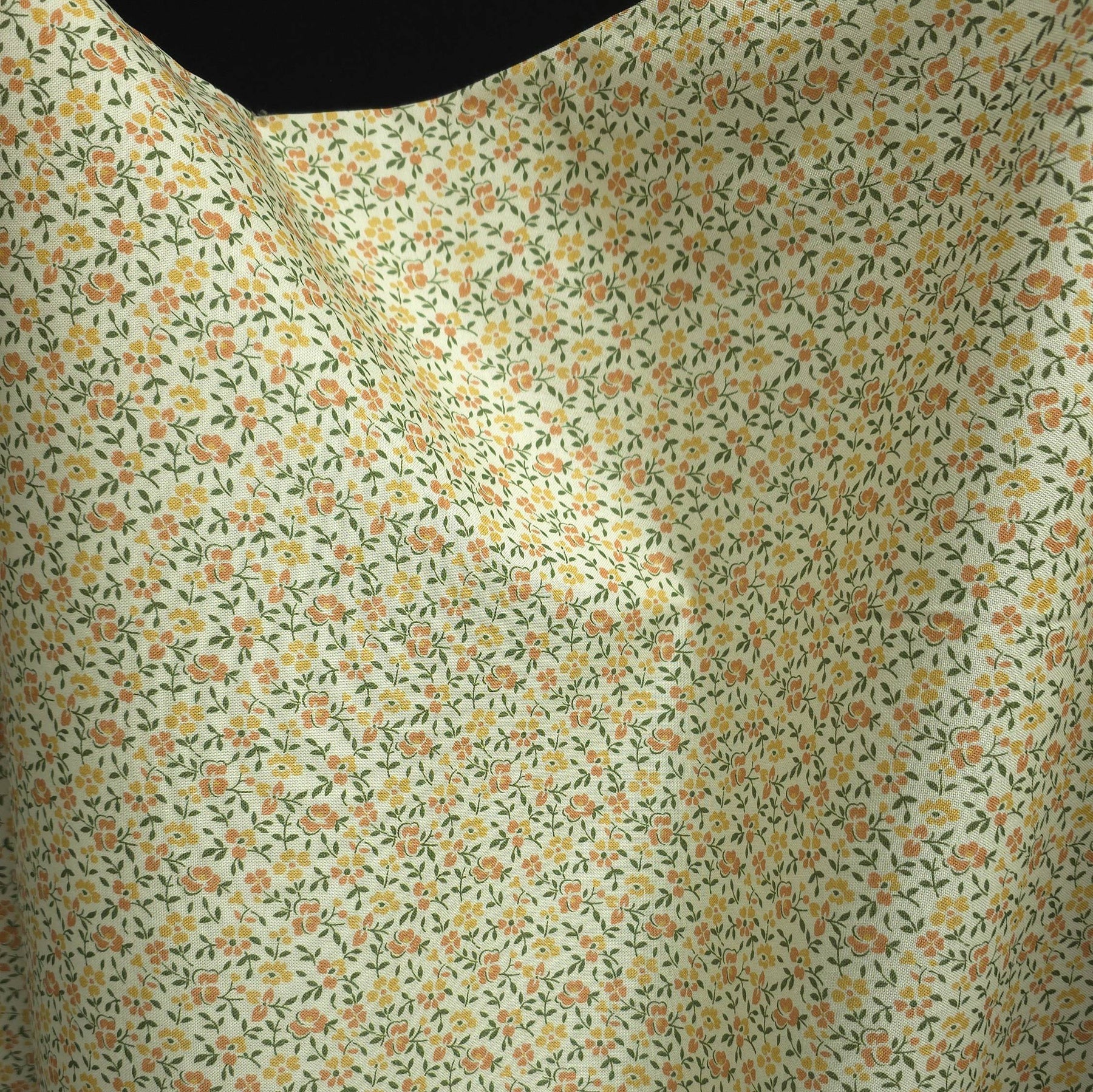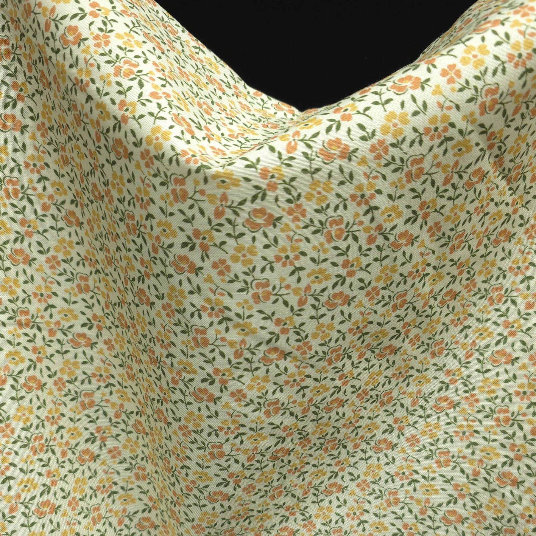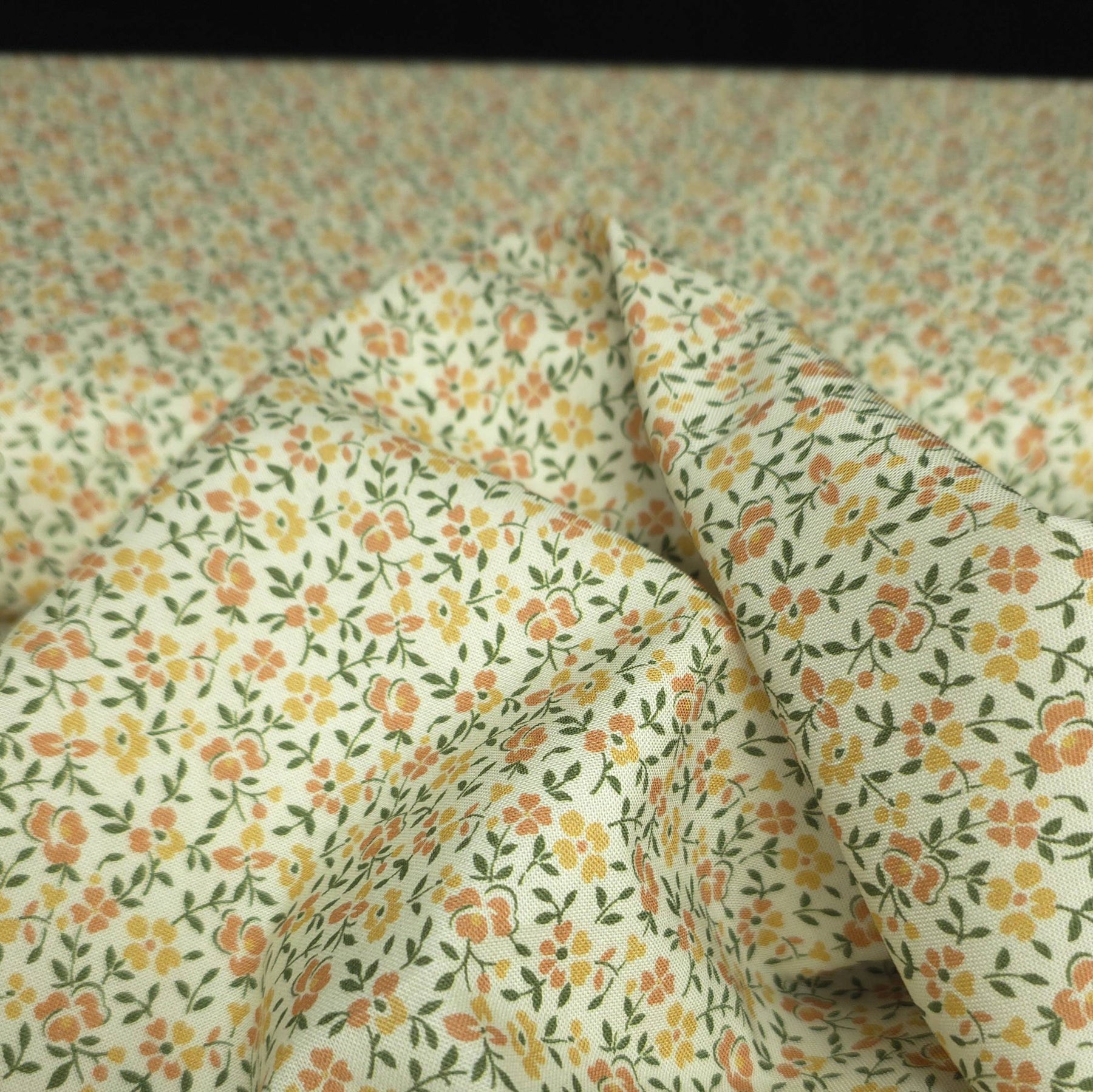 This delicate floral fabric from the Rag Bag Doll collection by Marcus Fabrics features a charming vintage-inspired print in warm peach, soft yellow and sage green tones on a light cream background.