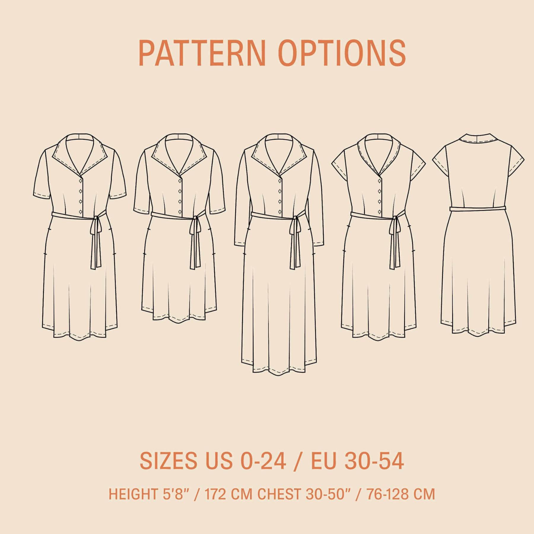 The Marianne Dress is a flattering fitted jersey dress featuring a button-front bodice and an A-line skirt. Designed for comfort and shape, it includes darts for a tailored fit and multiple customizable options.