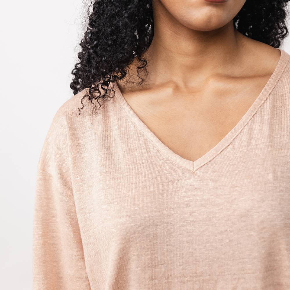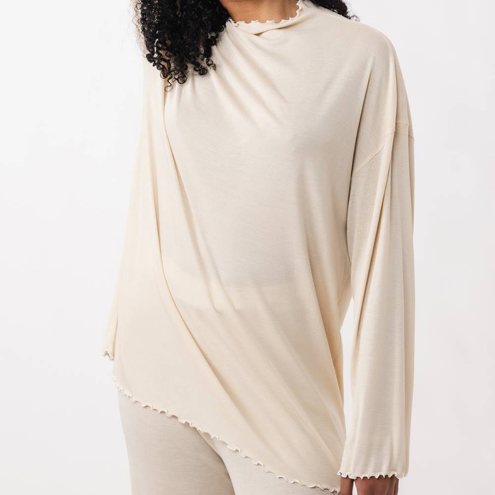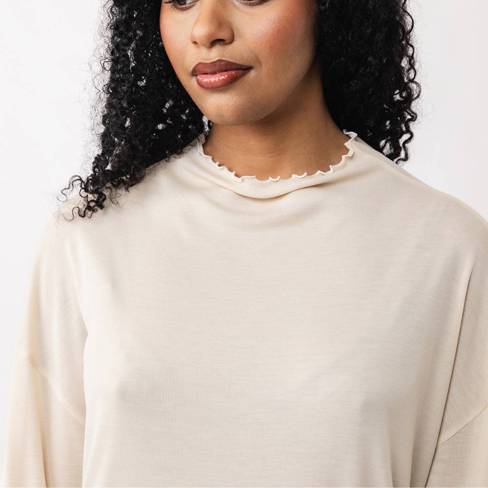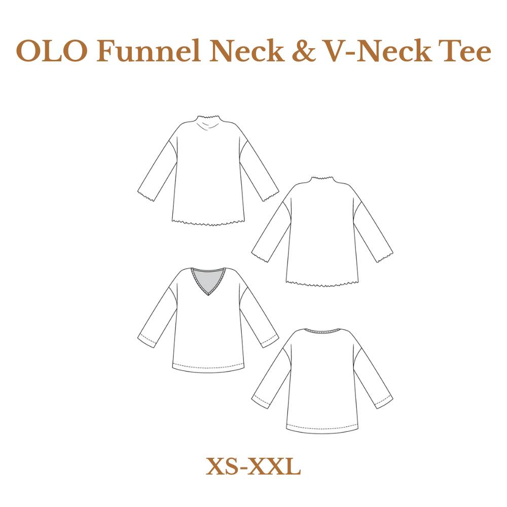 Olo is a relaxed but elegant long sleeve tee. You can sew this easy straight-cut T-shirt as either a dainty rolled-hem funnel neck, or a deep V-neck with binding.
