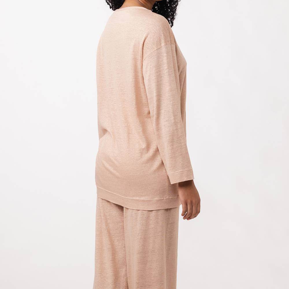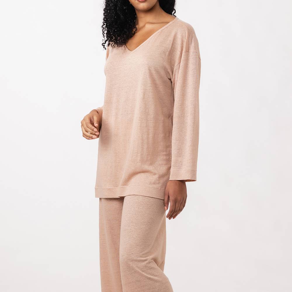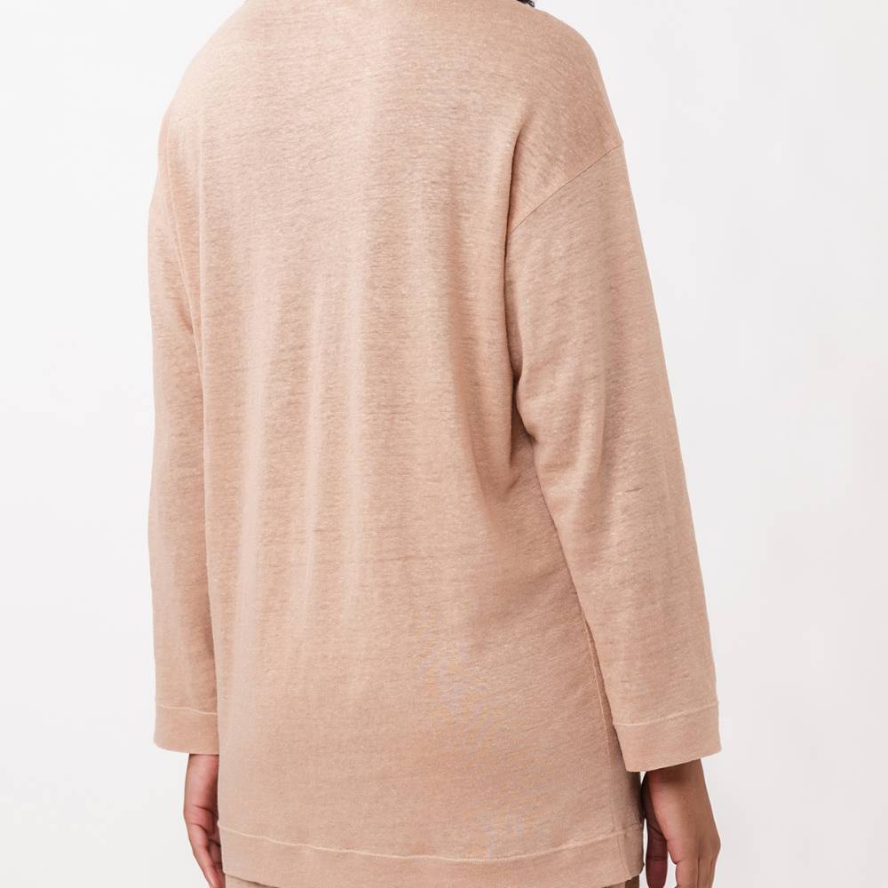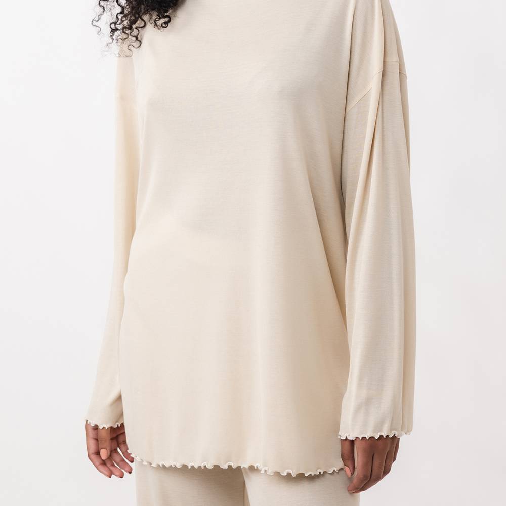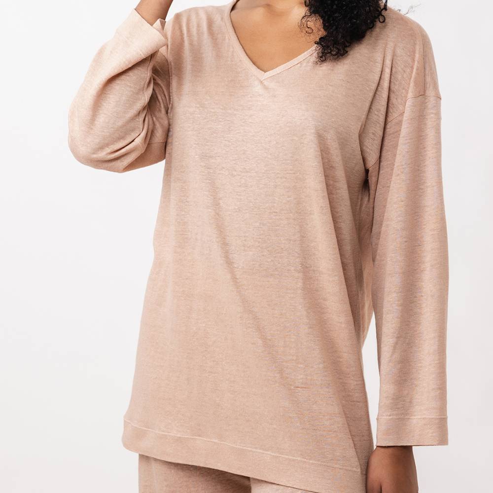 Olo is a relaxed but elegant long sleeve tee. You can sew this easy straight-cut T-shirt as either a dainty rolled-hem funnel neck, or a deep V-neck with binding.