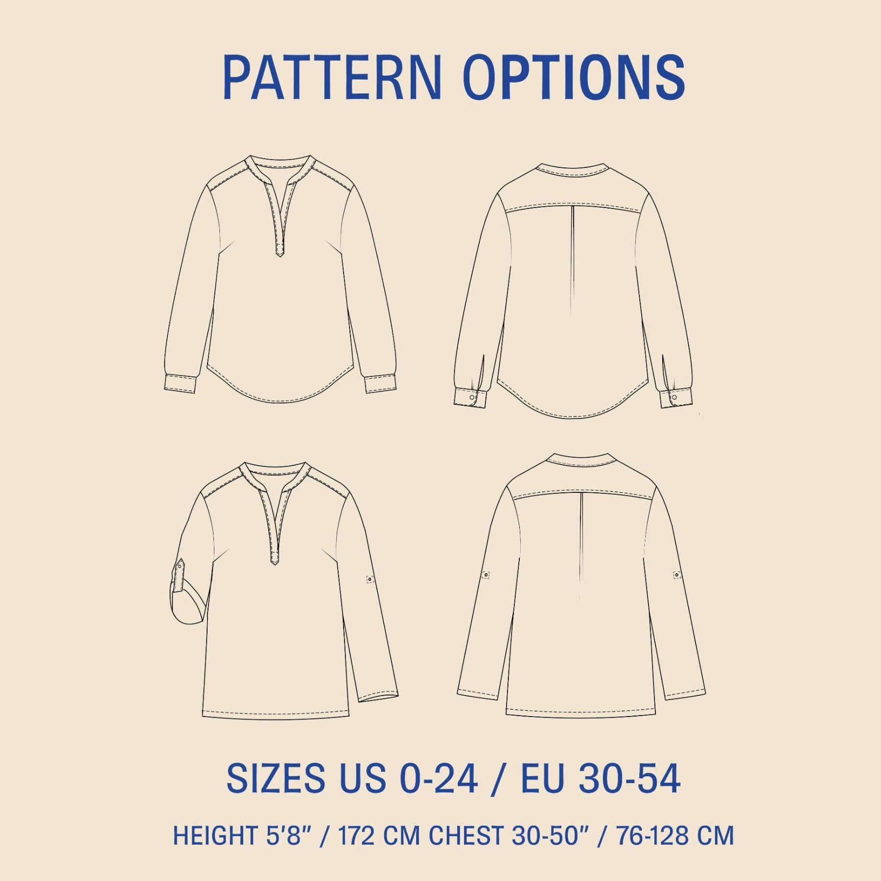 Choose between two body lengths and two sleeve finishes: cuffed sleeves with slit or a simple roll-up sleeve with tab.