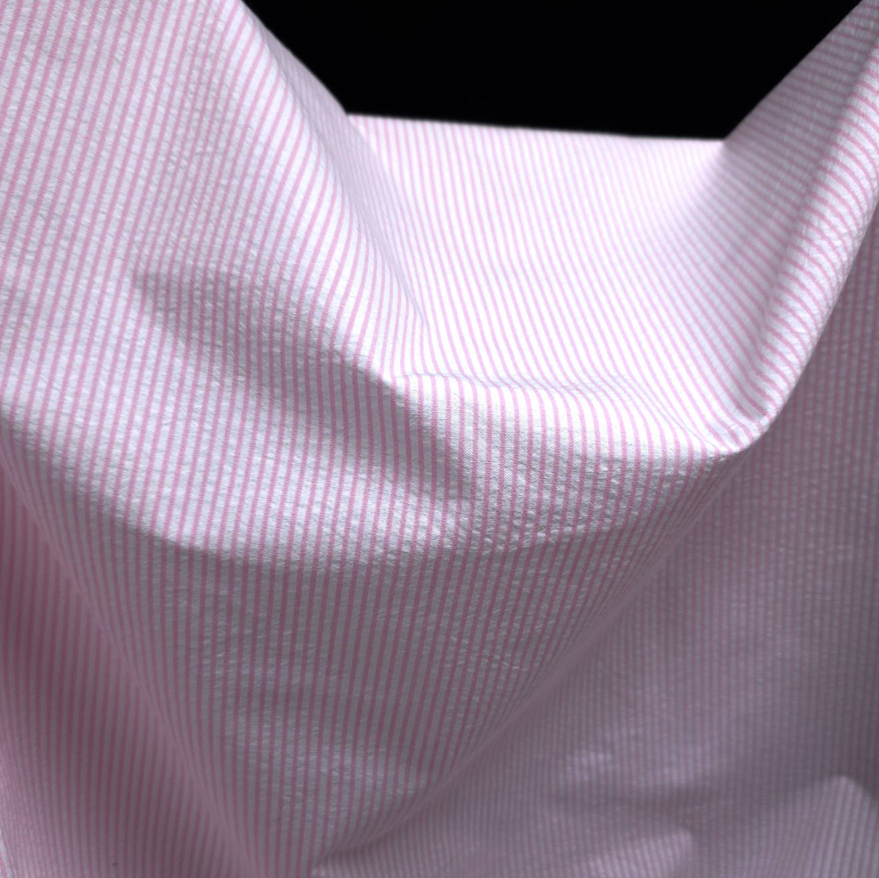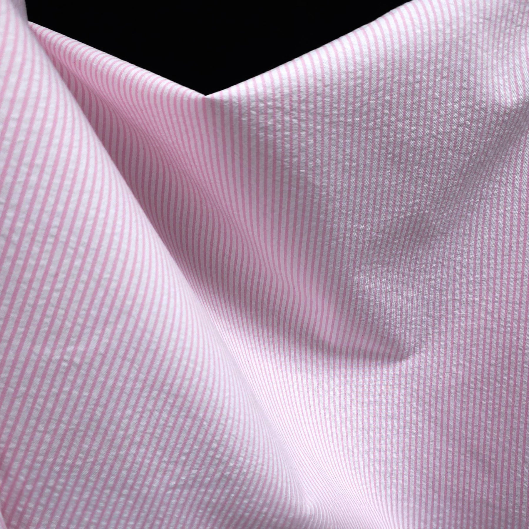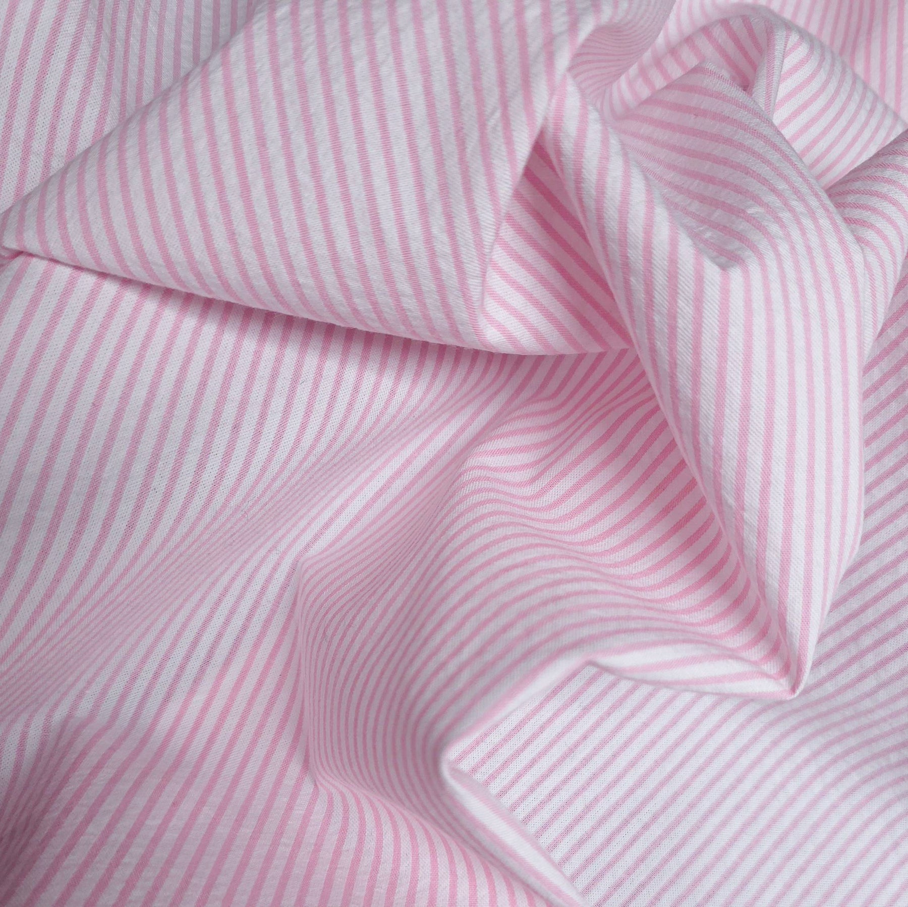 This pink stripe seersucker fabric is a lightweight cotton featuring a delicate textured surface and soft puckered effect. The classic stripe pattern adds a fresh and timeless look, perfect for warm-weather sewing.