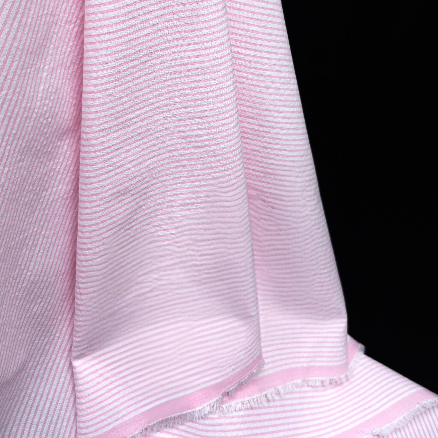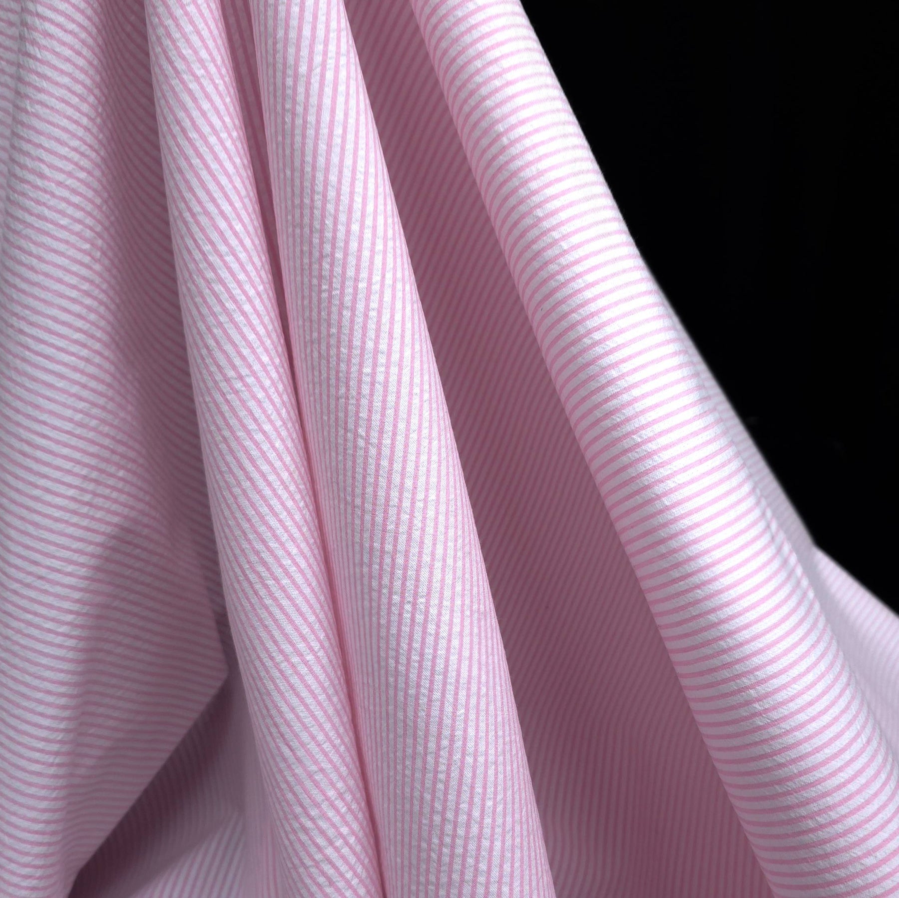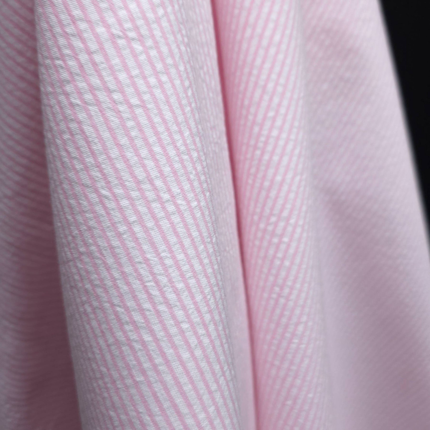 This pink stripe seersucker fabric is a lightweight cotton featuring a delicate textured surface and soft puckered effect. The classic stripe pattern adds a fresh and timeless look, perfect for warm-weather sewing.