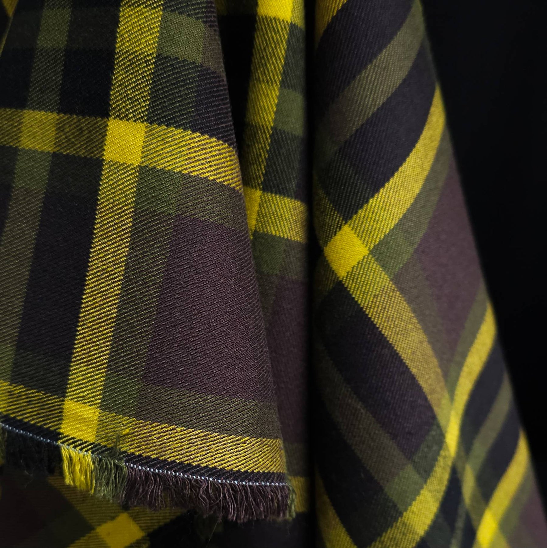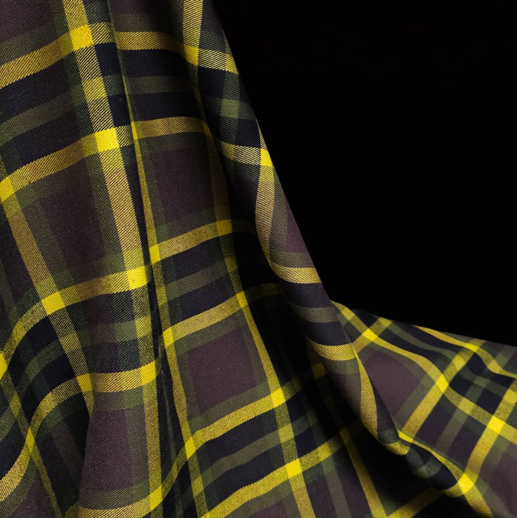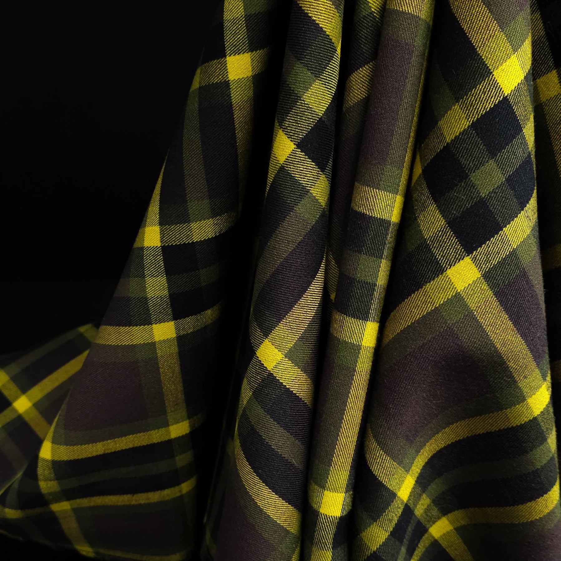 This poly viscose twill features a striking plaid pattern in rich tones of yellow, olive, and deep purple. The fabric has a soft hand with a beautiful drape while still offering enough structure for tailored garments.