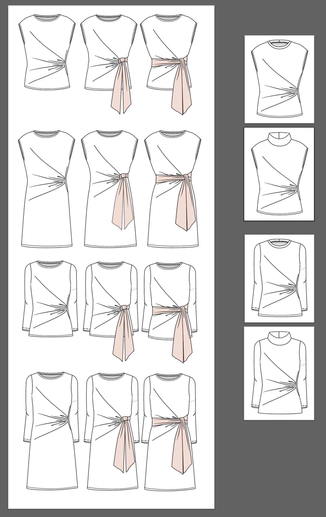 Choose between a top or dress length, two sleeve styles, and multiple tie options to create a garment that works year-round. With 54 possible combinations, RACHEL is an excellent wardrobe builder and a great introduction to sewing knit garments.