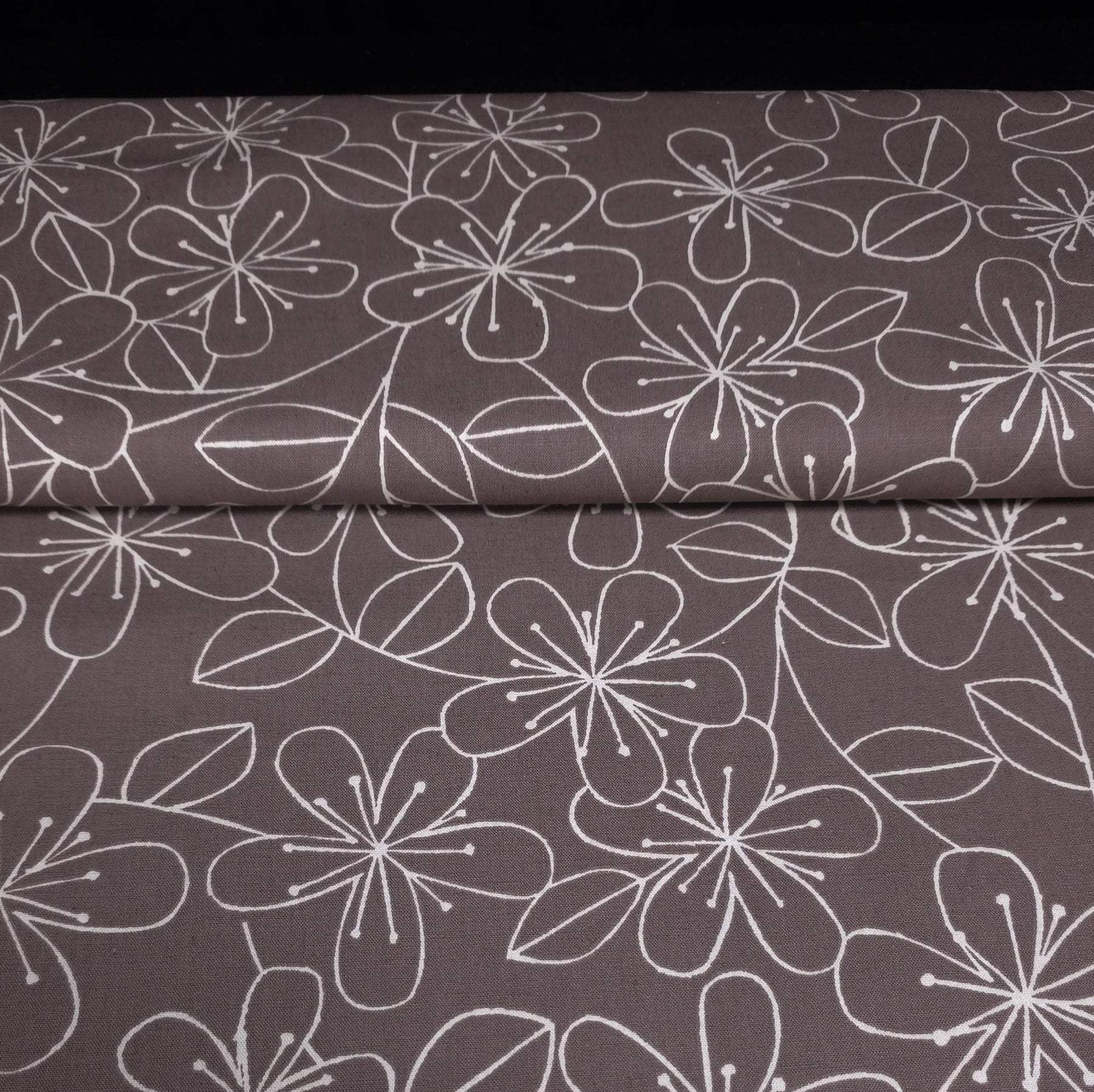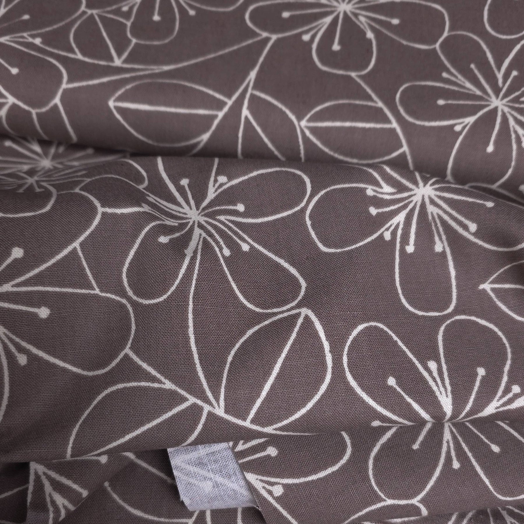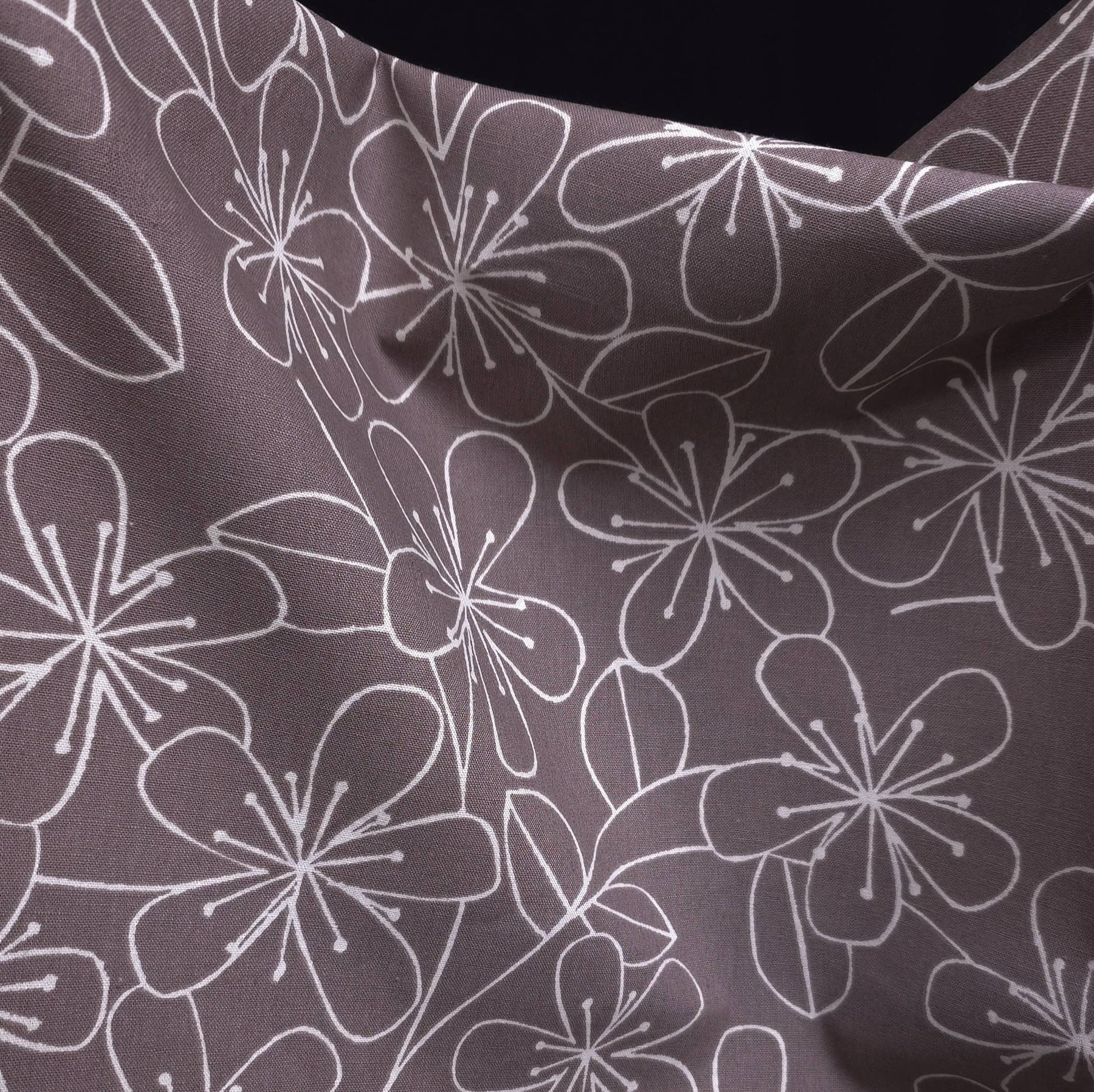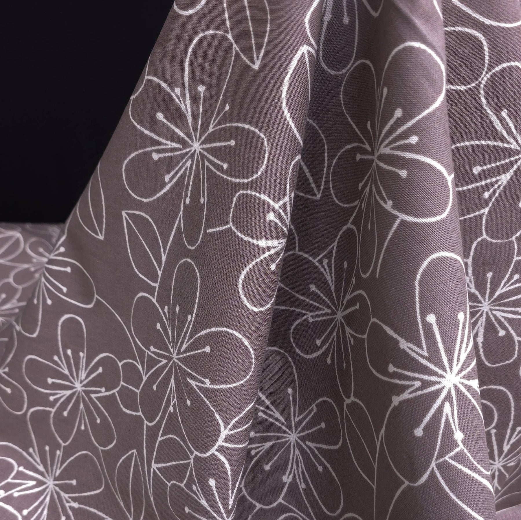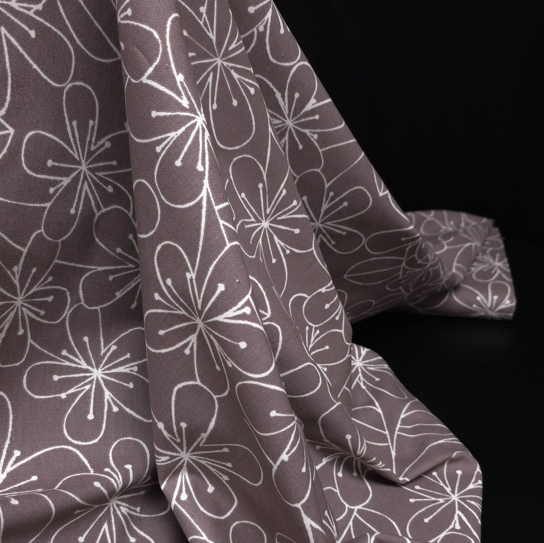 This Japanese canvas fabric from the Sevenberry collection by Robert Kaufman features a delicate floral print on a soft taupe background, offering a refined and timeless aesthetic.