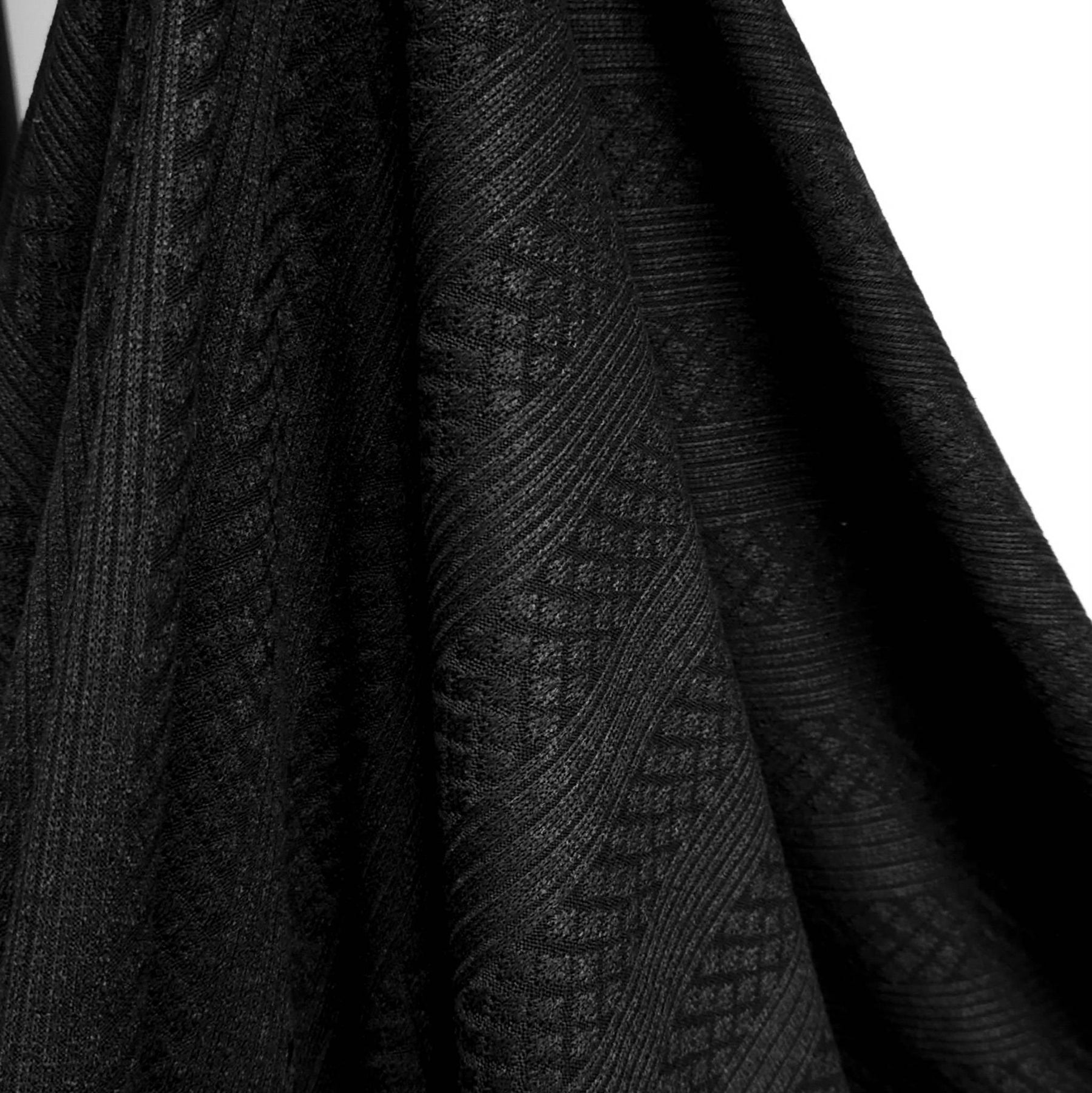 The blend of rayon, polyester, nylon, and elastane provides durability, flexibility, and recovery, making it suitable for both fitted and relaxed silhouettes. With its substantial weight and elegant texture, this fabric transitions effortlessly from everyday wear to statement garments.