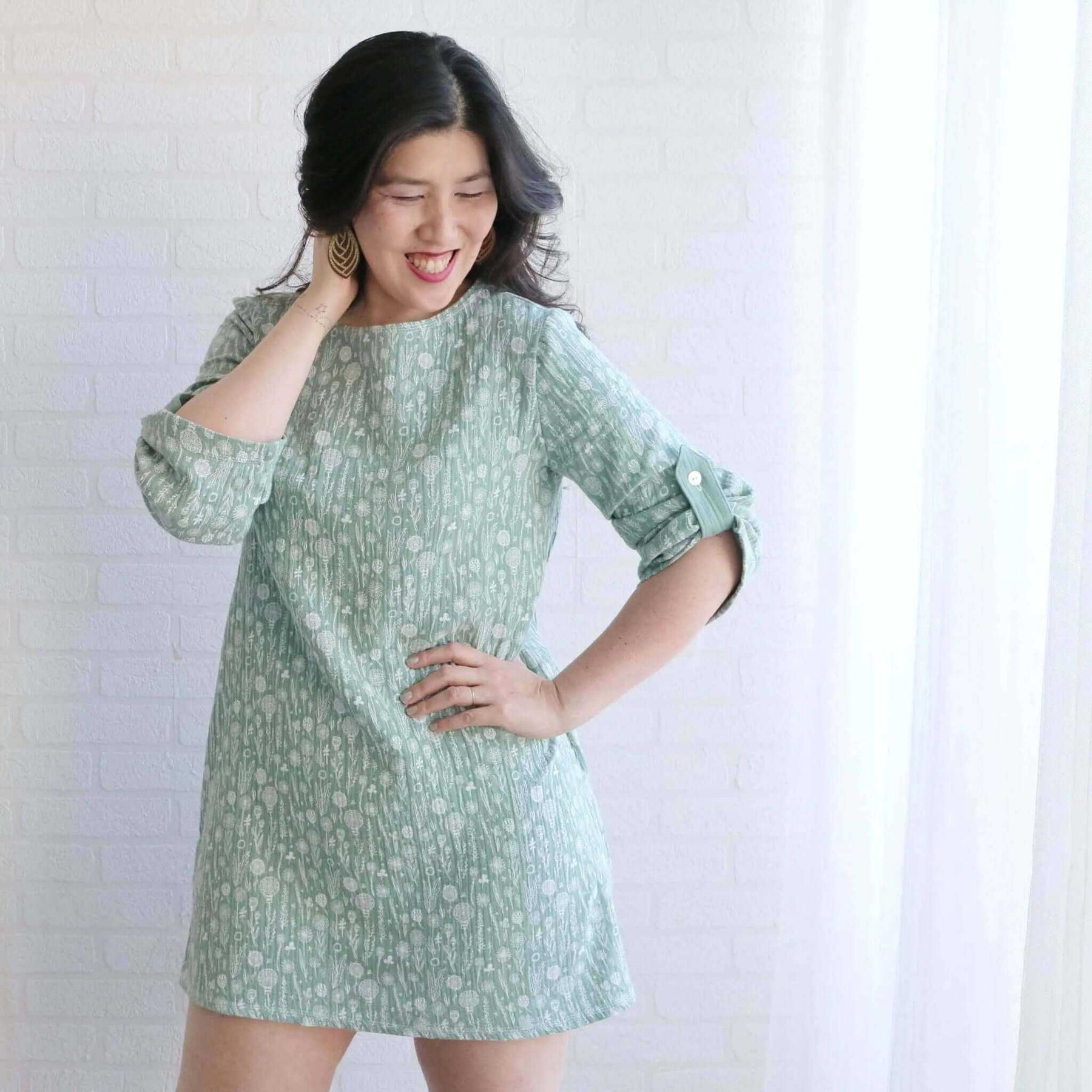 The pattern includes options for both a blouse and a dress. Choose between a clean boat neckline or a round neckline with a button placket. Multiple sleeve variations allow you to customize the look—from straight sleeves in four lengths to fuller sleeves with gathered hems and sleeve tabs.