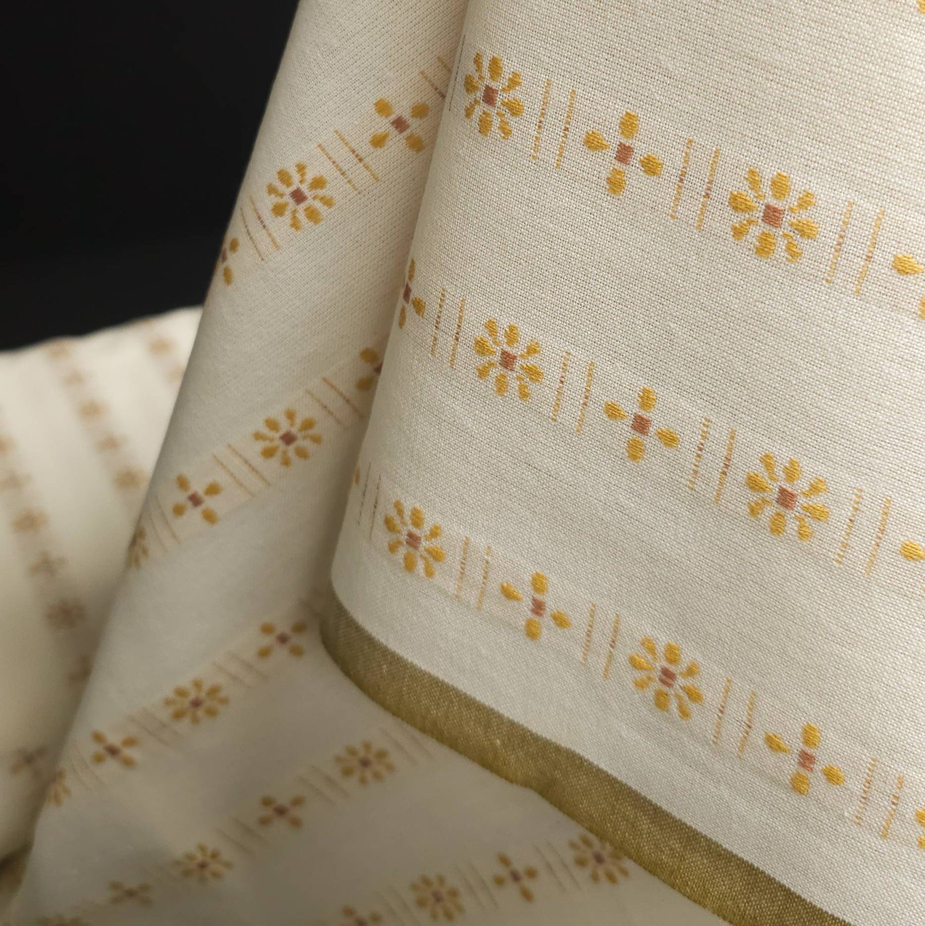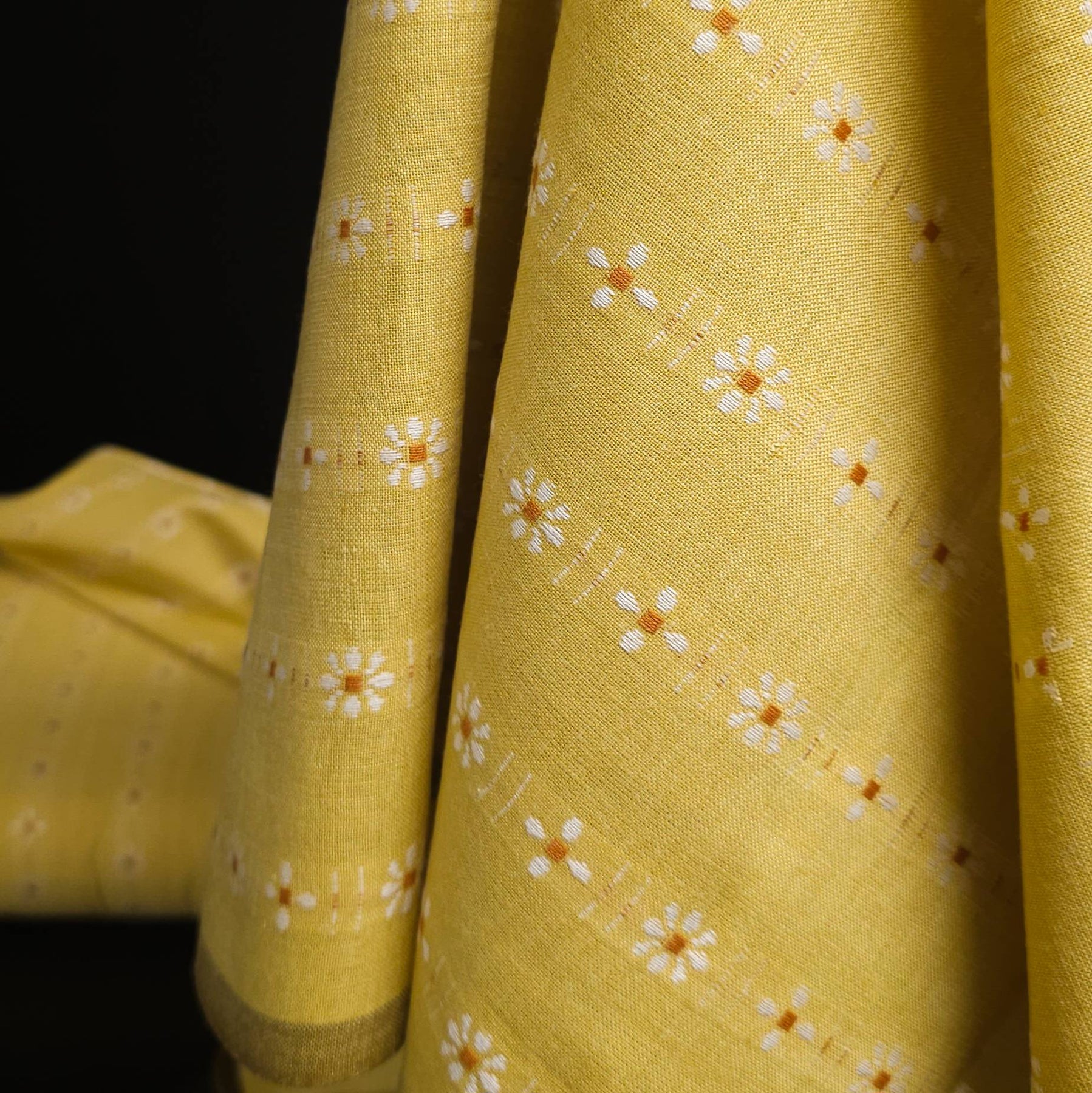 Yarn dyed cotton fabric with small woven daisies in warm golden tones (Welsummer) by Fableism, soft cotton for garments