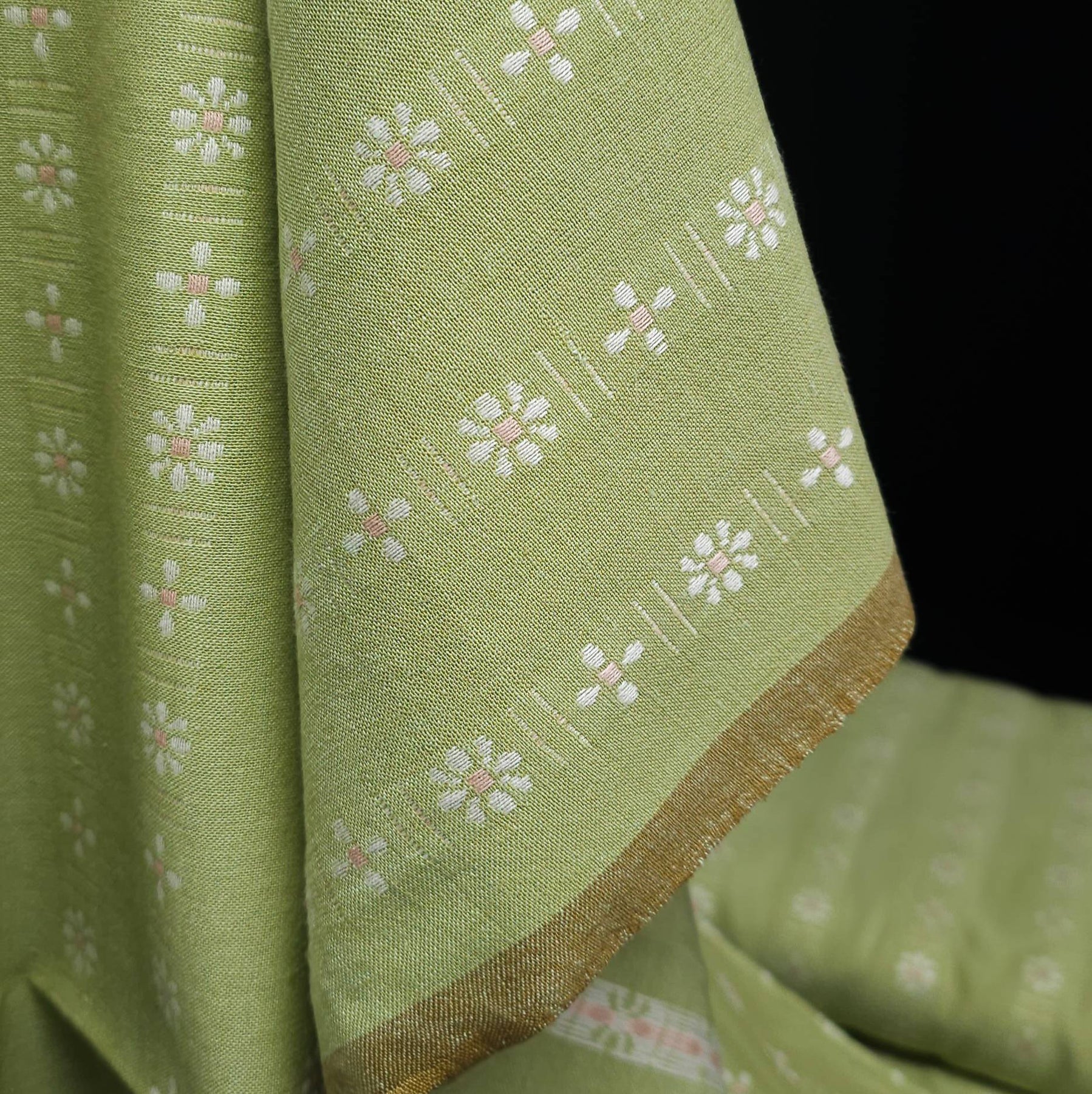 Yarn dyed cotton fabric with small woven daisy pattern in celadon green by Fableism, breathable cotton fabric for shirts and dresses